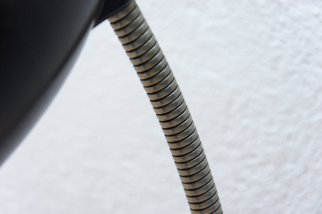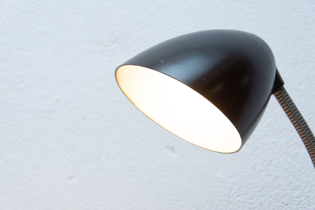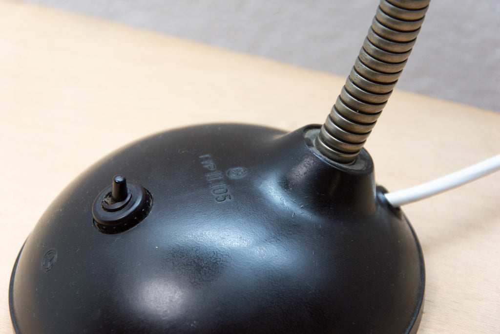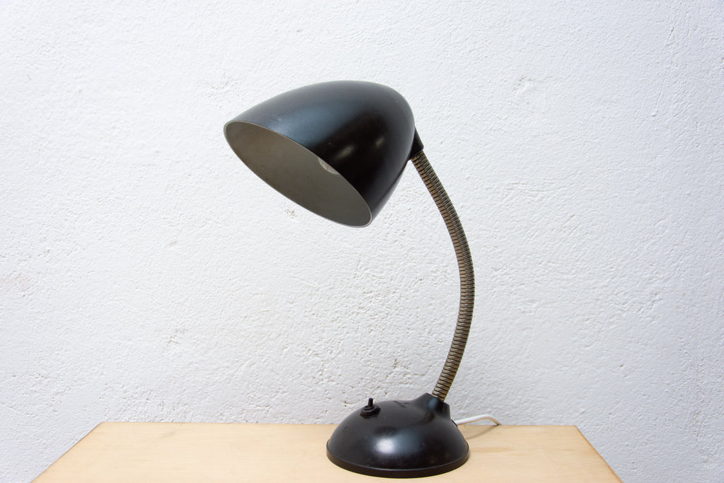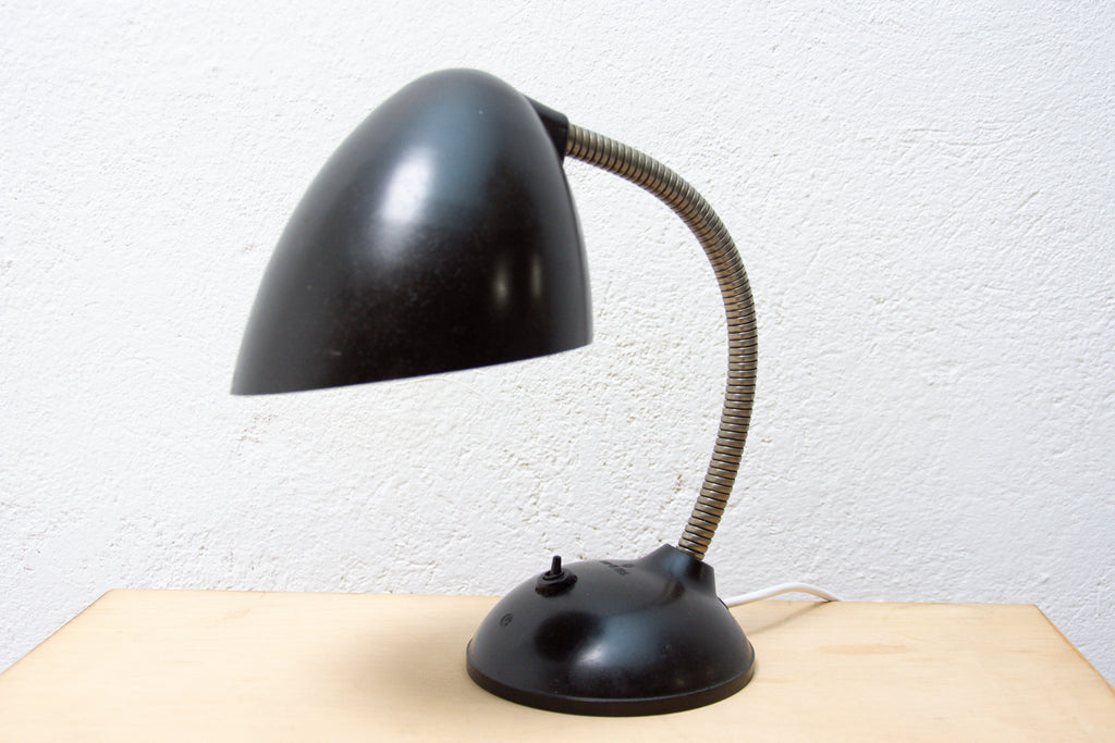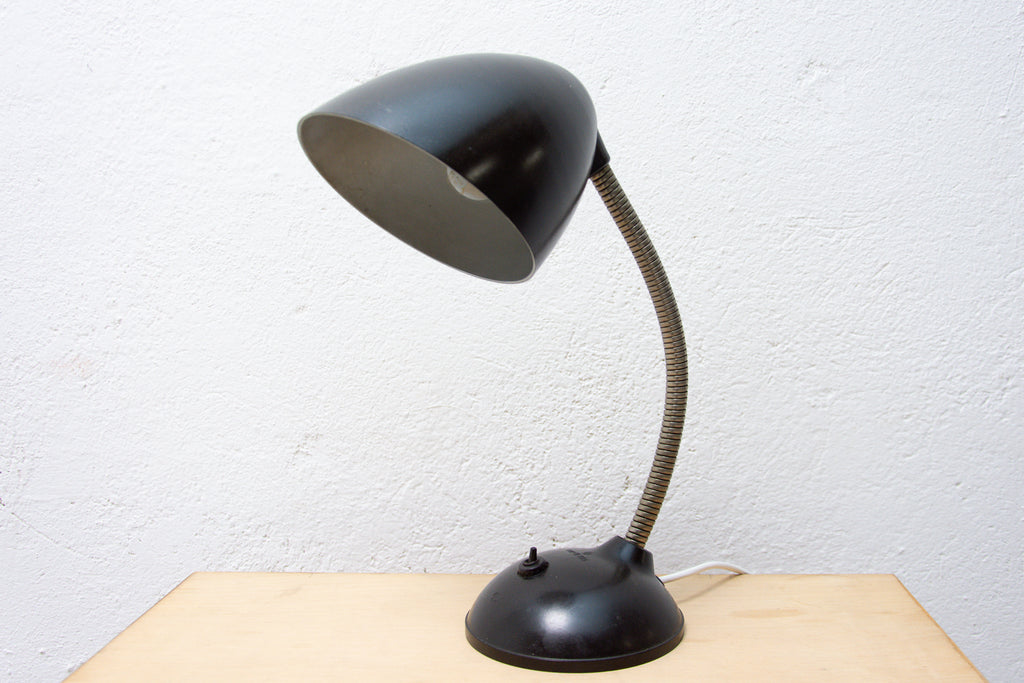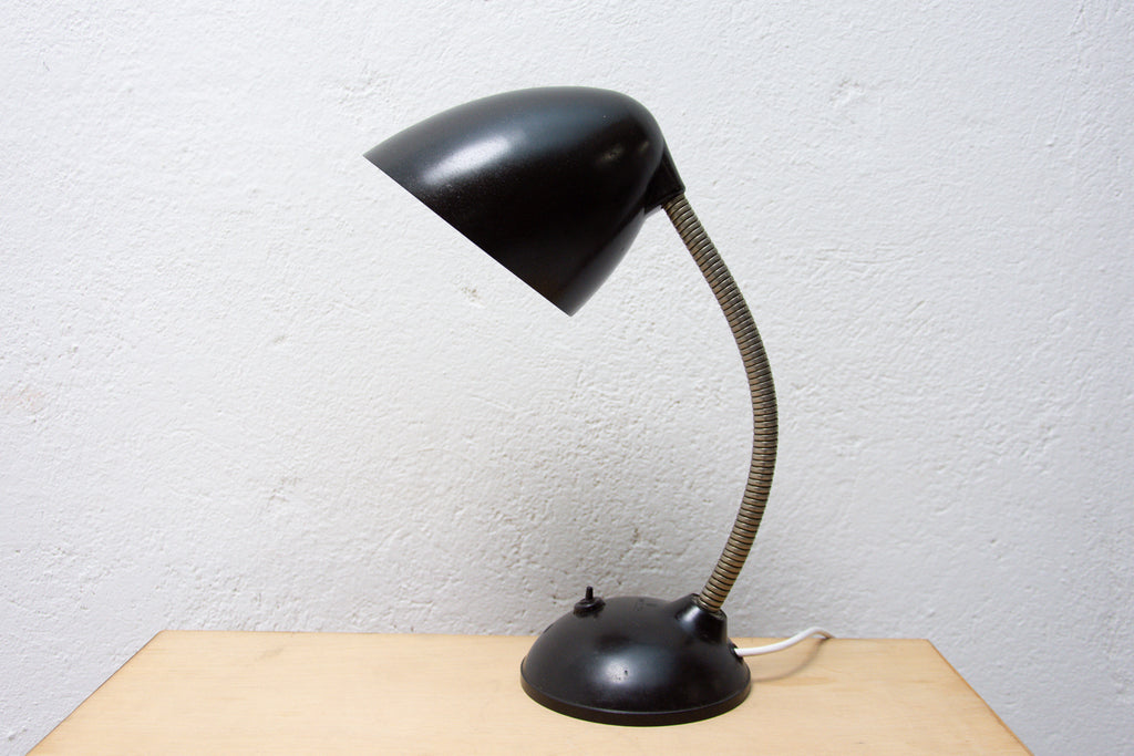 The design of this bakelite table lamp comes from Great Britain. This gooseneck lamp was designed By Eric Kirkman Cole for the Czech republic market.