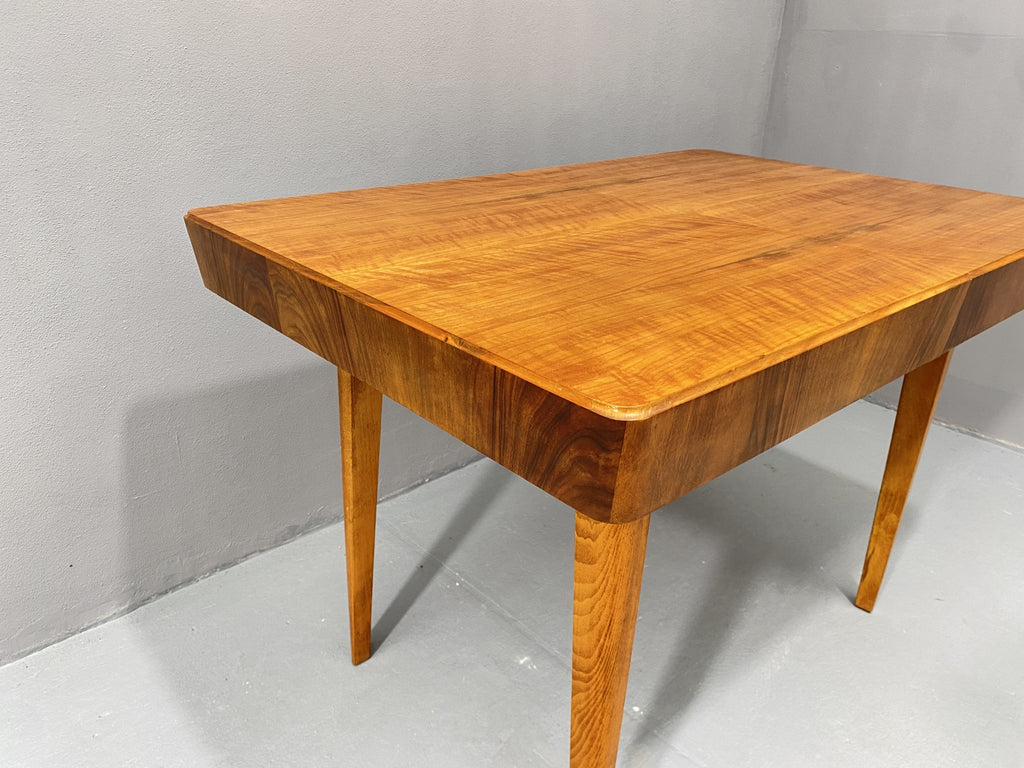 An adjustable mid-century dining table from the 1950s, produced by Setona in former Czechoslovakia. Made of walnut, the table can be easily unfolded and extended from 116 cm to a length of 171 cm.