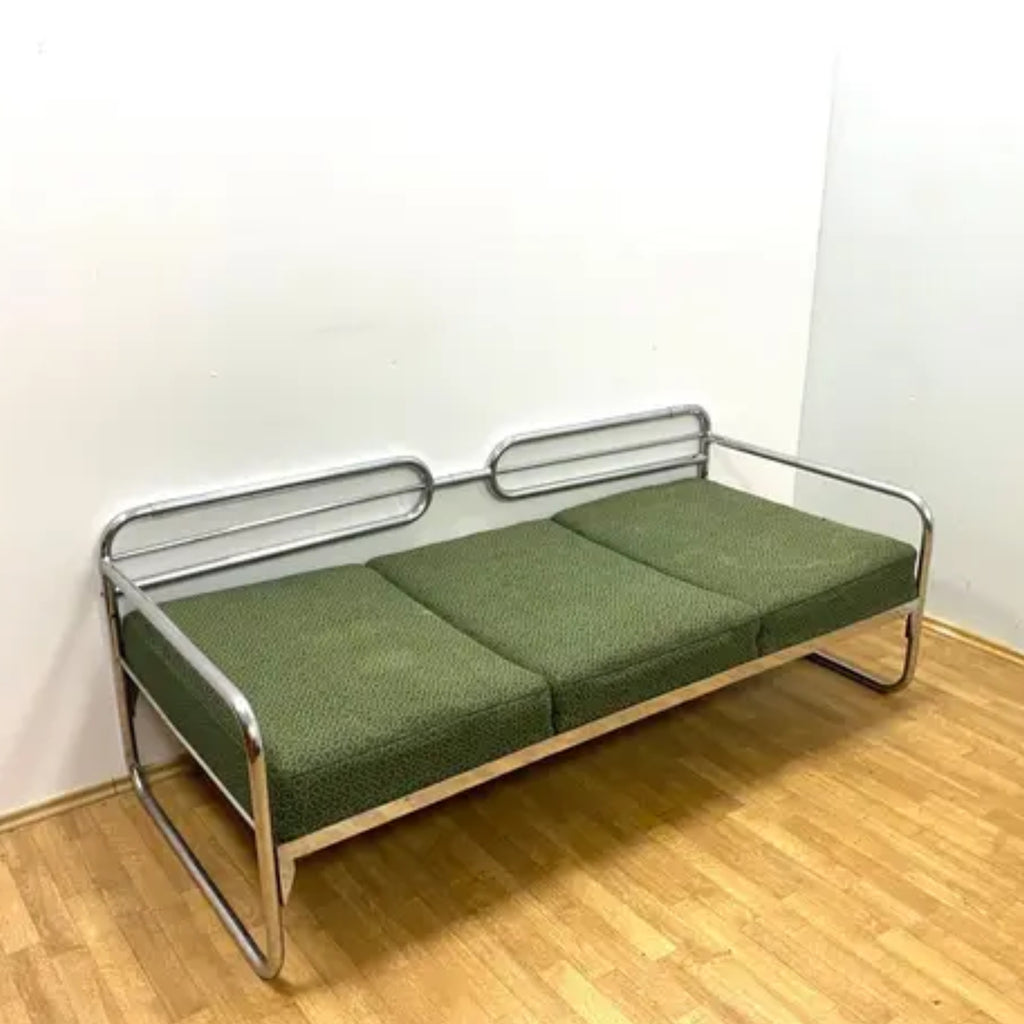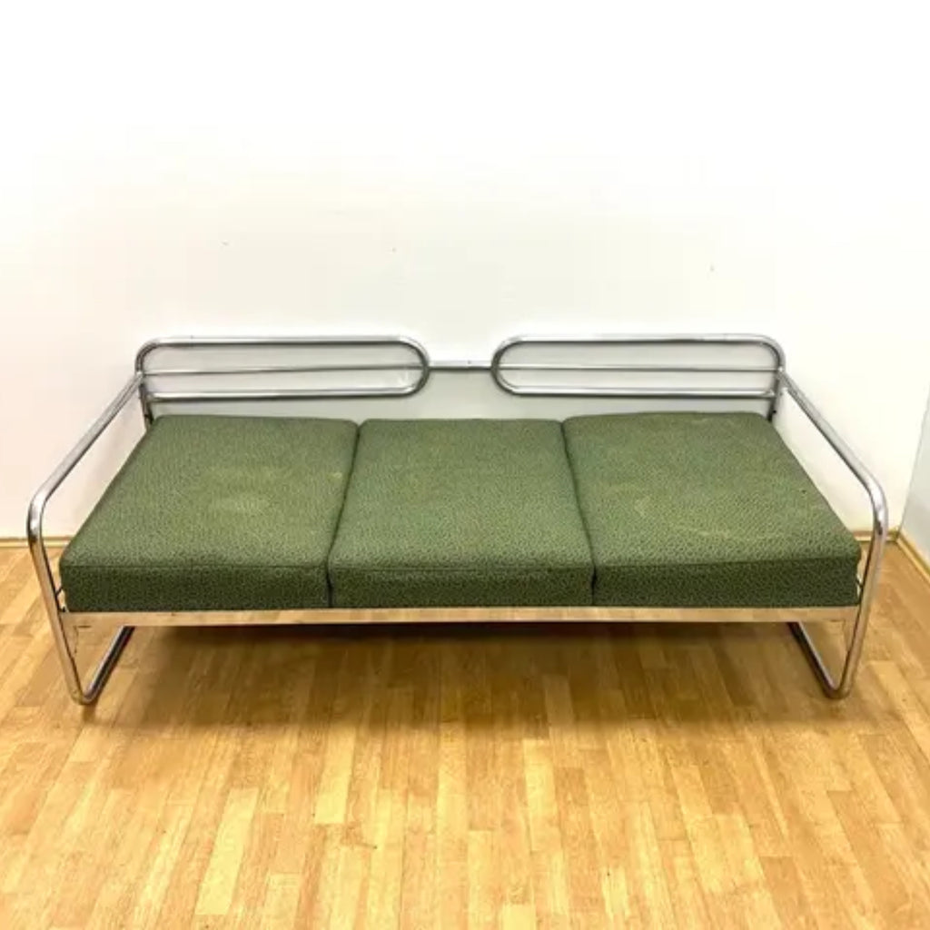 A rare and iconic Bauhaus-style chrome sofa manufactured by the Slezák Company in Czechoslovakia during the 1930s. This authentic pre-war design features a distinctive bent chromed-steel tube frame, wire suspension base, and removable upholstered cushions typical of early European modernism. Its clean geometry, functional elegance, and timeless silhouette make it a significant example of interwar Czechoslovak design.