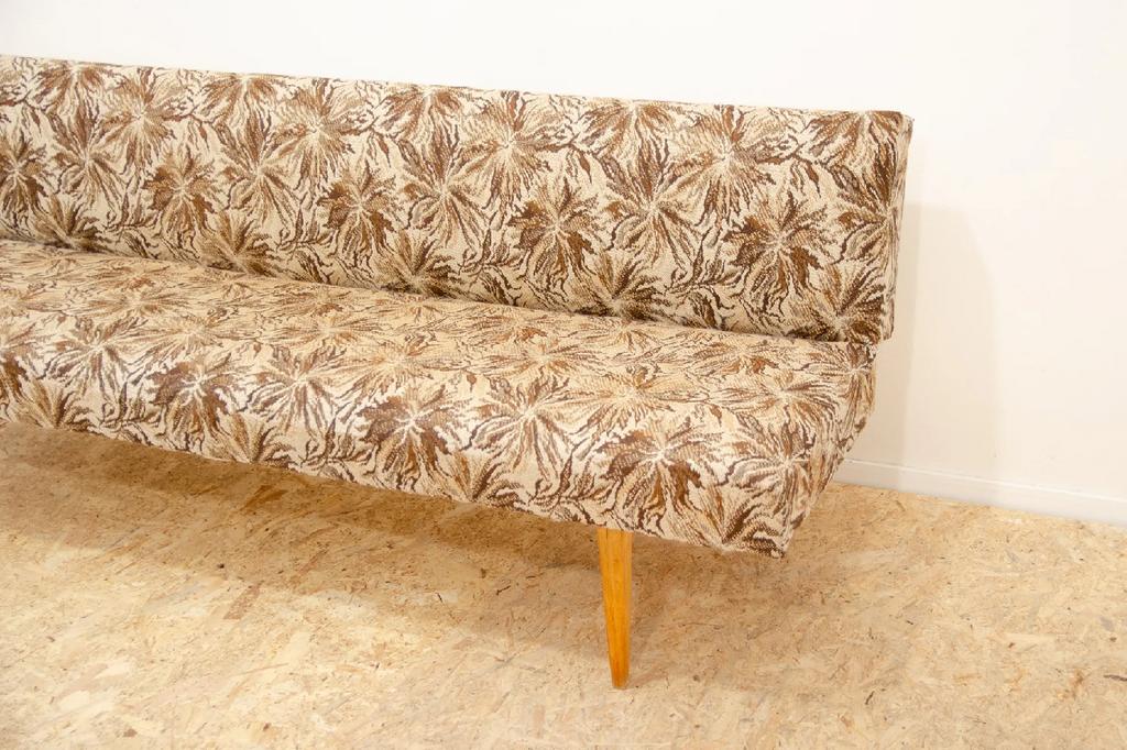 A mid-century sofa/daybed from the 1960s, made in former Czechoslovakia. Crafted from beech wood with fabric upholstery, it functions both as a comfortable sofa and as a practical bed. The clean lines and simple, functional design reflect the essence of mid-century modern style.