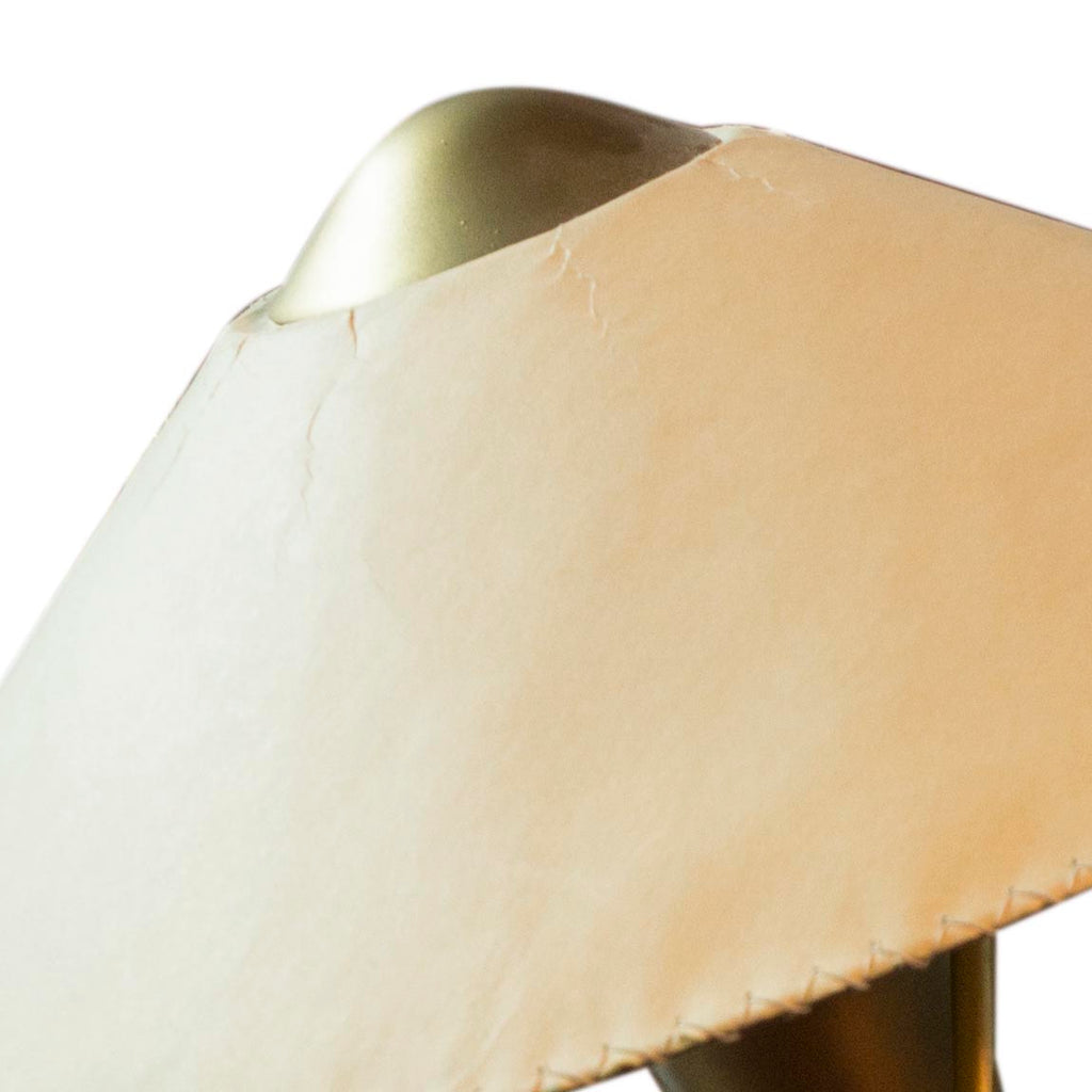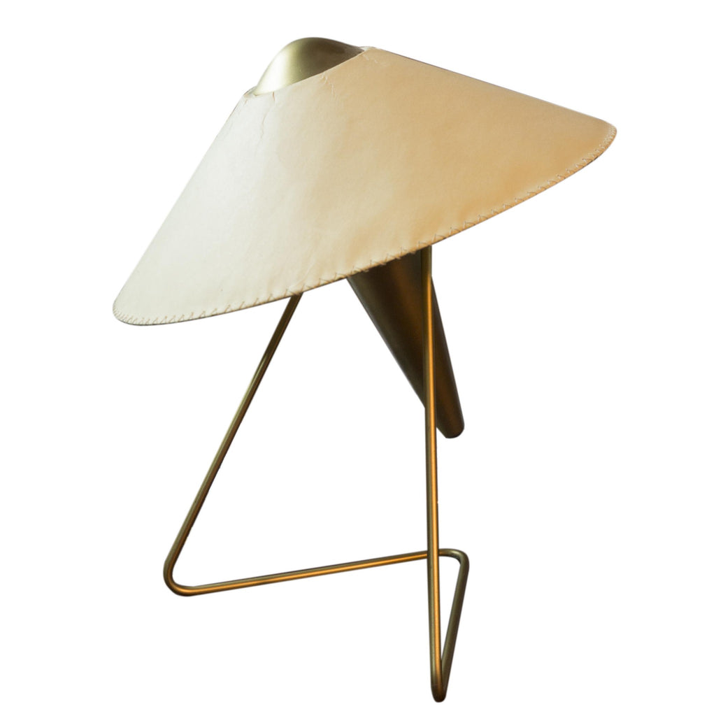 Desk lamp or wall lamp designed by Helena Frantova and produced by Okolo in 1953, Czechoslovakia. Elegantly angled brushed steel legs that support an adjustable lamp with parchment shade.