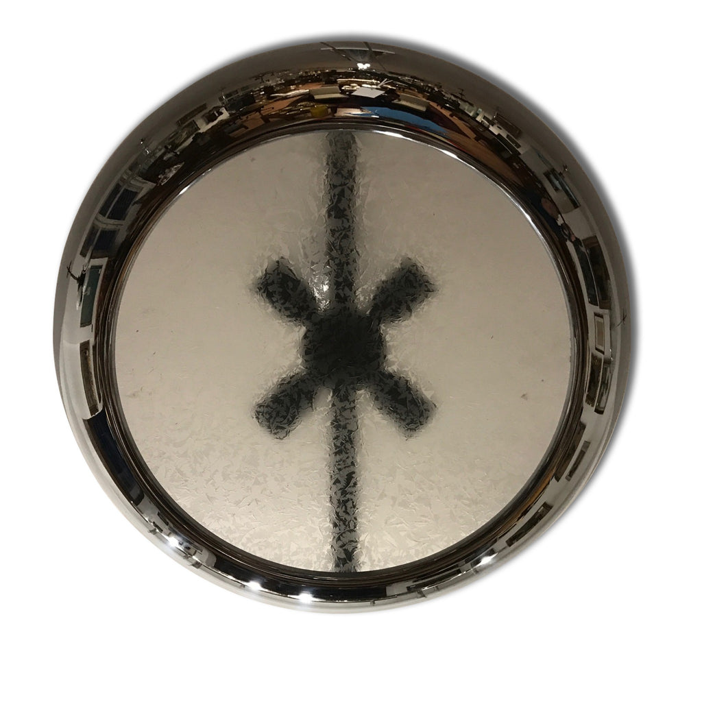 Simple chrome pendant shaped "UFO" with central frosted glass disc.