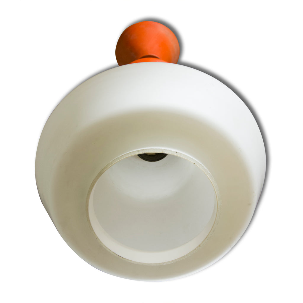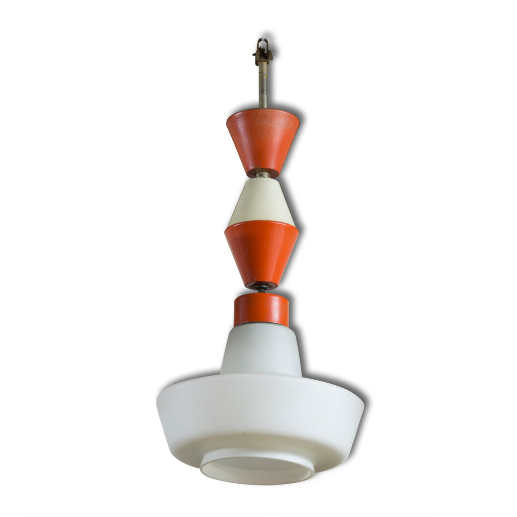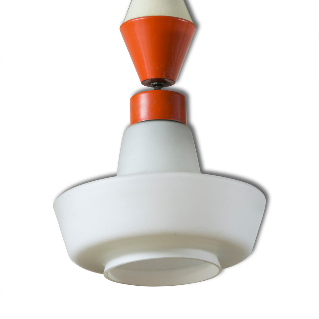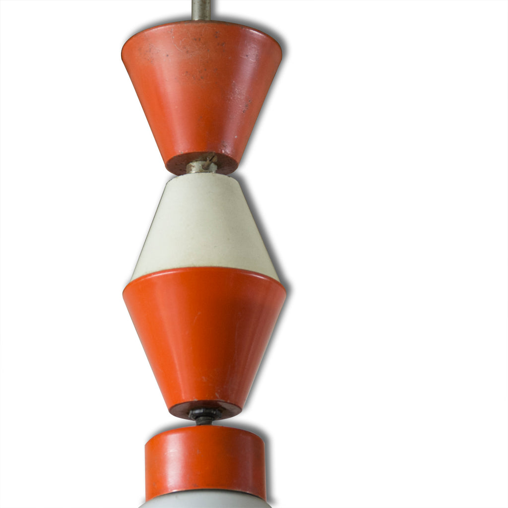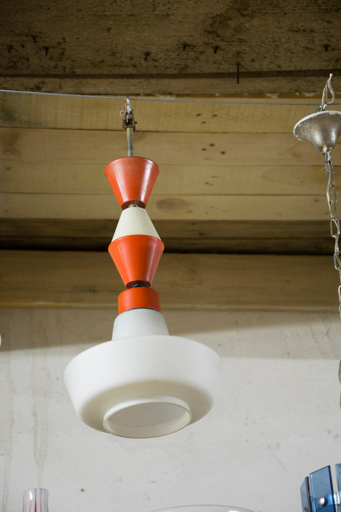 A vintage mid century pendant light, made in Czechoslovakia in 60´s. In red with a white shade. Material:milky glass, metal, sheet metal. In good Vintage condition, consistent with age and use. Original wiring. Functionality has not been tested. If you are interested, we will provide a new wiring.