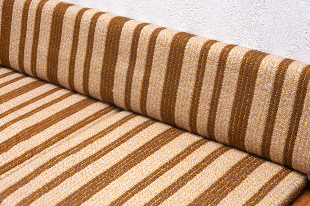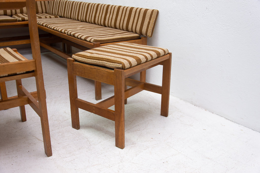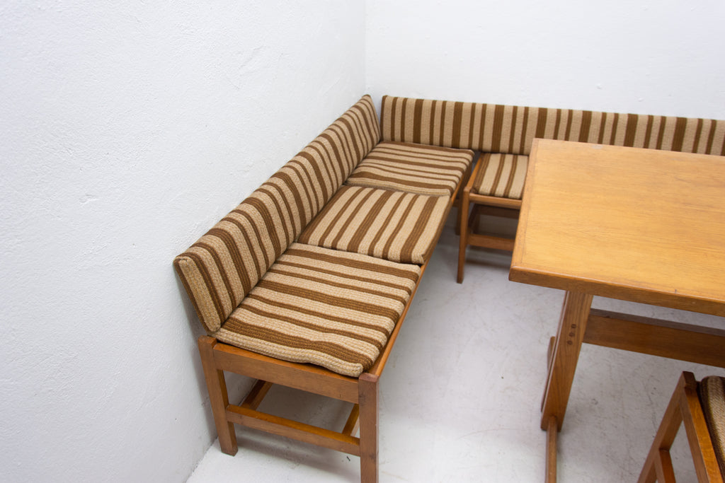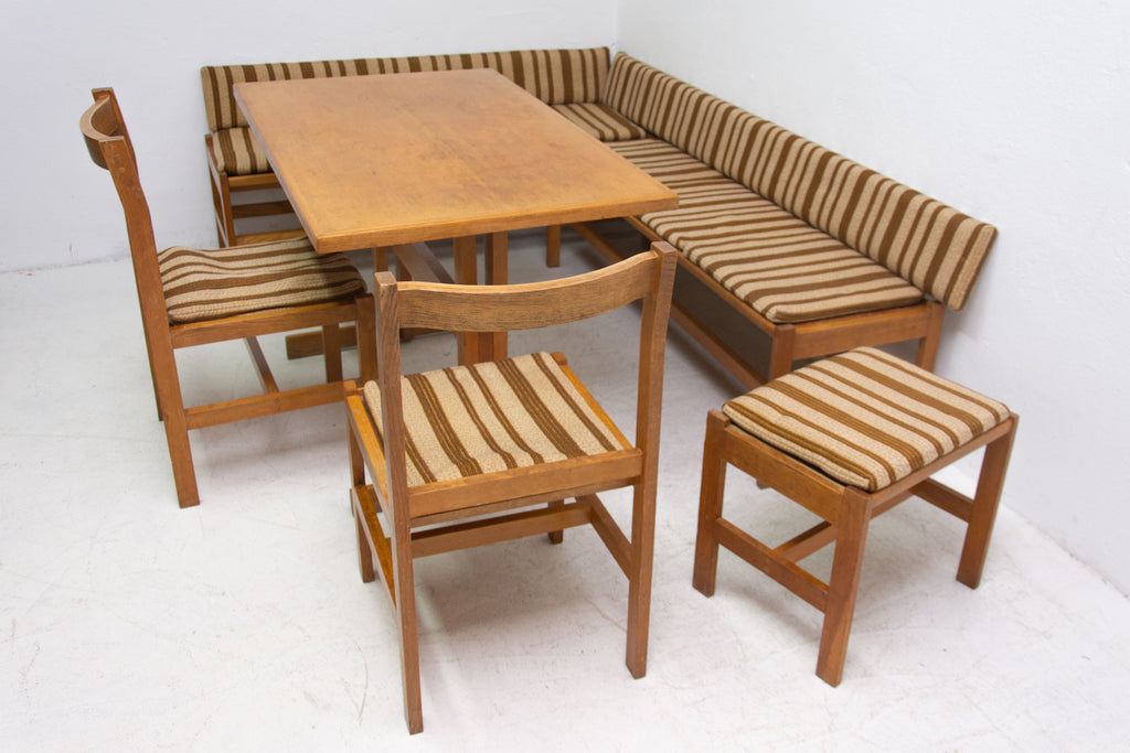 It consist of a corner bench, a dining table, two chairs and one stool. It´s made of wood and fabric.