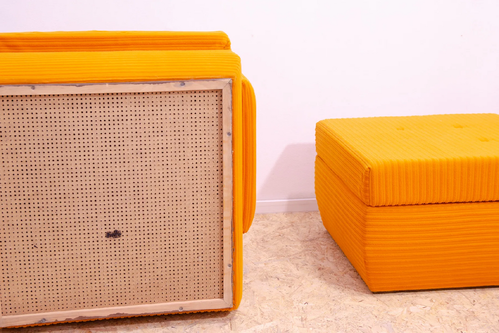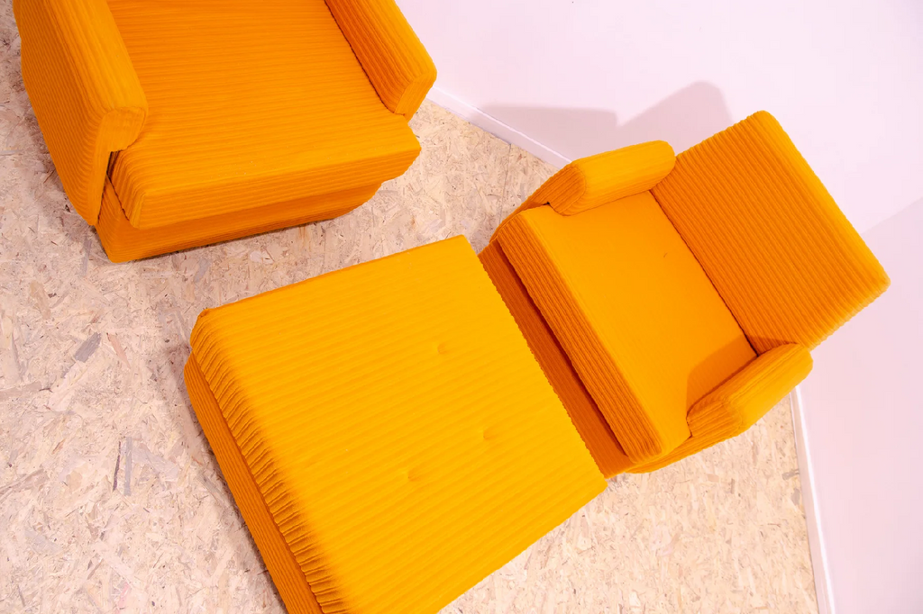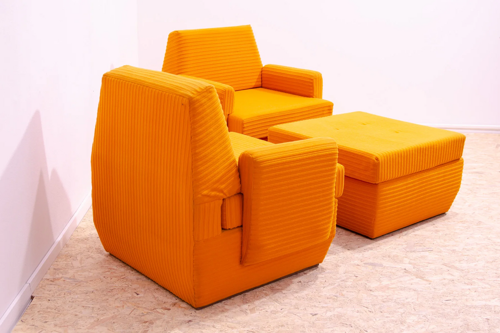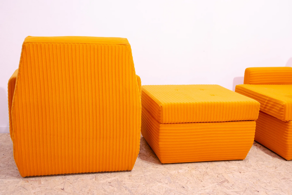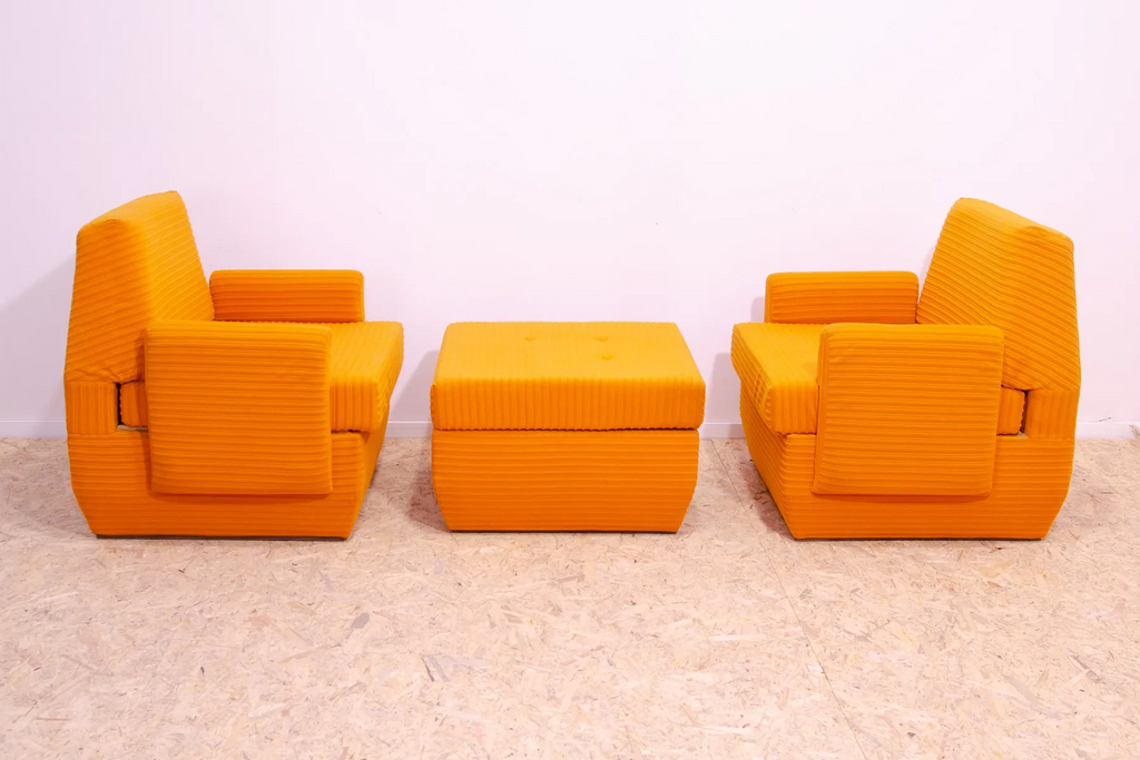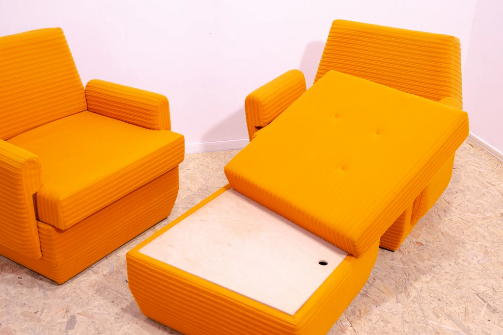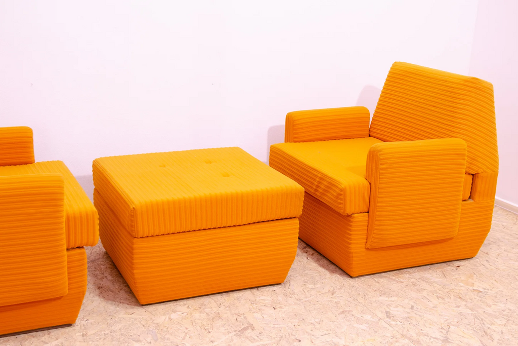 The furniture is very comfortable. It´s made of foam and polystyrene filling, so the chairs are very light. The chairs have an original orange fabric. All in very good preserved condition.