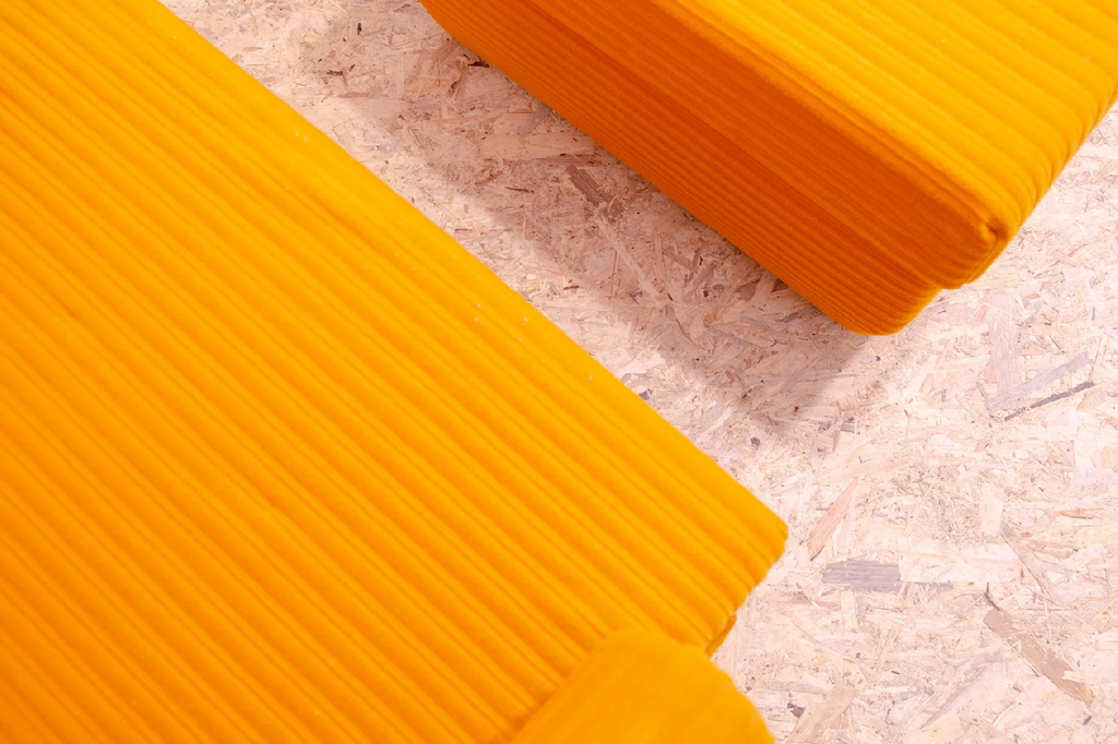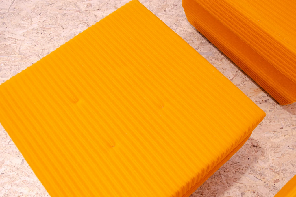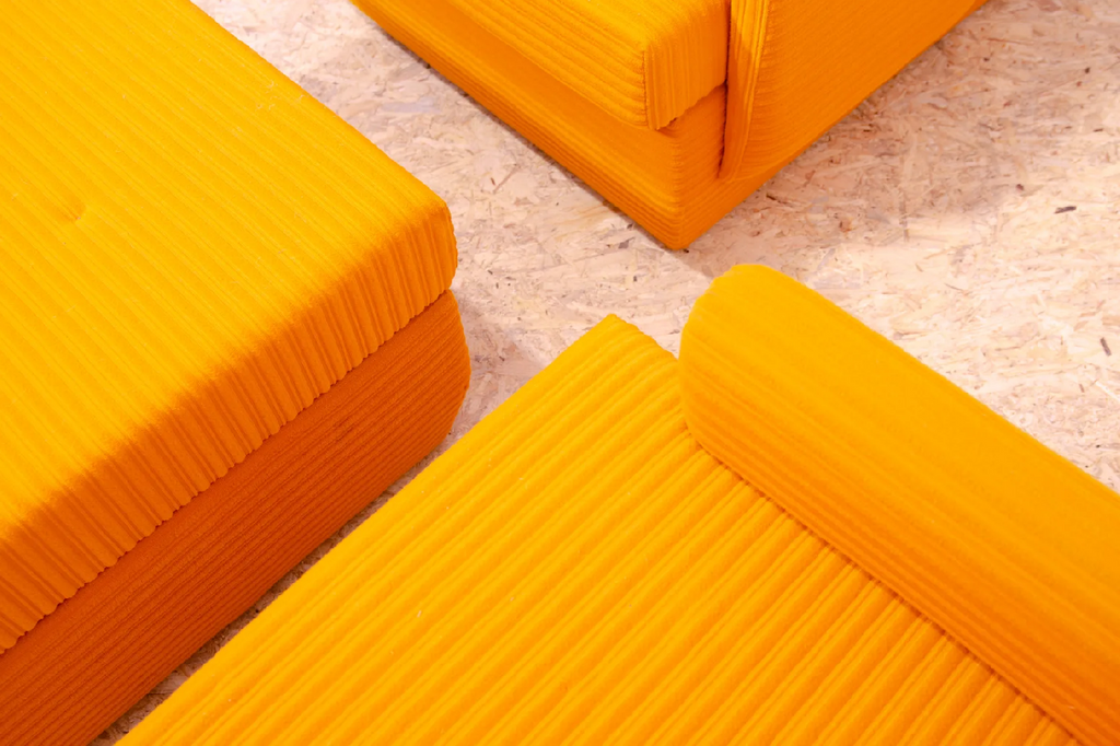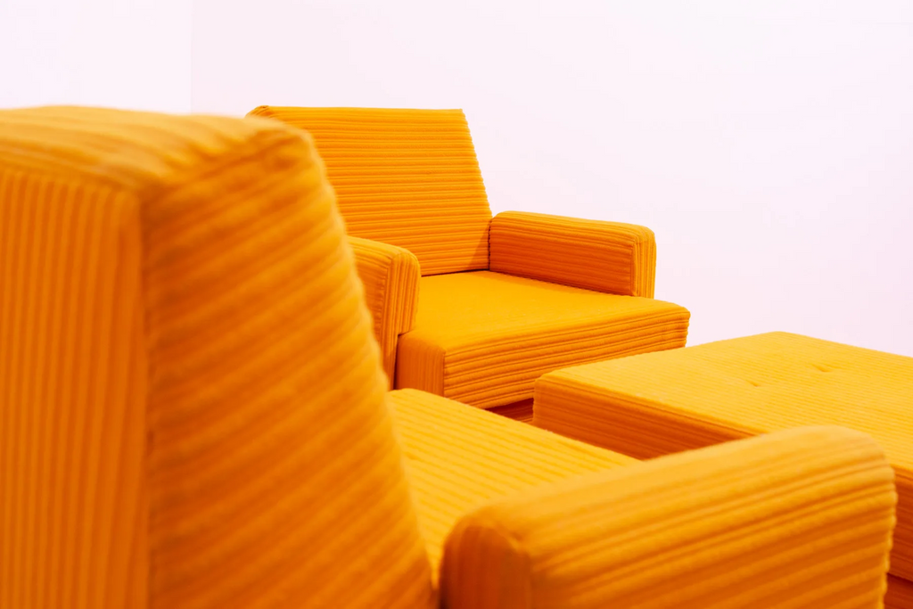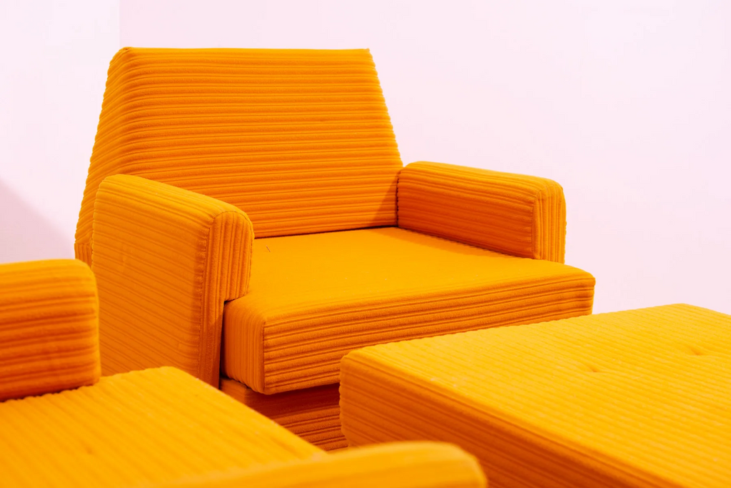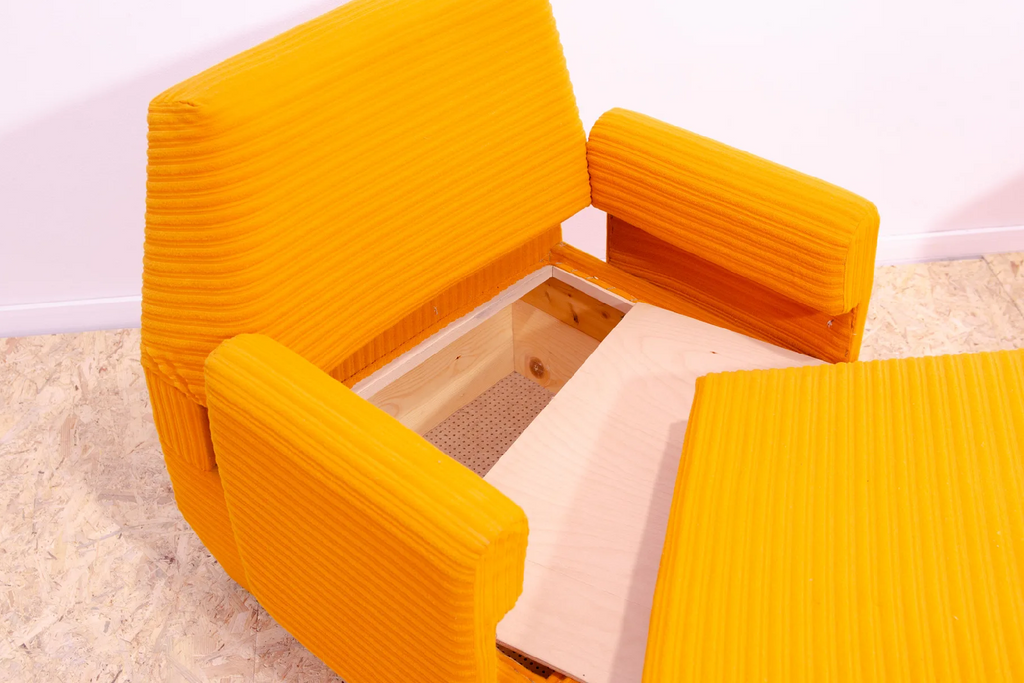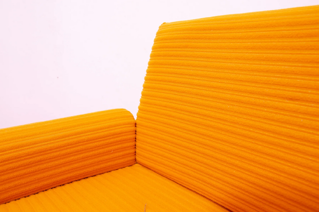 The furniture is very comfortable. It´s made of foam and polystyrene filling, so the chairs are very light. The chairs have an original orange fabric. All in very good preserved condition.
