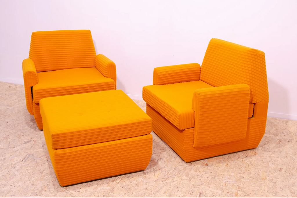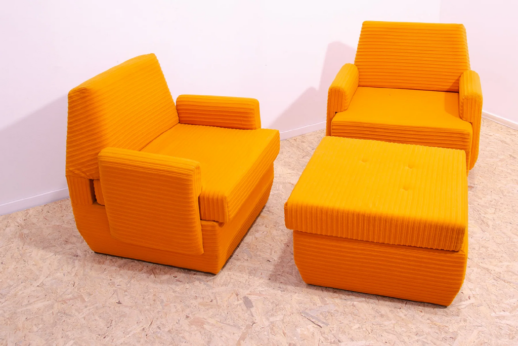 This set was a part of a living room set made by JITONA company in the 1970´s. It´s consist of two armchairs and one pouffe. You can also simply turn it into a bed.