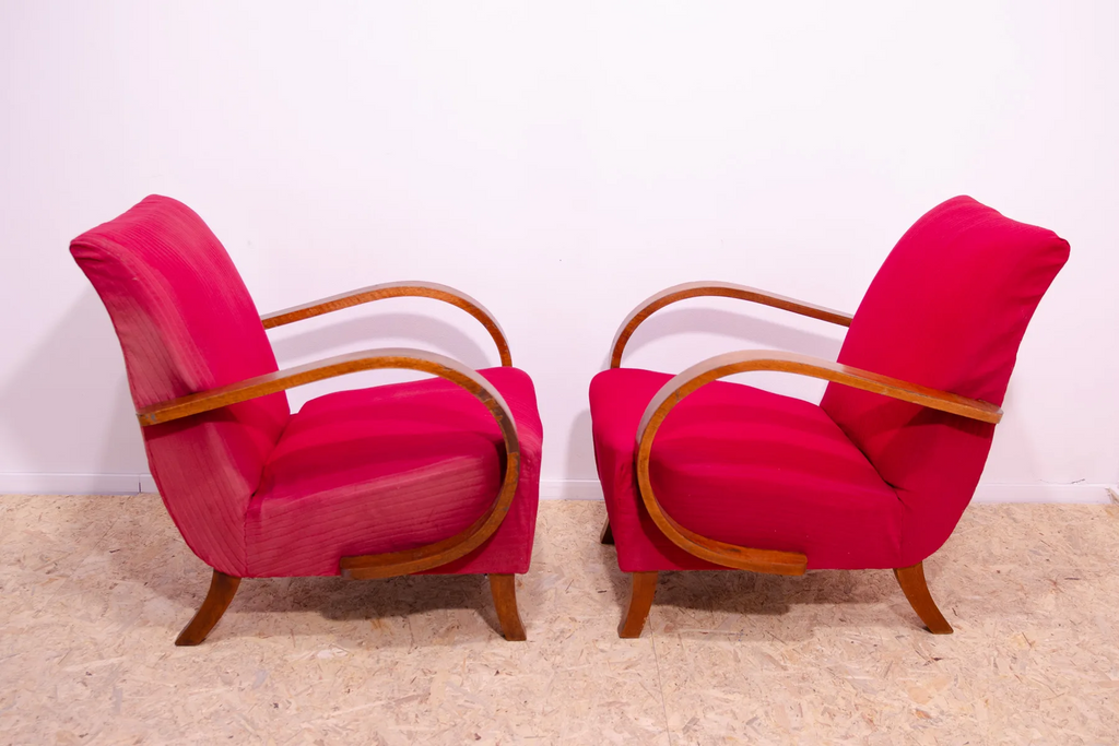 Pair of midcentury bentwood "C" armchairs designed by Jindřich Halabala and produced by UP Závody in the 1950´s. The chairs are stable and comfortable and overall are in good preserved Vintage condition, the fabric shows signs of age and using(fadding on the back, minor scuffs)
