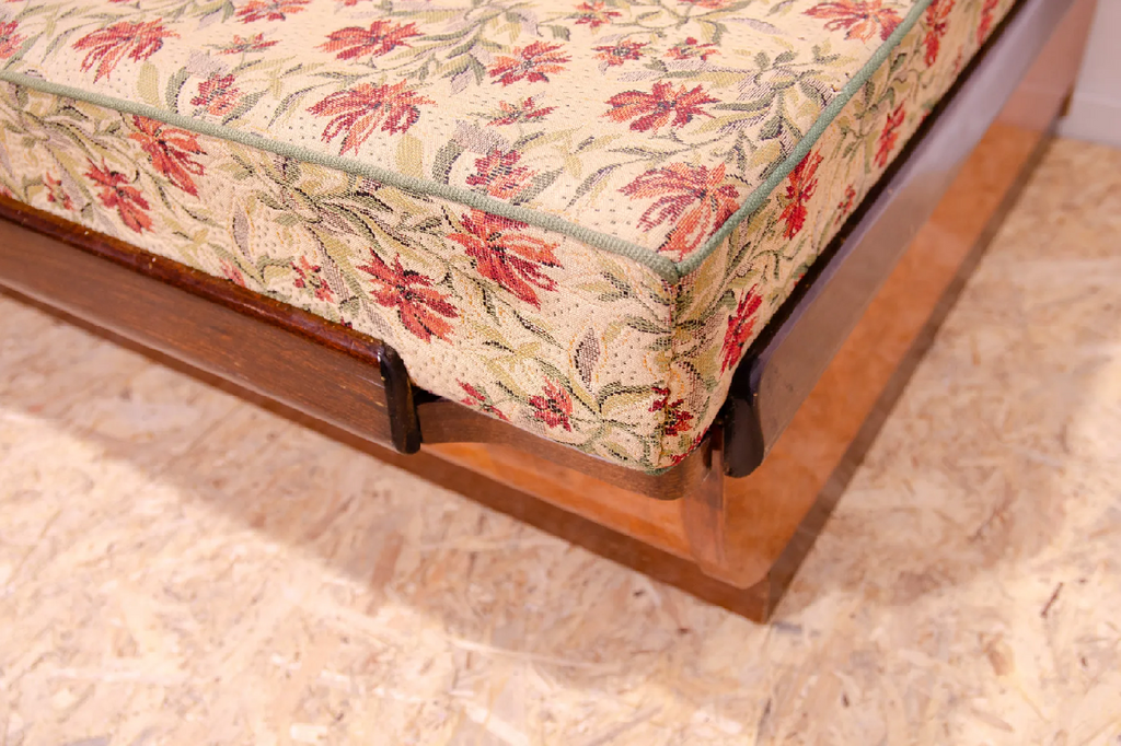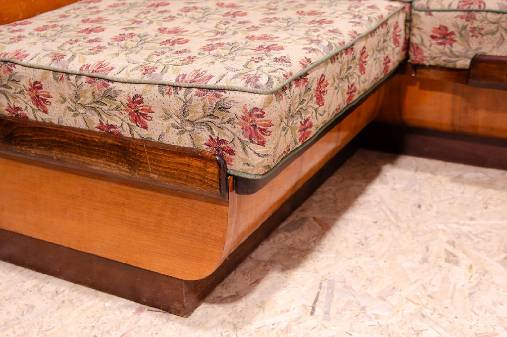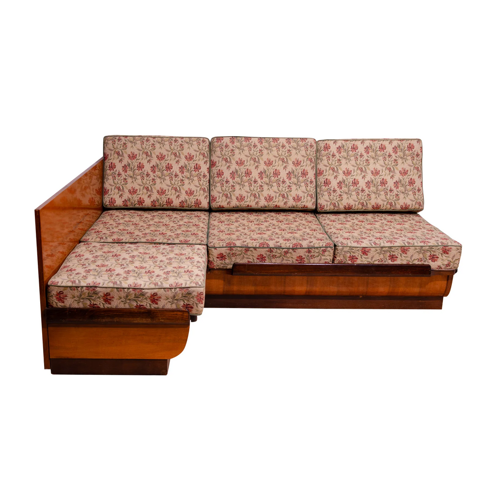 This mid century corner sofa bed designed by Jindřich Halabala. It was made in the former Czechoslovakia in the 1950´s. This sofa features a wooden structure that is veneered in walnut. Sofa is adjustable for sleeping and is in very good condition.