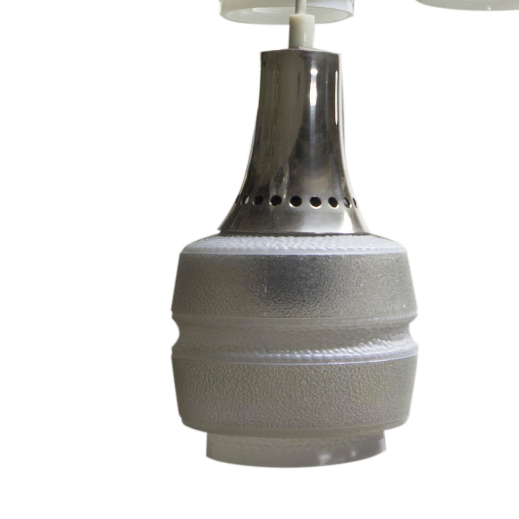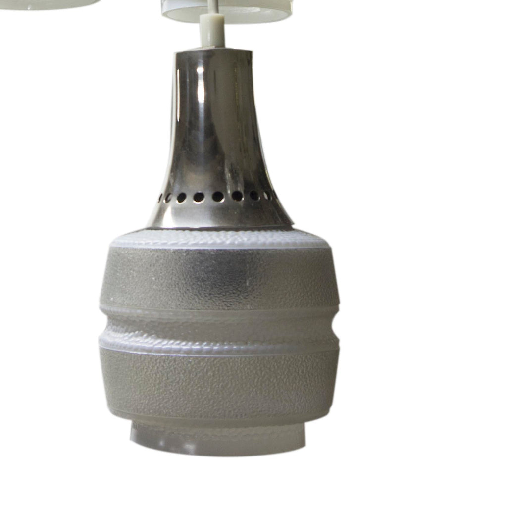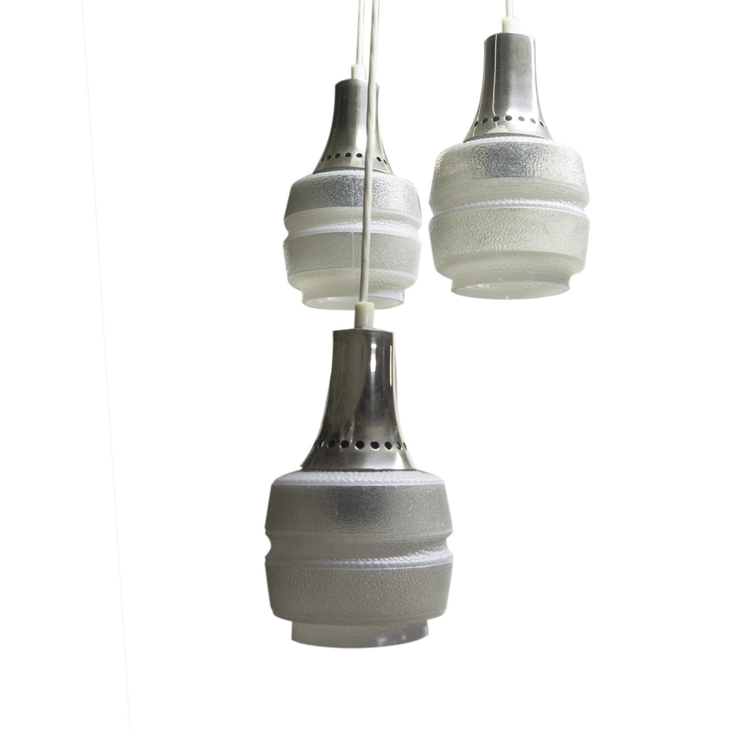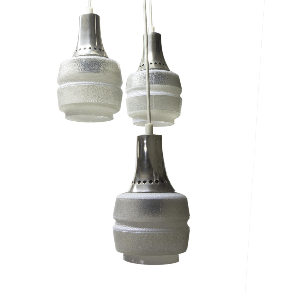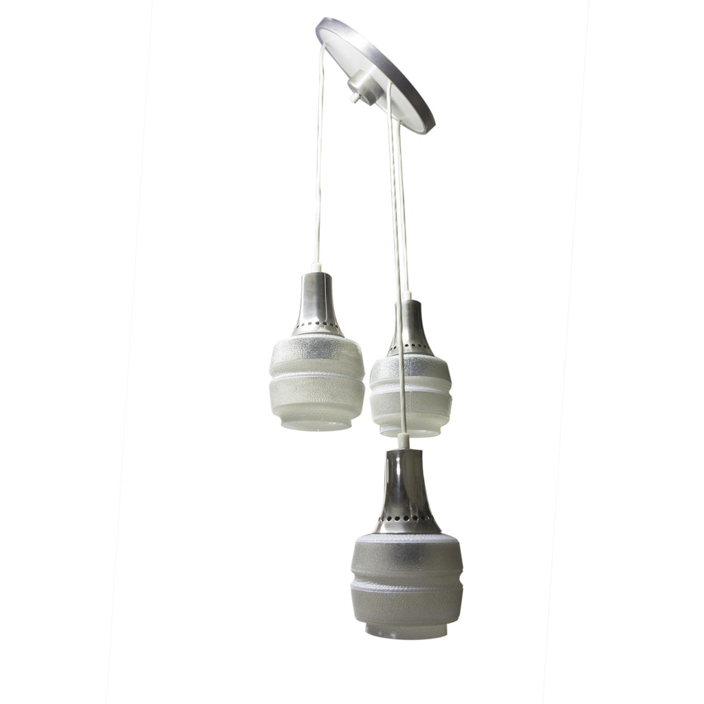 Retro pendant chandelier with three lampshades in cut frosted glass. Chrome brackets on lampshades. Very nice vintage model in Italian designer style. Very good condition.