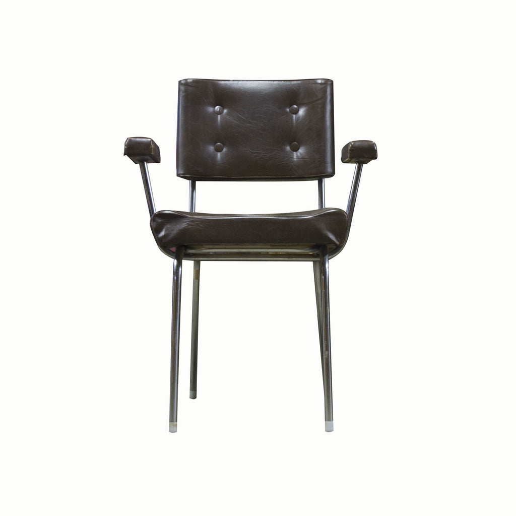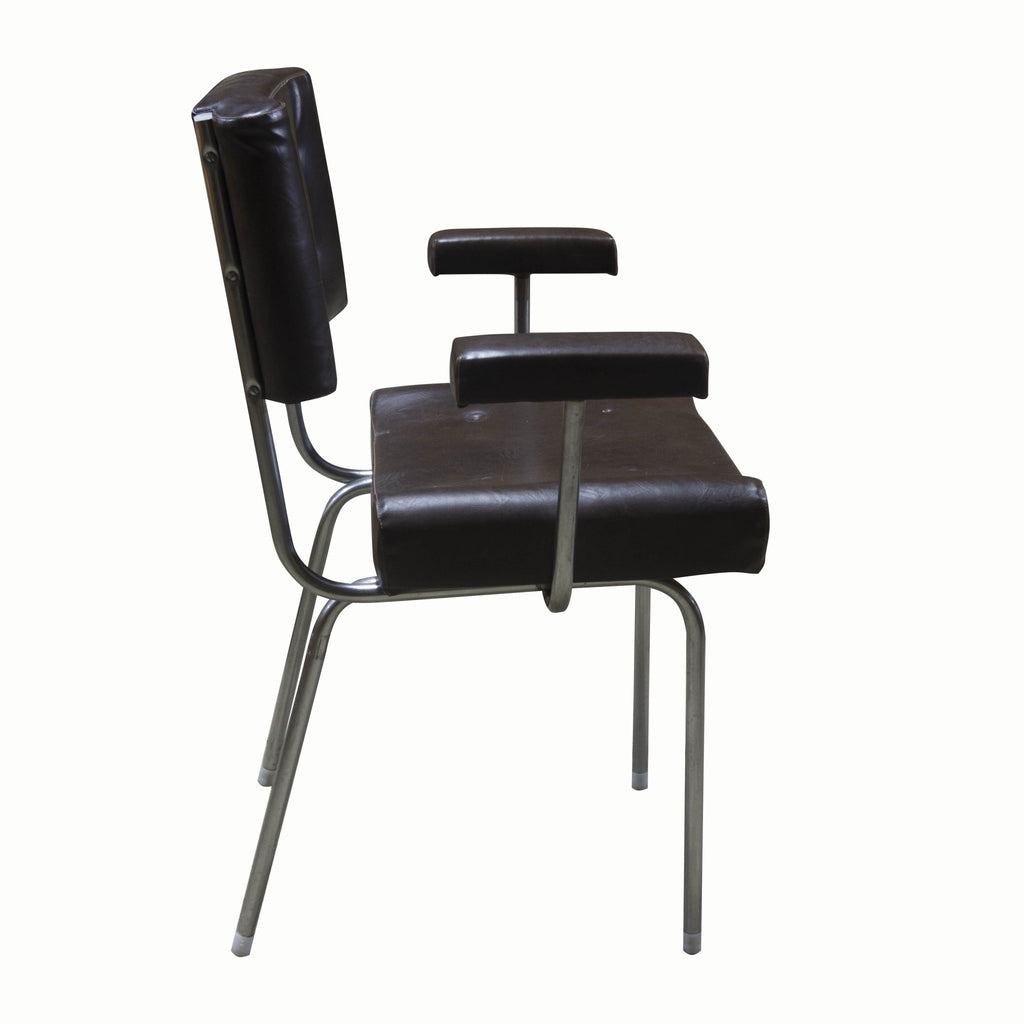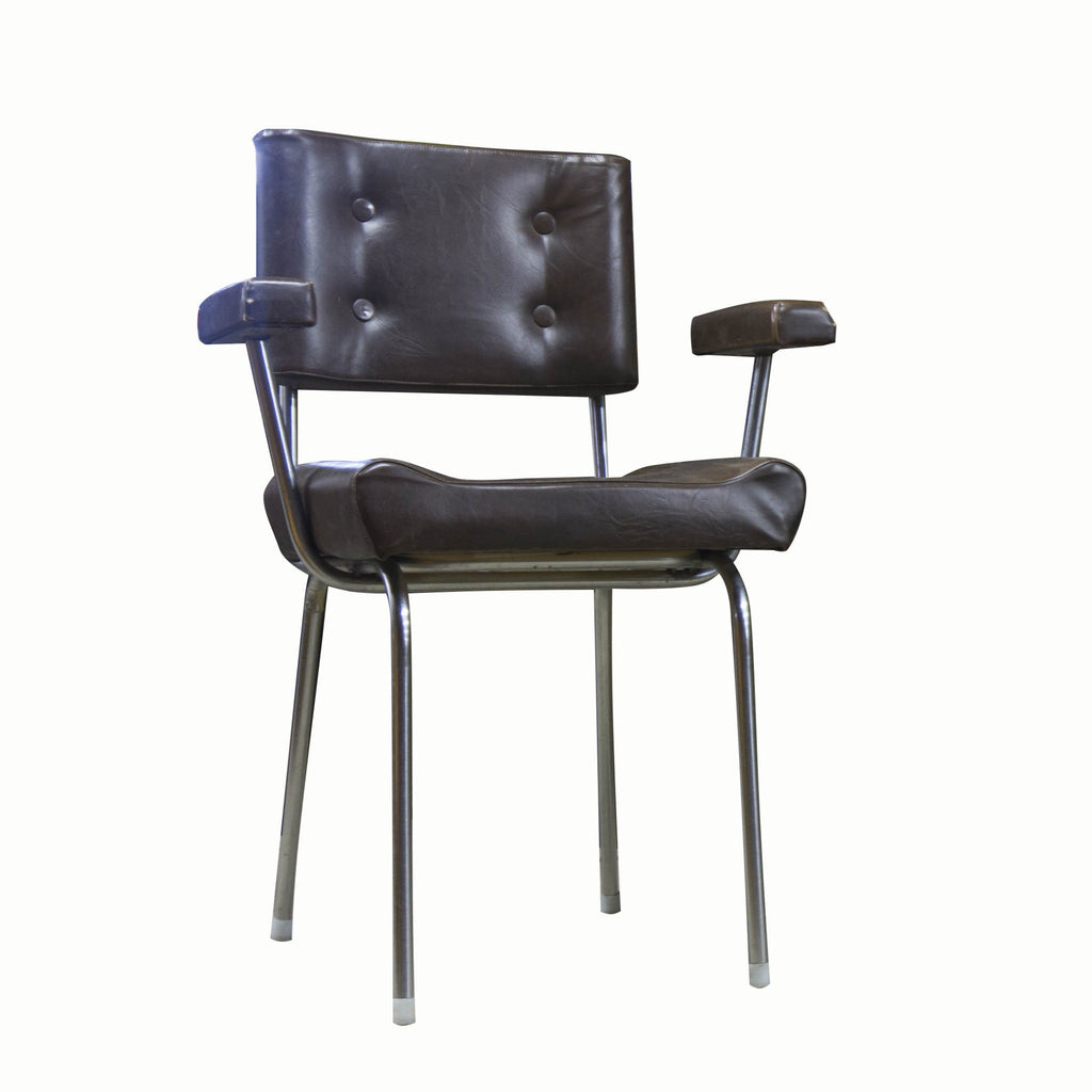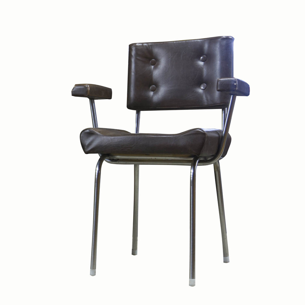 Interesting model of dining chairs with amrests. Made in Czechoslovakia, turn of the 70s and 80s. Upholstered with imitation leather. Chromium plated metal base, upholstery in very good condition, but missing a few buttons. Four available substitute. Price is for the complet