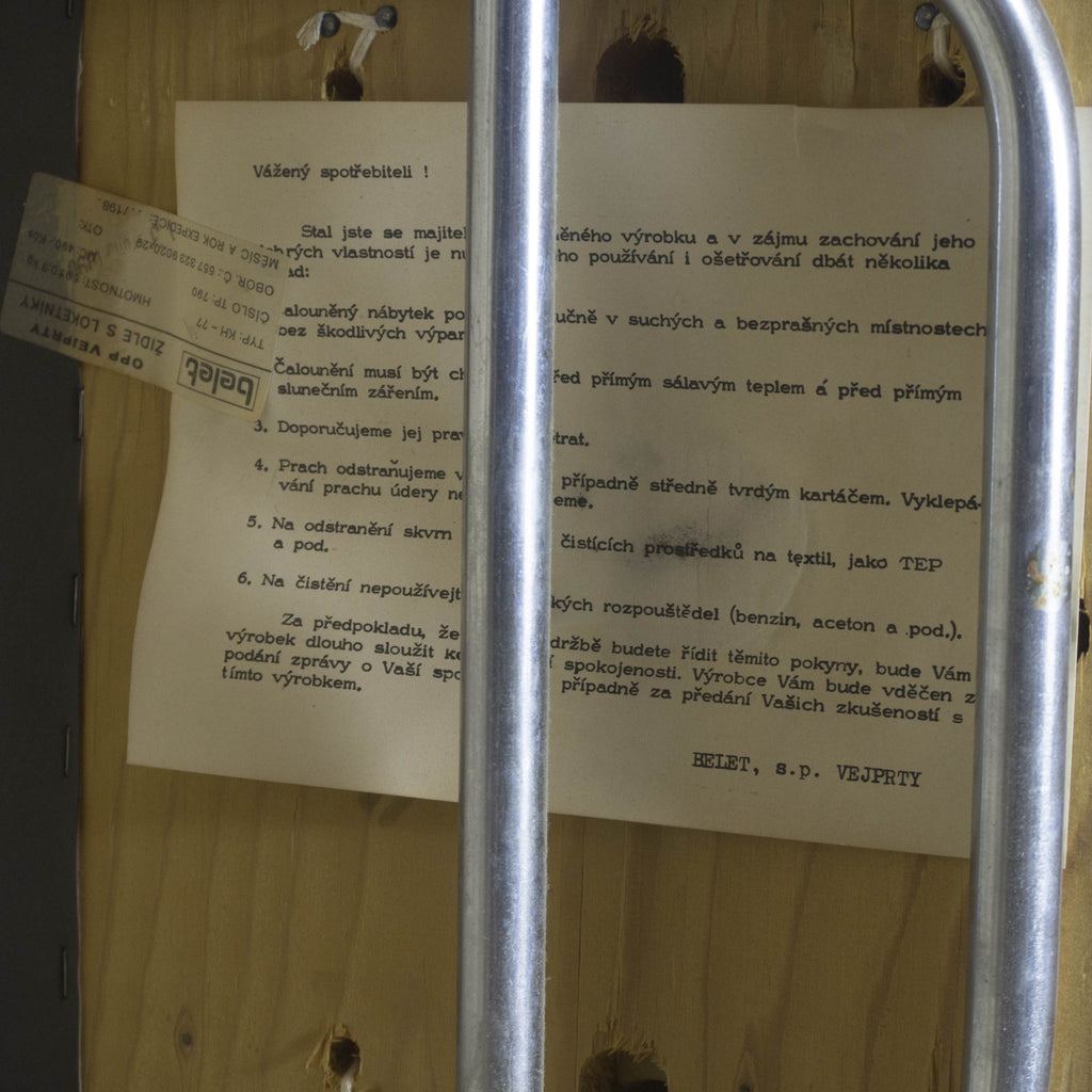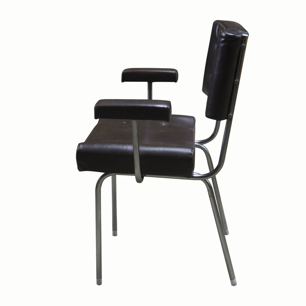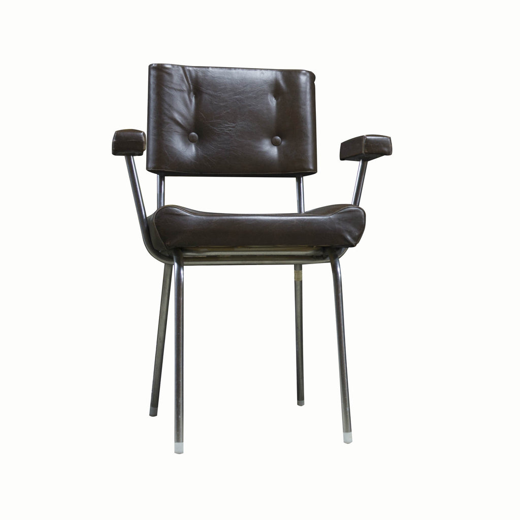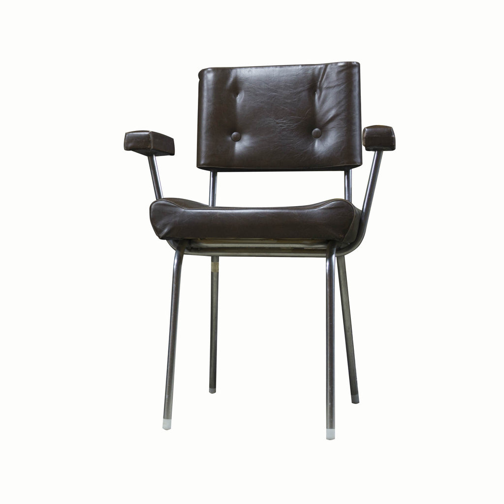 Interesting model of dining chairs with amrests. Made in Czechoslovakia, turn of the 70s and 80s. Upholstered with imitation leather. Chromium plated metal base, upholstery in very good condition, but missing a few buttons. Four available substitute. Price is for the complet