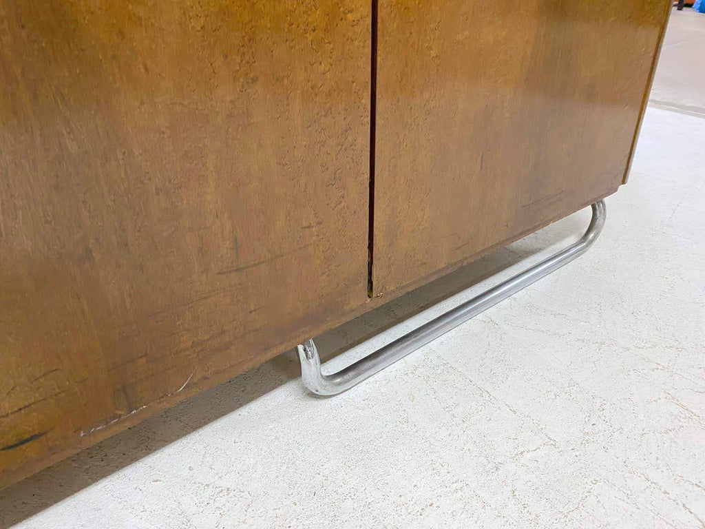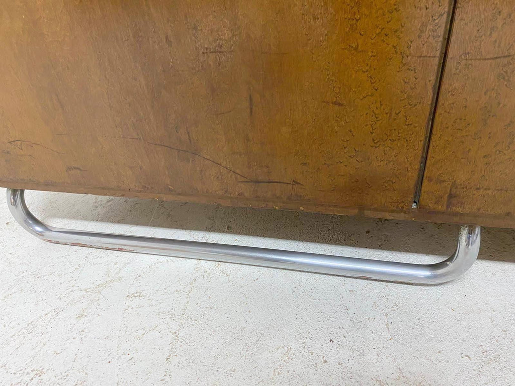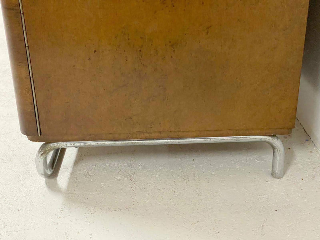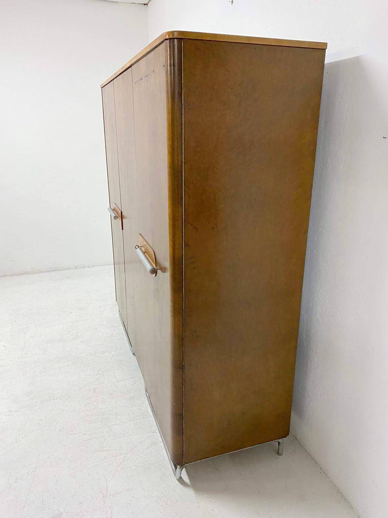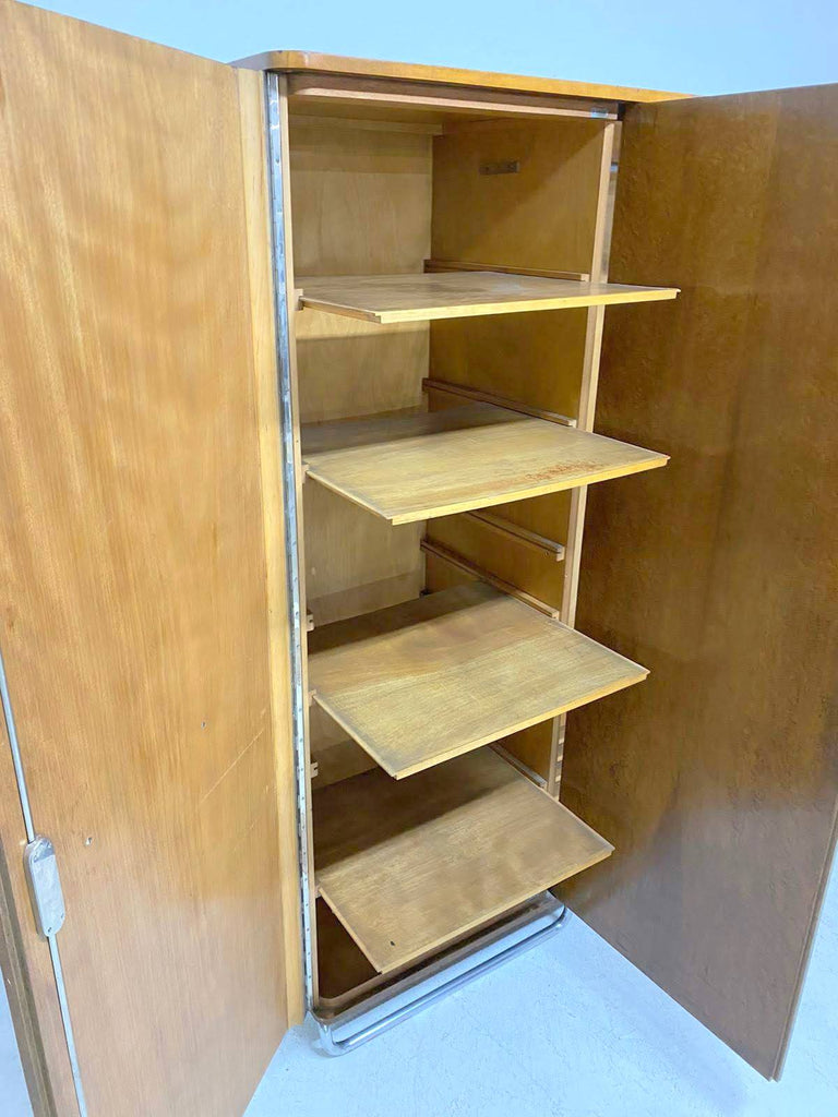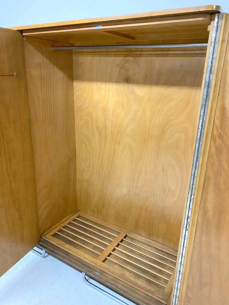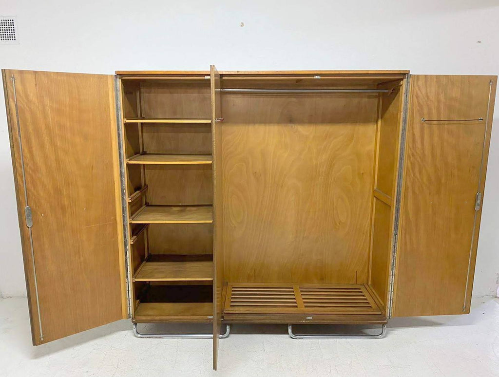 Functionalist wardrobe with chrome elements from the Bauhaus period. It was made in the former Czechoslovakia by Mücke & Melder company in the 1930s. This is a typical example of residential furniture from the Bauhaus period in Central Europe. Material: wood, plywood, chromed construction, maple veneer. The wardrobe is in good original condition, consistent with age and use, chrome well-preserved, veneer slightly scratched in a few places. The wardrobe can be used immediately.