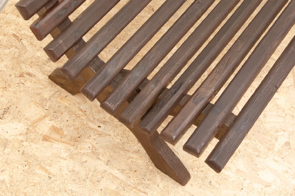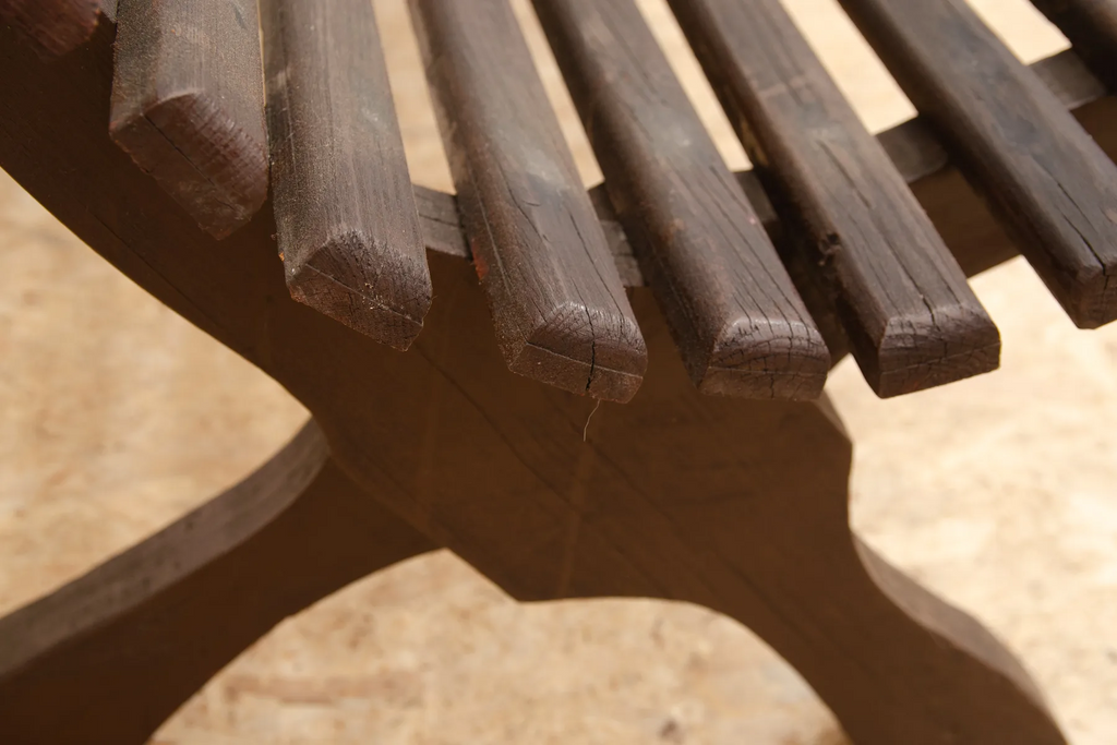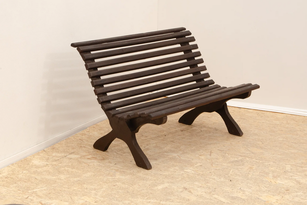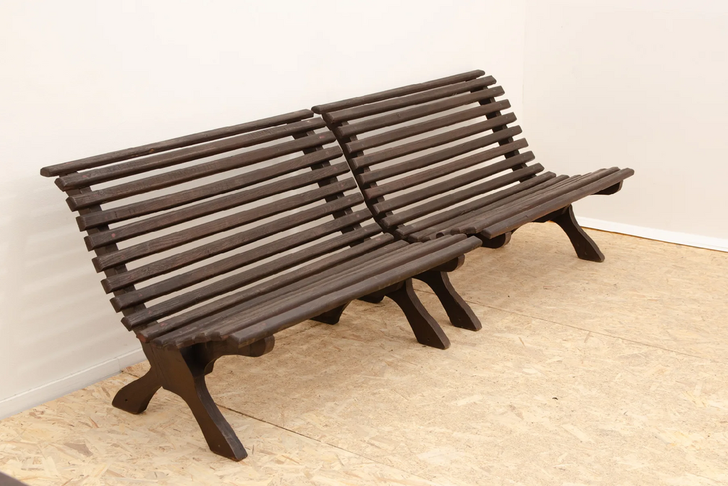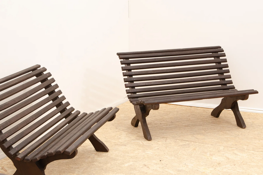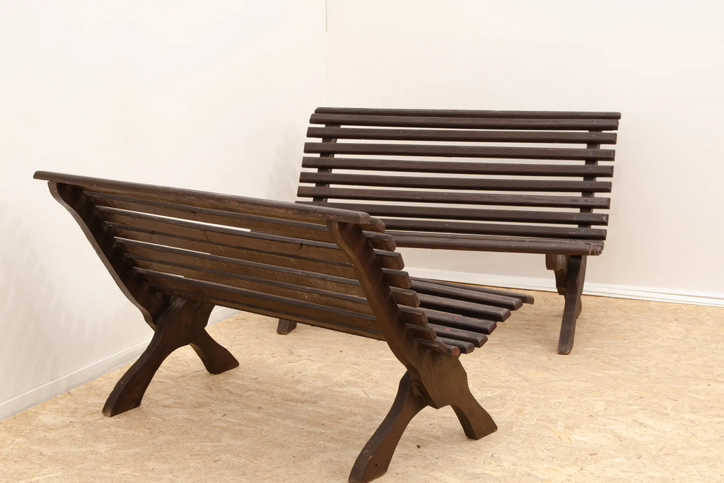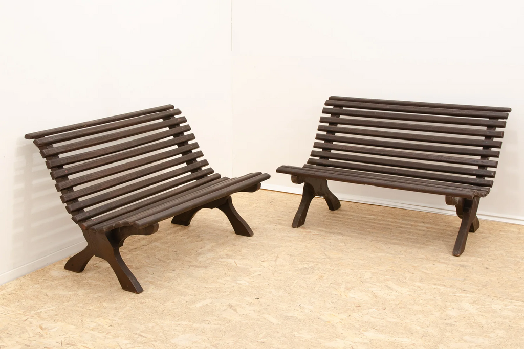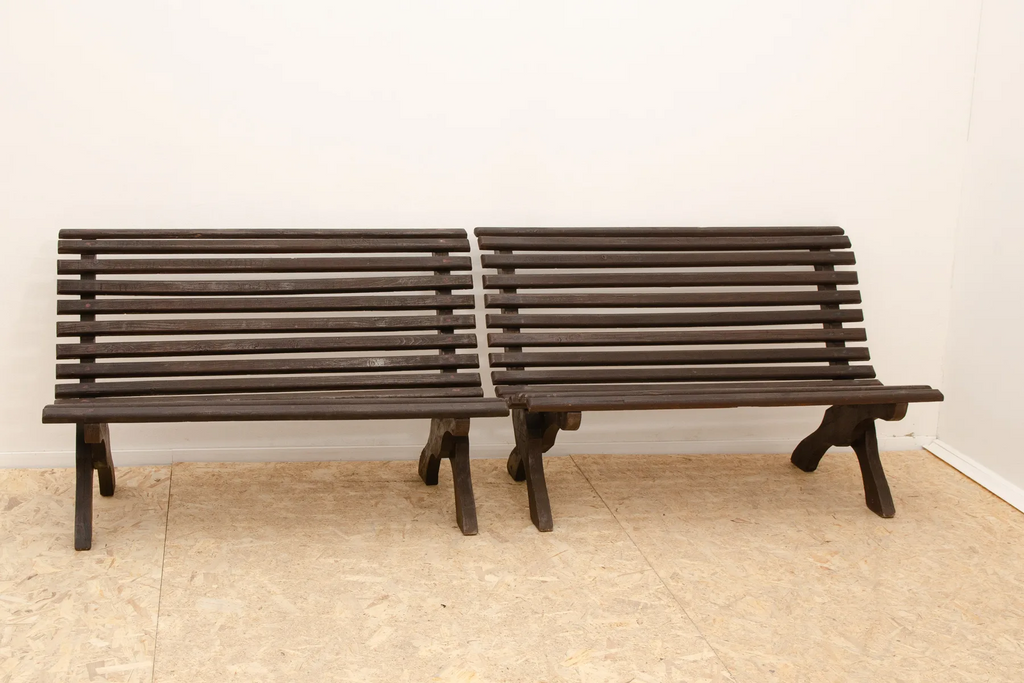 These garden or park benches were made in the 80s in the former Czechoslovakia. It is made of stained pine wood. In very good condition, no visible damage, with minor signs of wear. Price is for the set of 2.