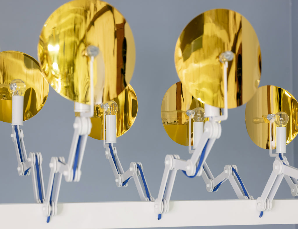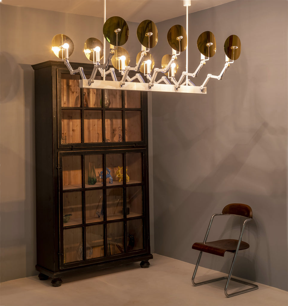 Constructed from high-quality metal, the chandelier features adjustable arms and ten individual lampshades, allowing for customized spatial arrangements. Its modular system reflects the evolution of Czech lighting design from traditional crystal production toward contemporary functionality.