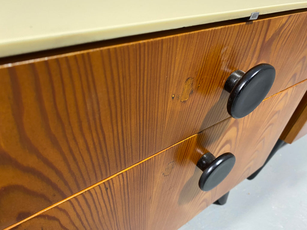 These night stands can be used also as a small chest of drawers. They were designed by Jindřich Halabala for UP Závody in the former Czechoslovakia in the 1950´s. They have one drawer and storage space at the bottom. Black glass on top. Material: pine wood, ash wood. These stands are fully refurbished and in excellent condition. Price is for the pair.
