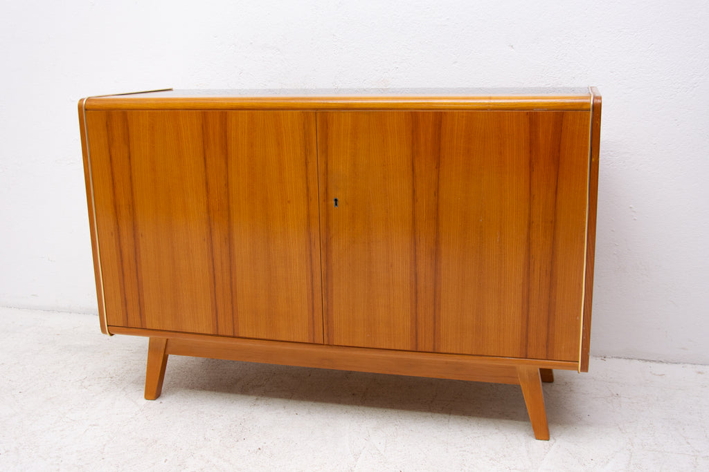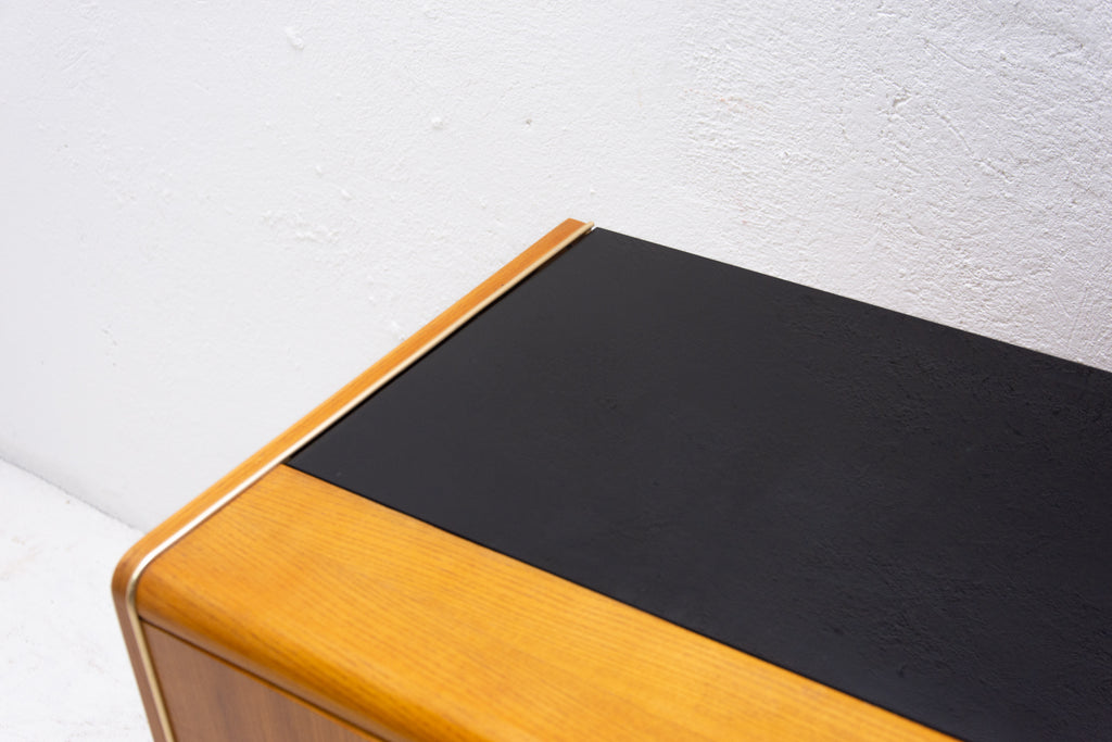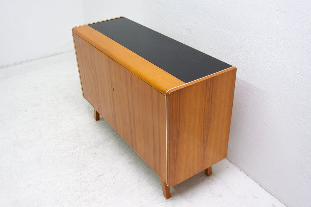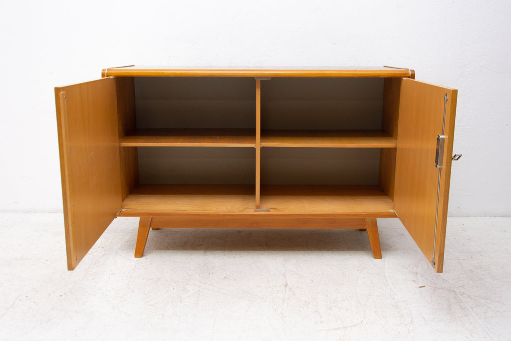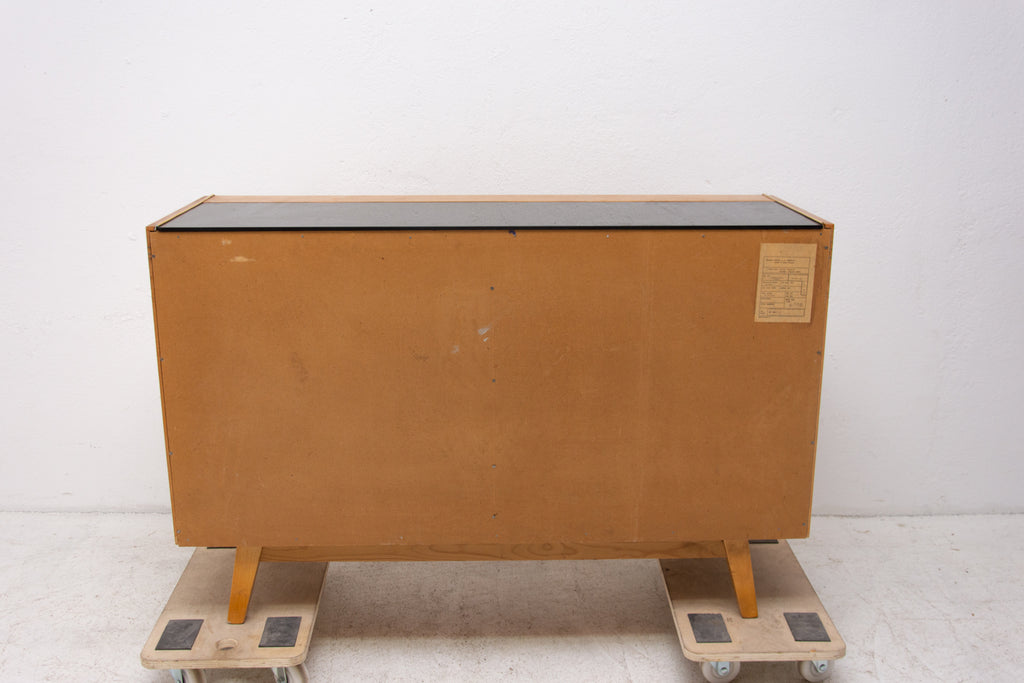 This mid century sideboard was designed by Hubert Nepožitek & Bohumil Landsman for Jitona company in the 1960´s. Material: beech wood, opaxite glass. In good Vintage condition, showing signs if age and using.