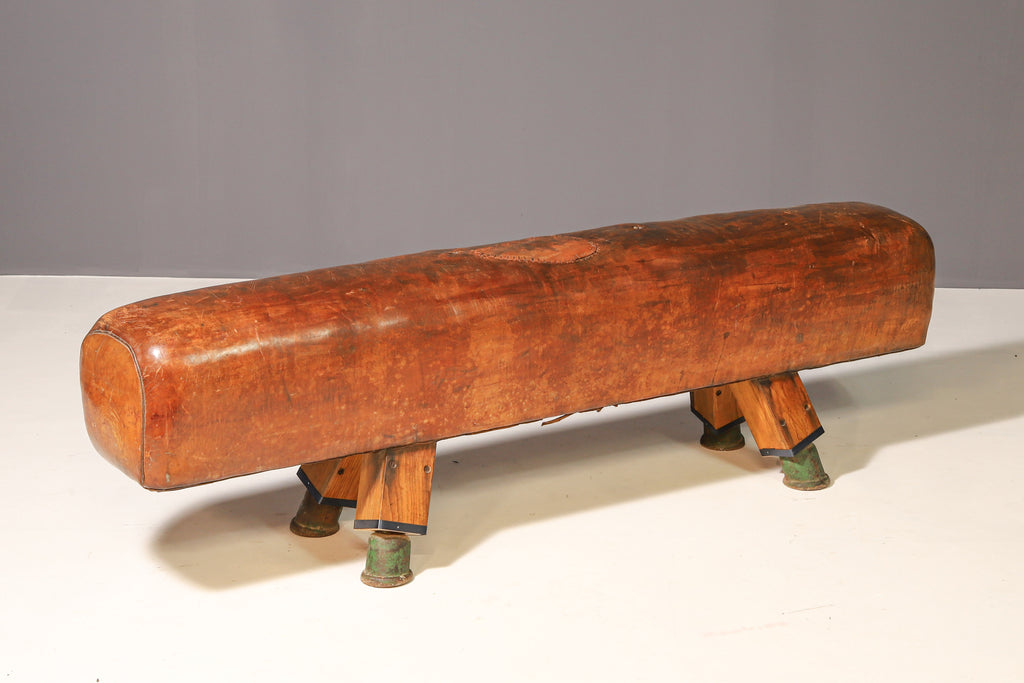 This gymnastics bench, originally a pommel horse, originates from former Czechoslovakia from the 1930s. It has been shortened to a seat height of 51 cm, making it suitable as a bench.