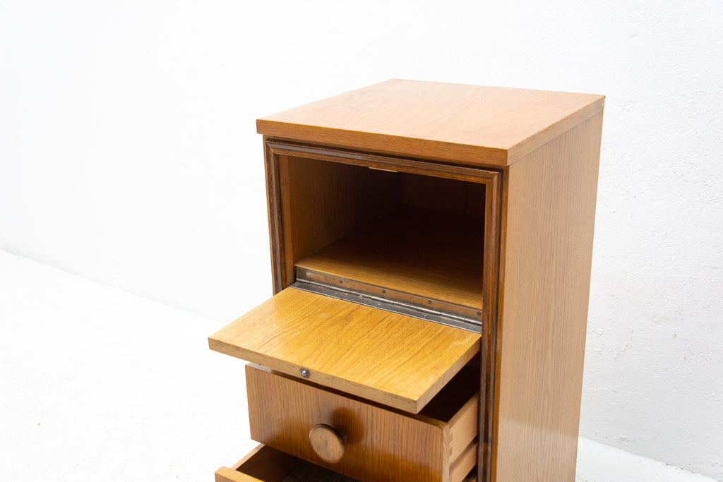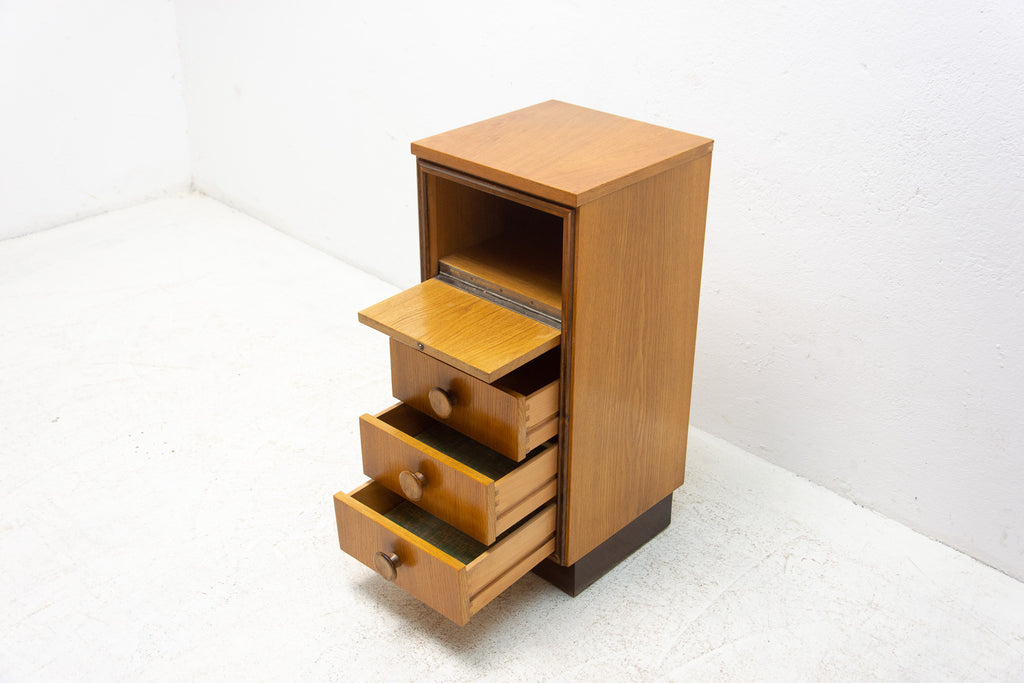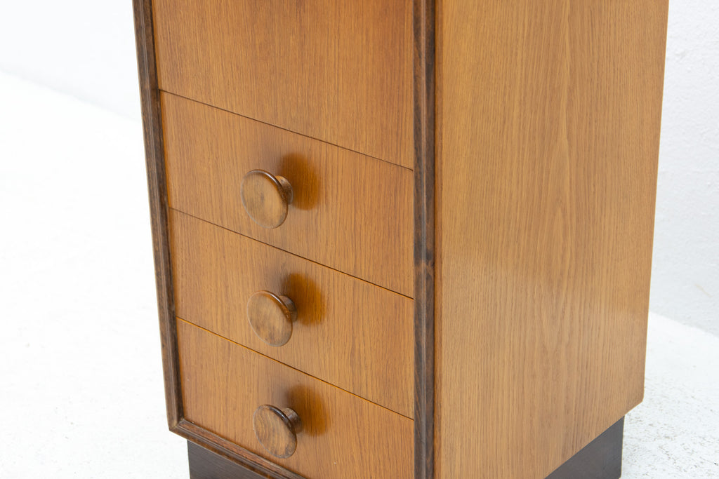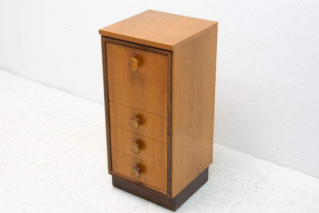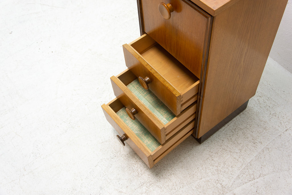 This midcentury small chest of drawers in the shape of a chimney was made by UP Závody in the former Czechoslovakia in 1958. It's made of oak wood. It has three drawers and a storage space.