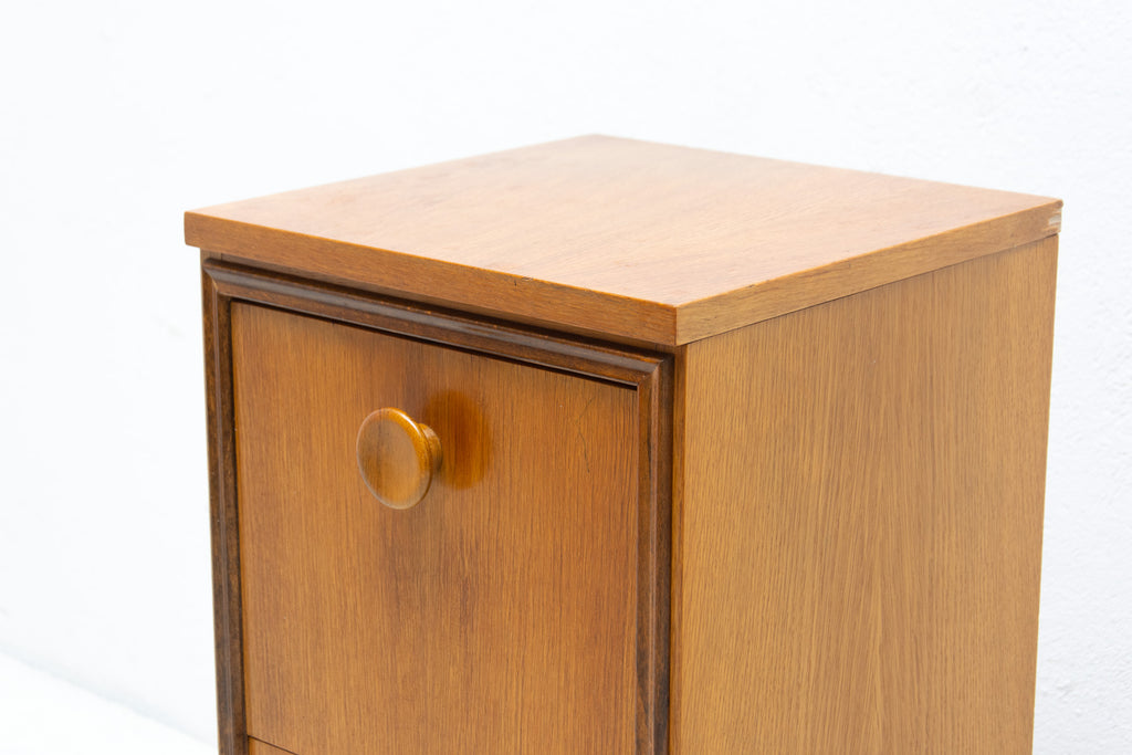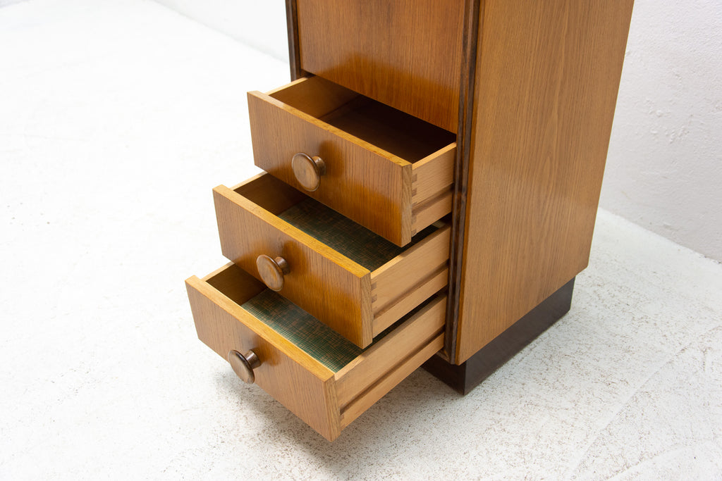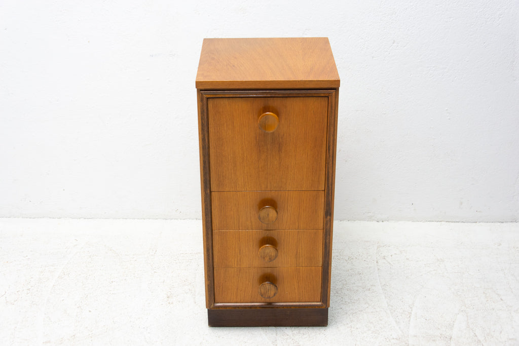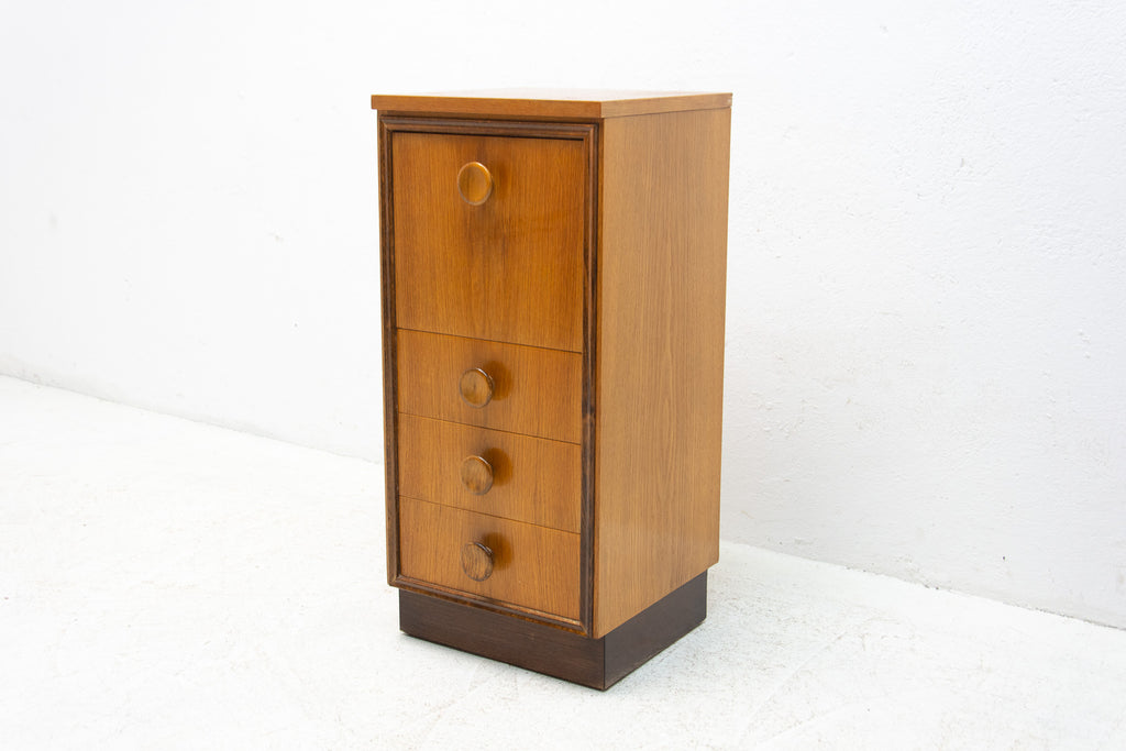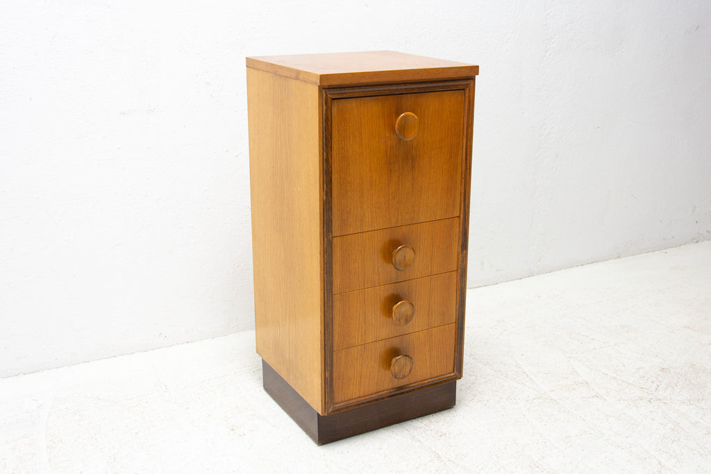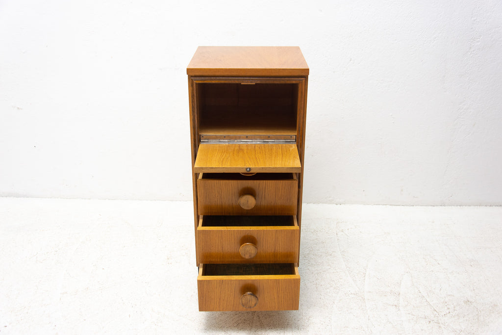 This midcentury small chest of drawers in the shape of a chimney was made by UP Závody in the former Czechoslovakia in 1958. It's made of oak wood. It has three drawers and a storage space.