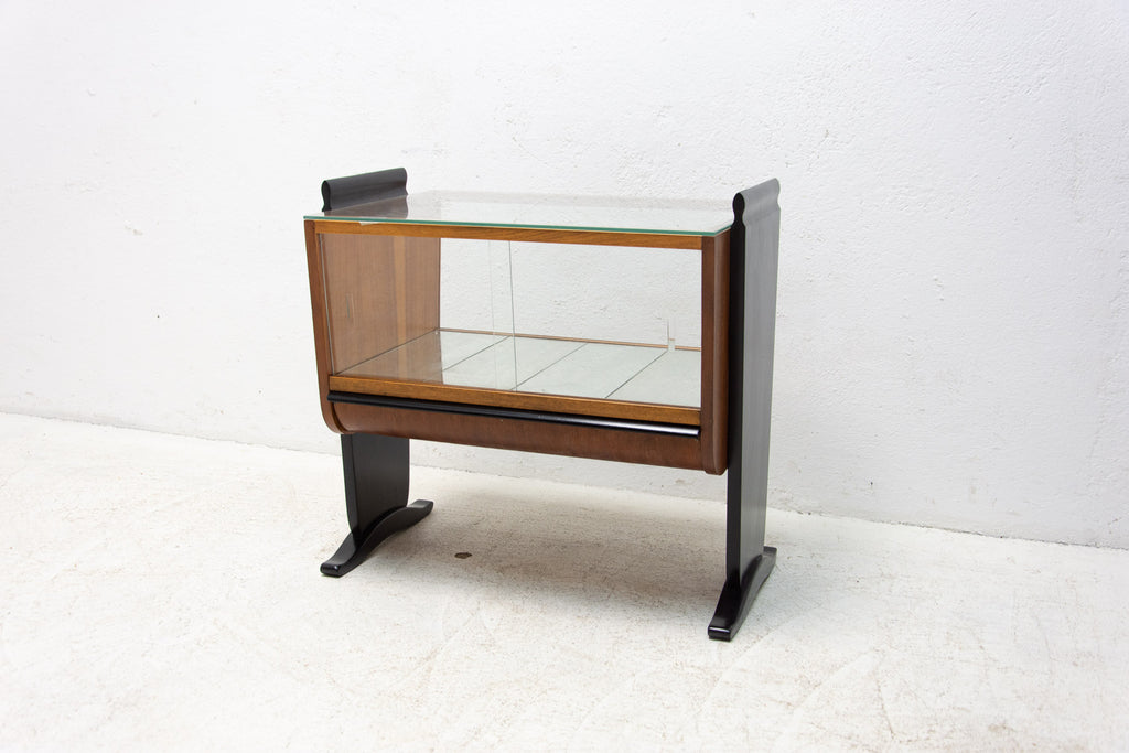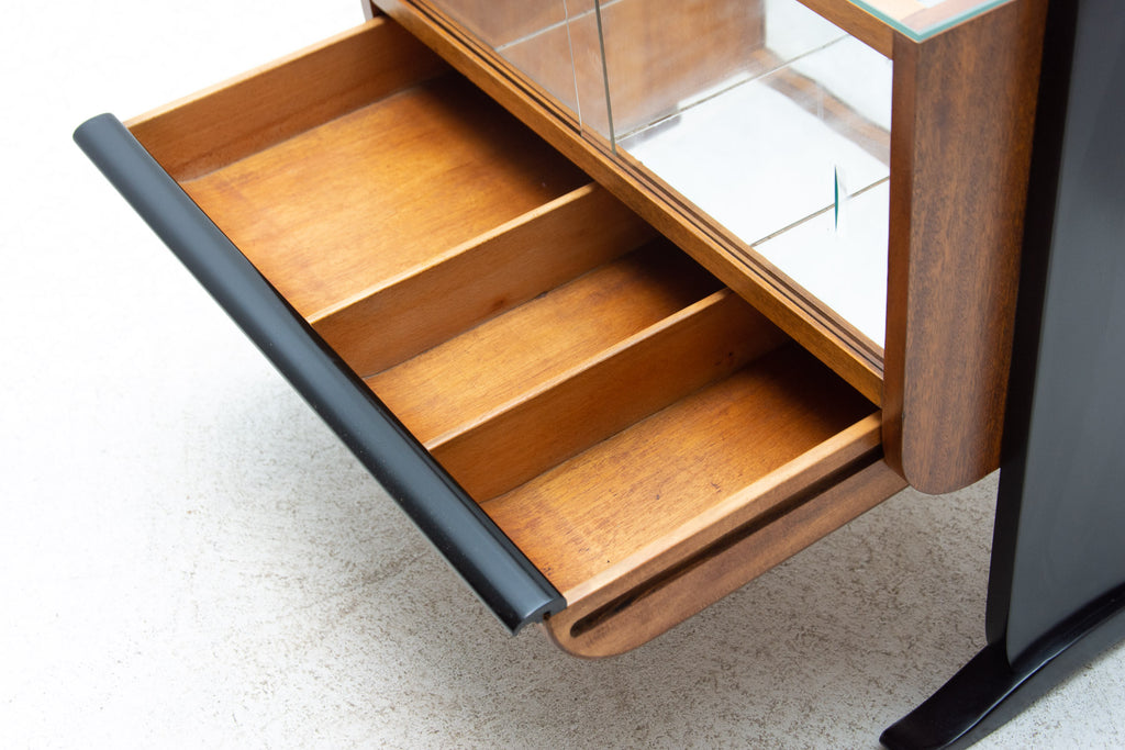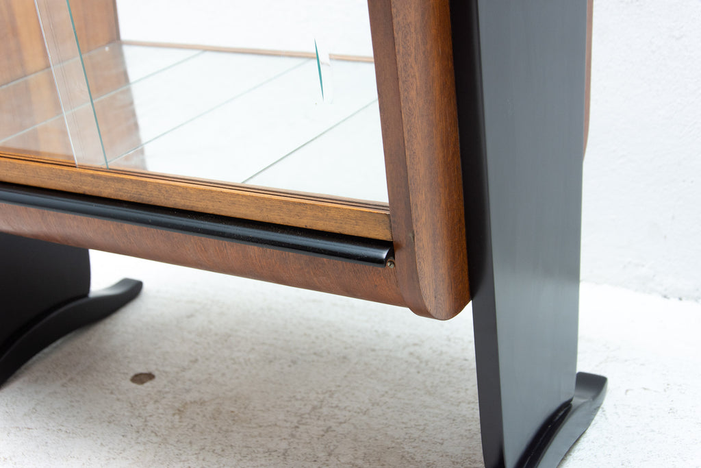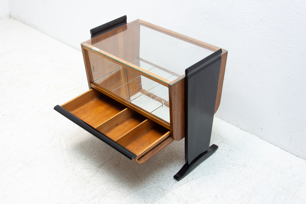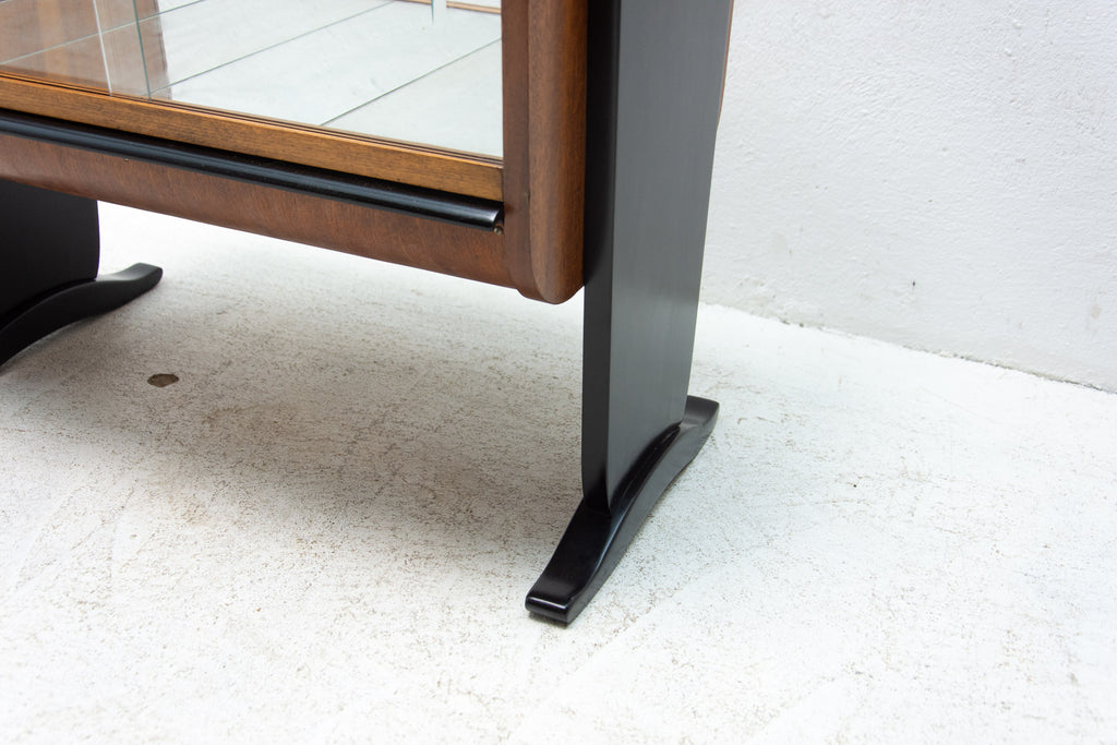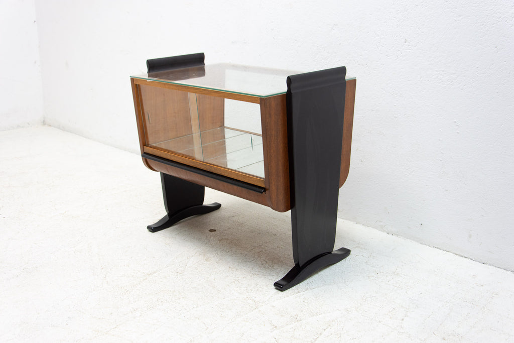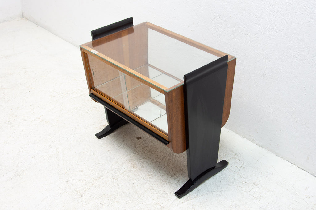 ART DECO glass drinks cabinet/bar, made in Czechoslovakia probably in the 1930´s by the world famous architect Jindrich Halabala and manufactured by UP-Zavody. Made from beech with walnut veneer, black lacquered legs, glass top and doors. Fully functional, in very good condition, completely renovated.