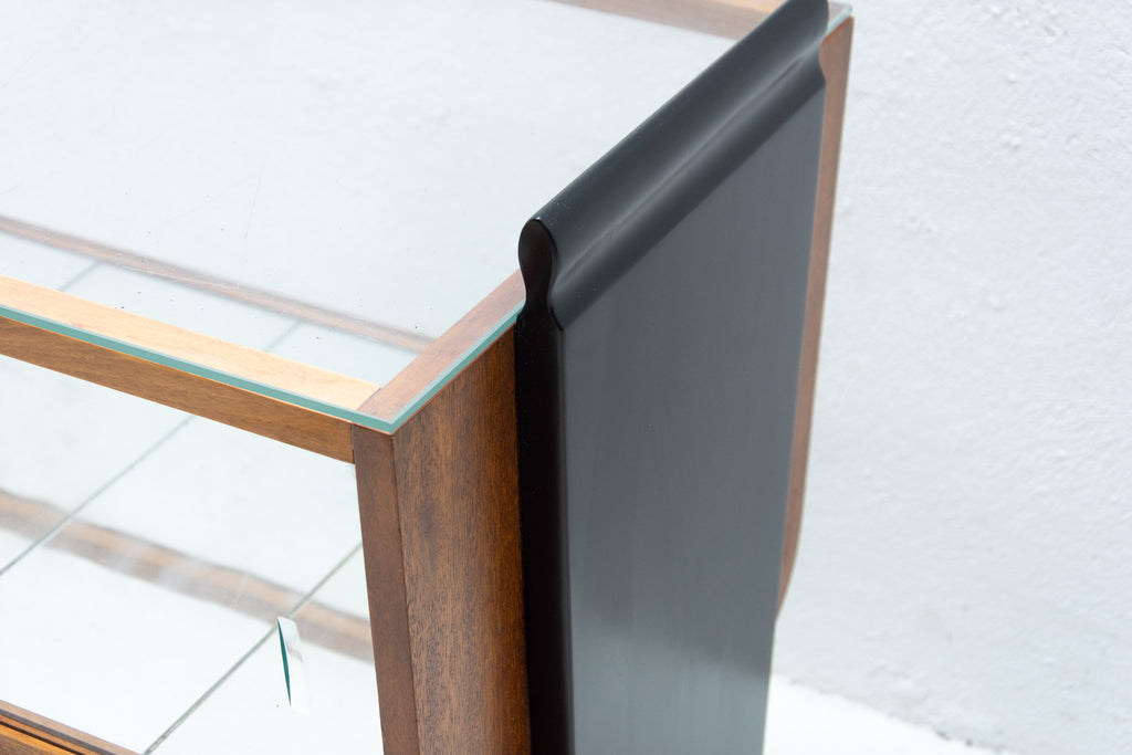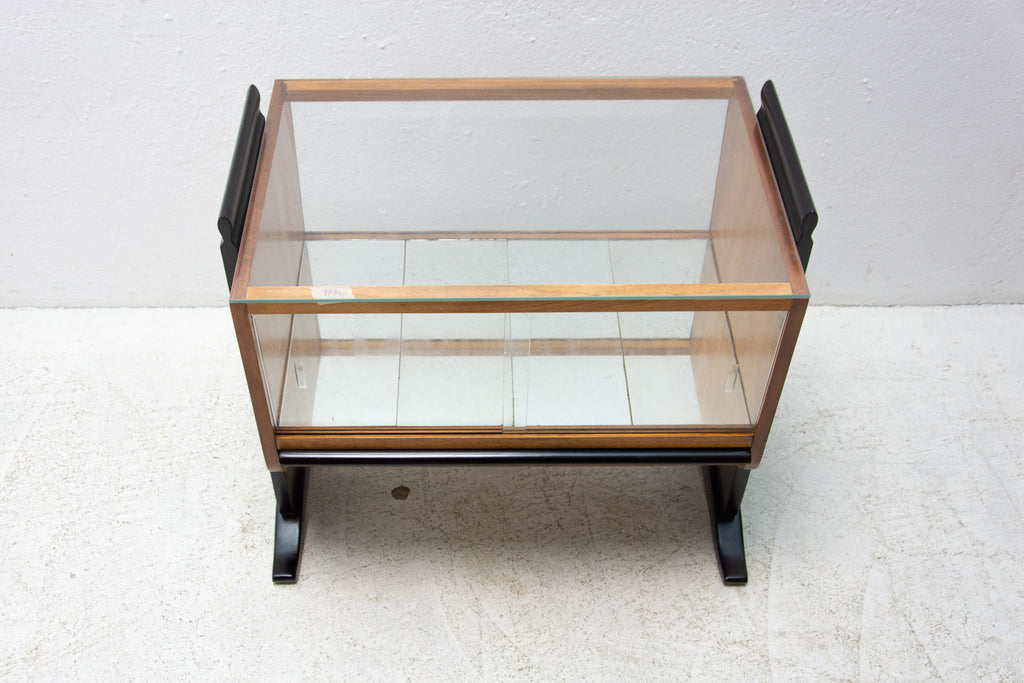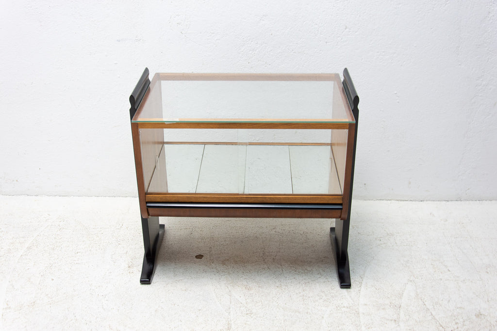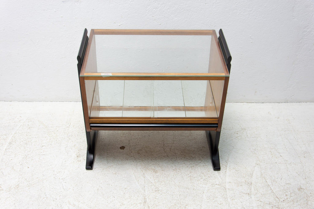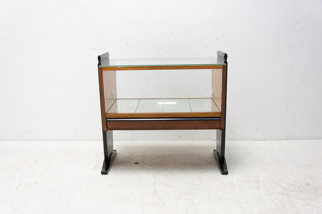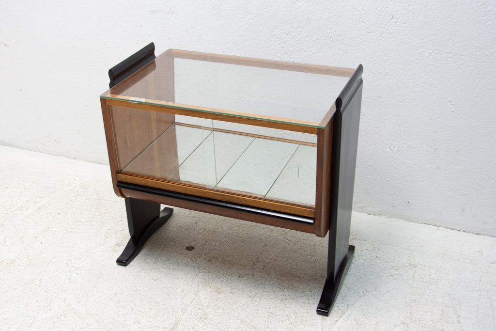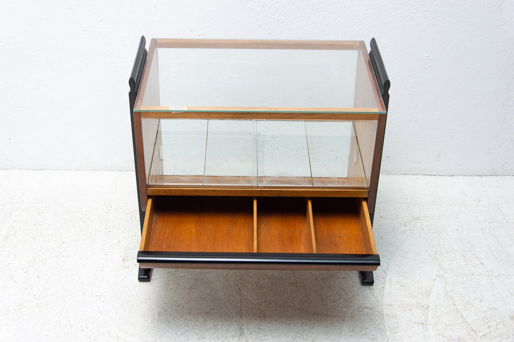 ART DECO glass drinks cabinet/bar, made in Czechoslovakia probably in the 1930´s by the world famous architect Jindrich Halabala and manufactured by UP-Zavody. Made from beech with walnut veneer, black lacquered legs, glass top and doors. Fully functional, in very good condition, completely renovated.