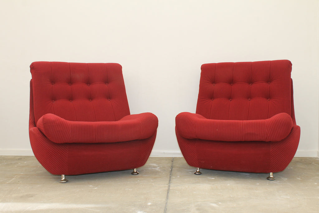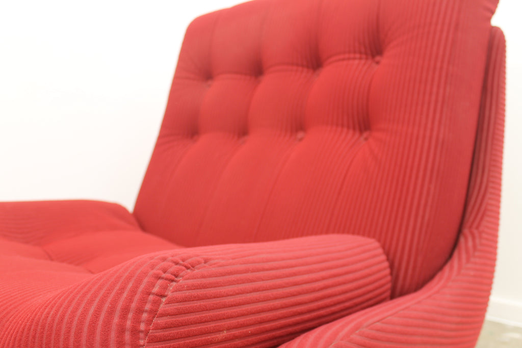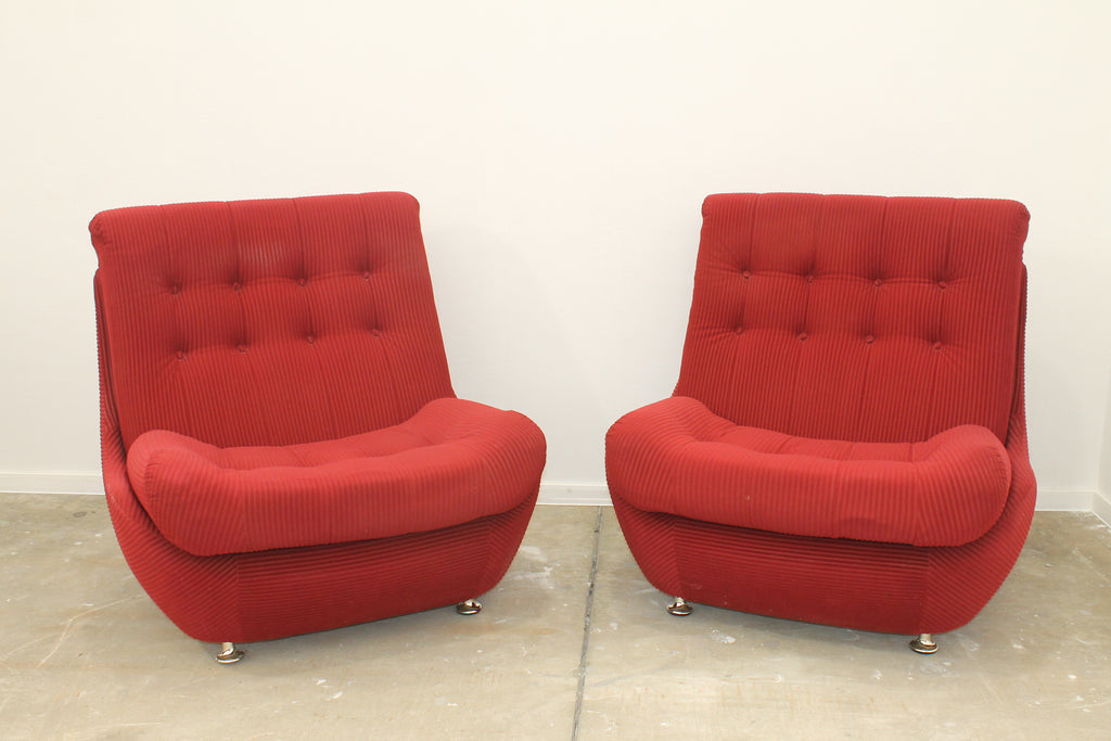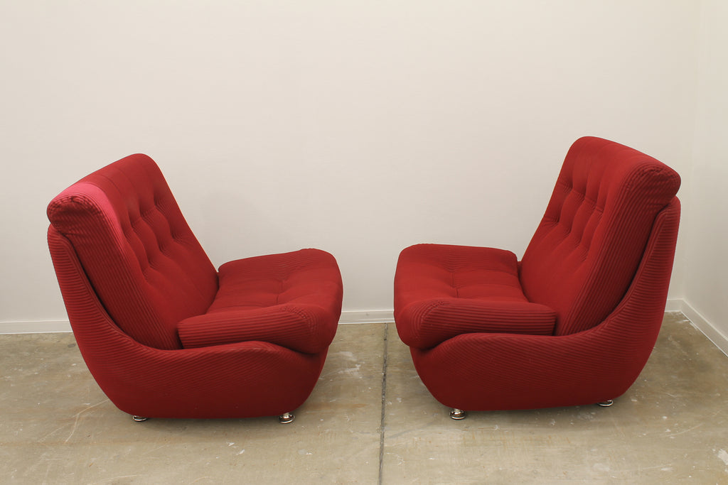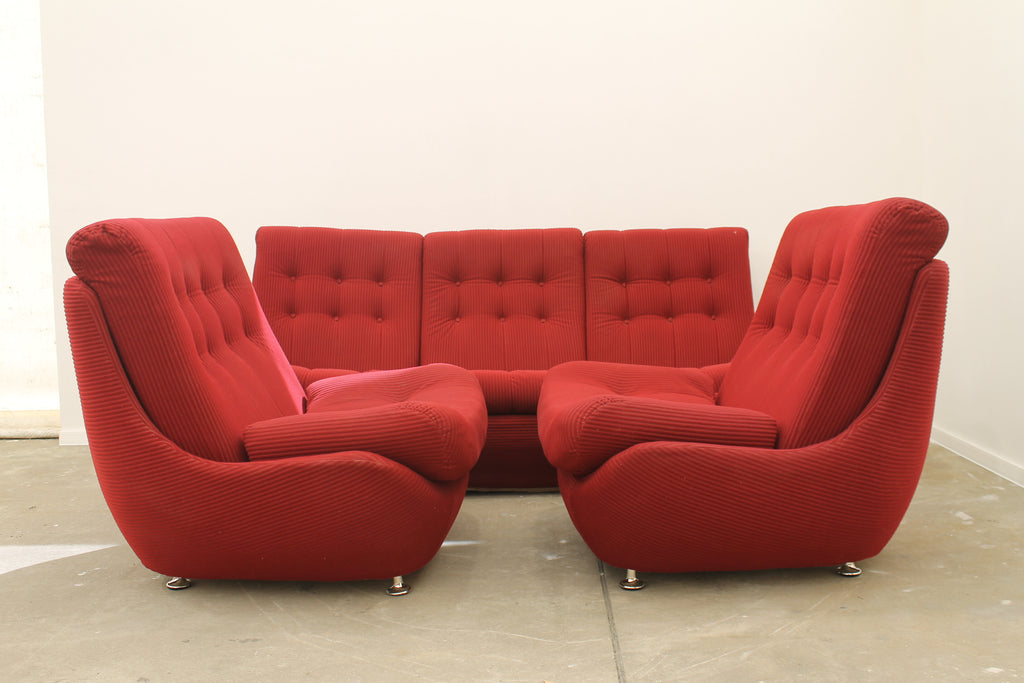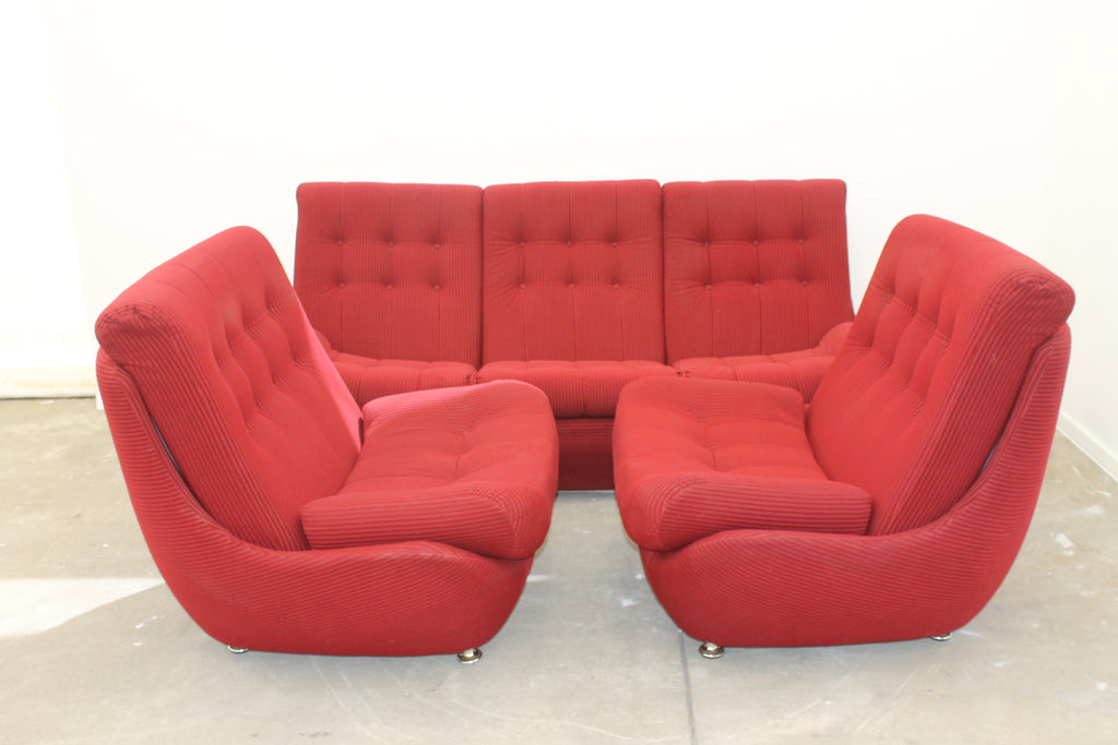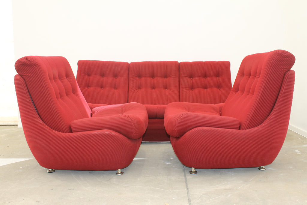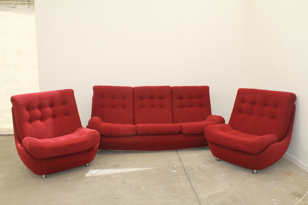 It consists of one sofa and two armchairs on wheels. The set has original crimson fabric. All in very good original condition, showing signs of age and using.