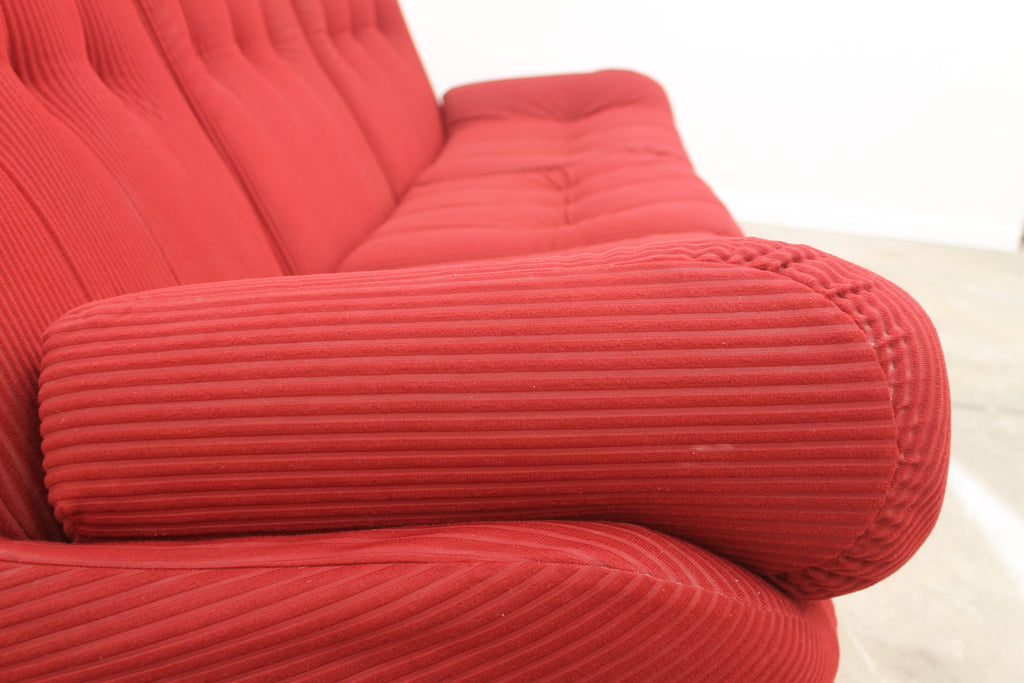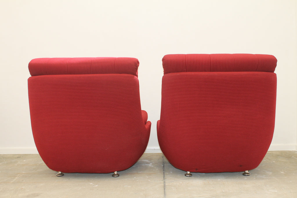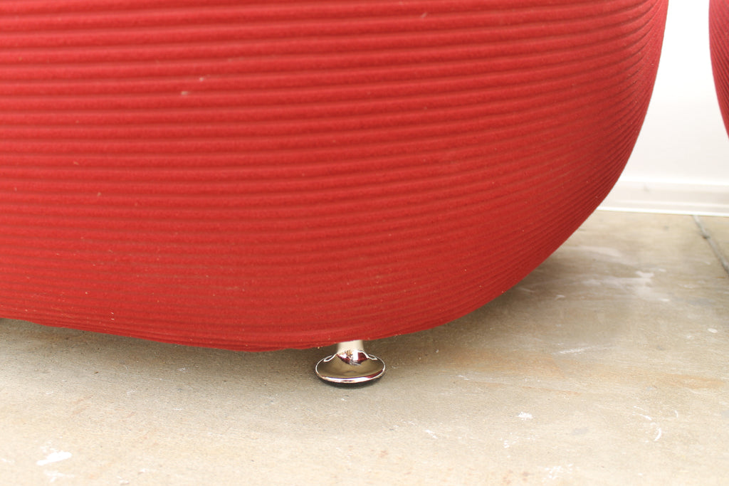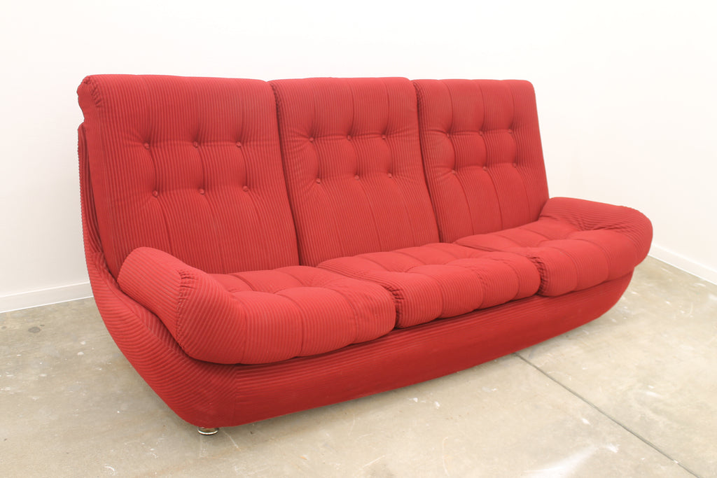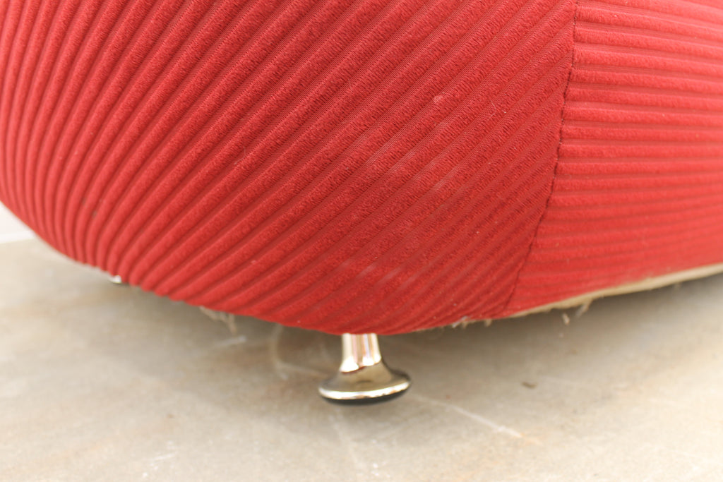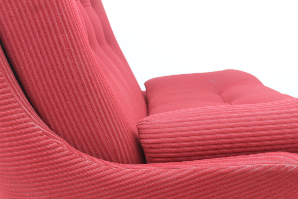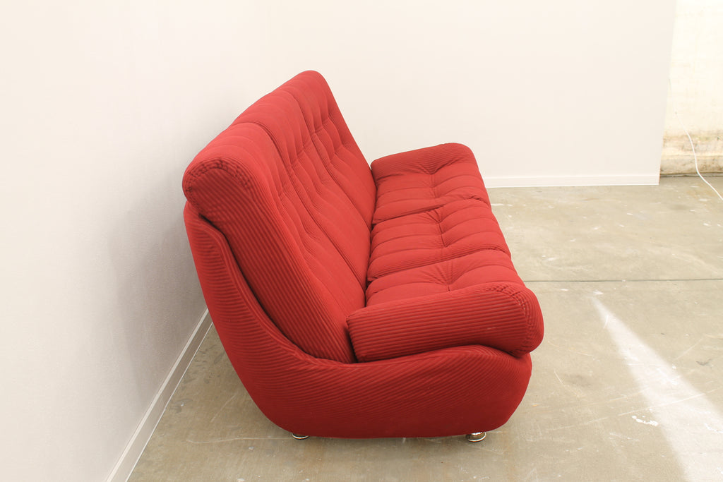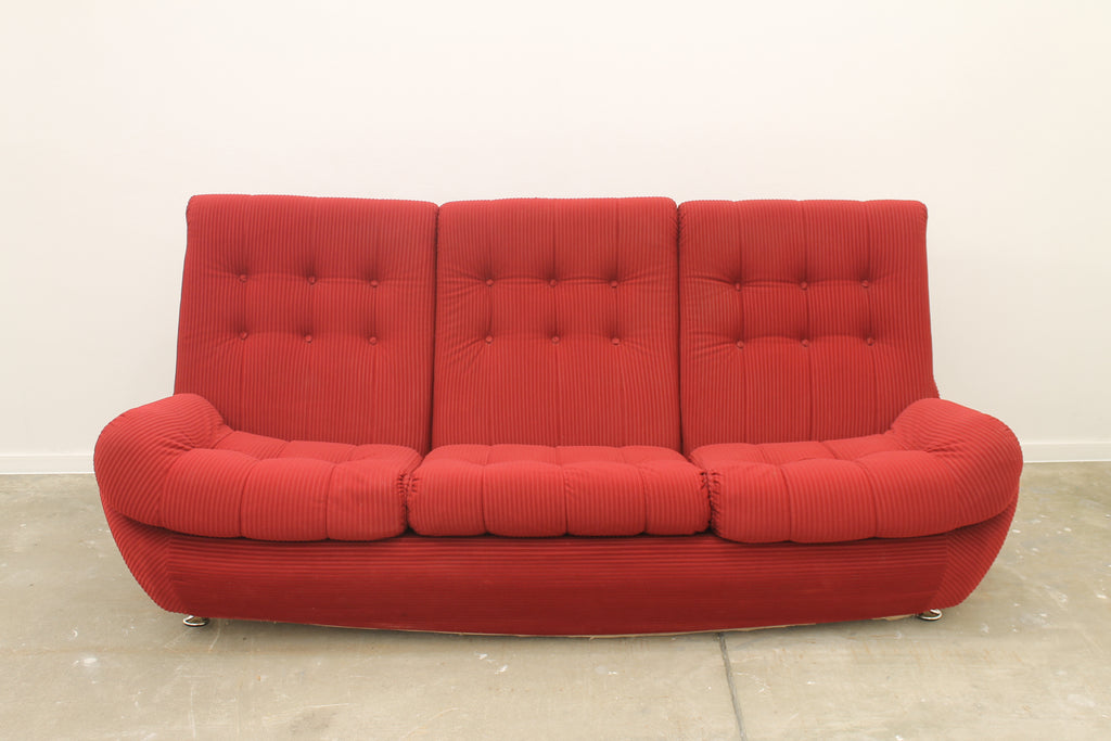 It consists of one sofa and two armchairs on wheels. The set has original crimson fabric. All in very good original condition, showing signs of age and using.