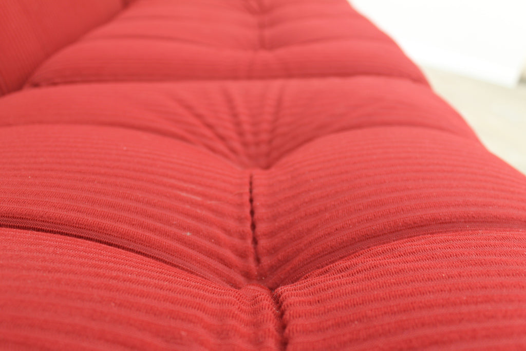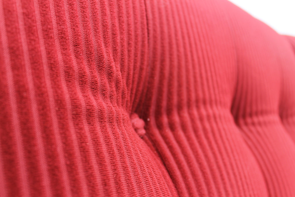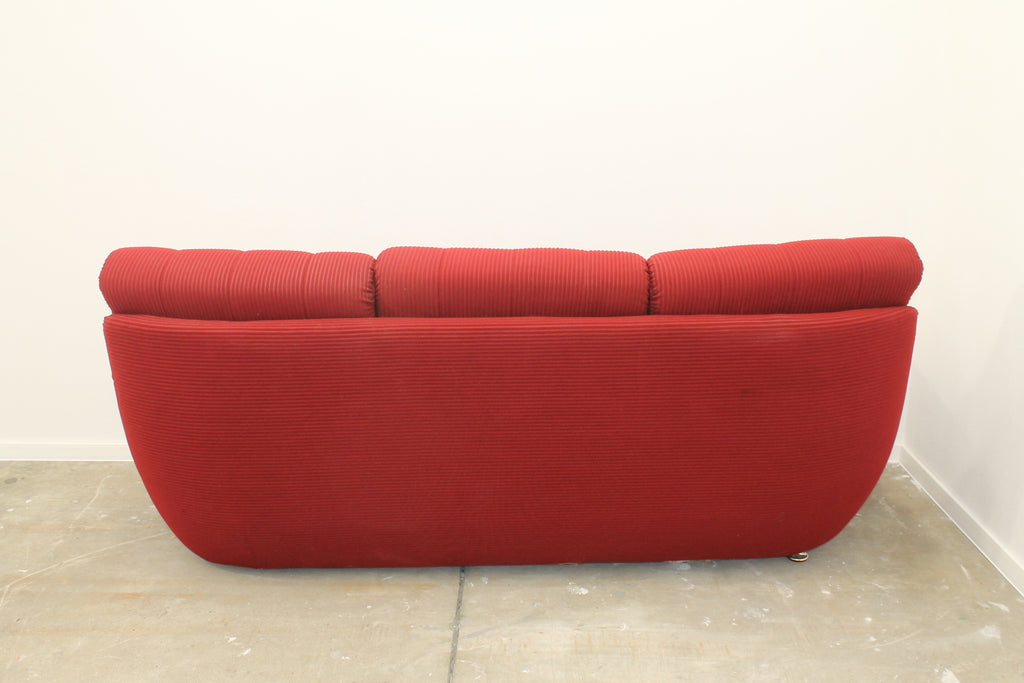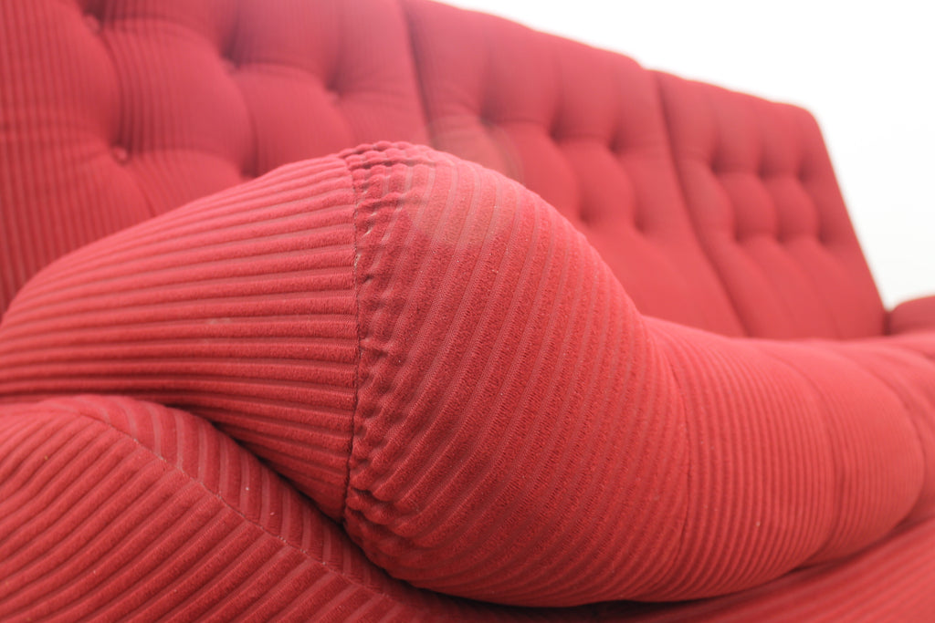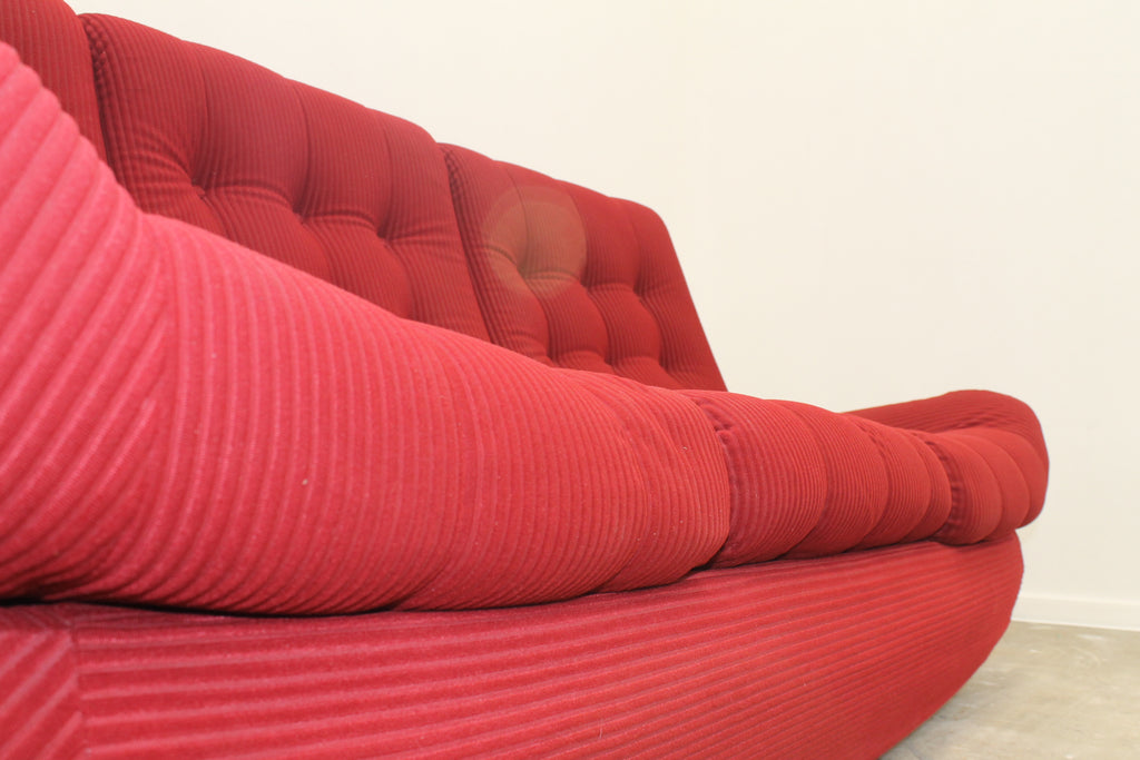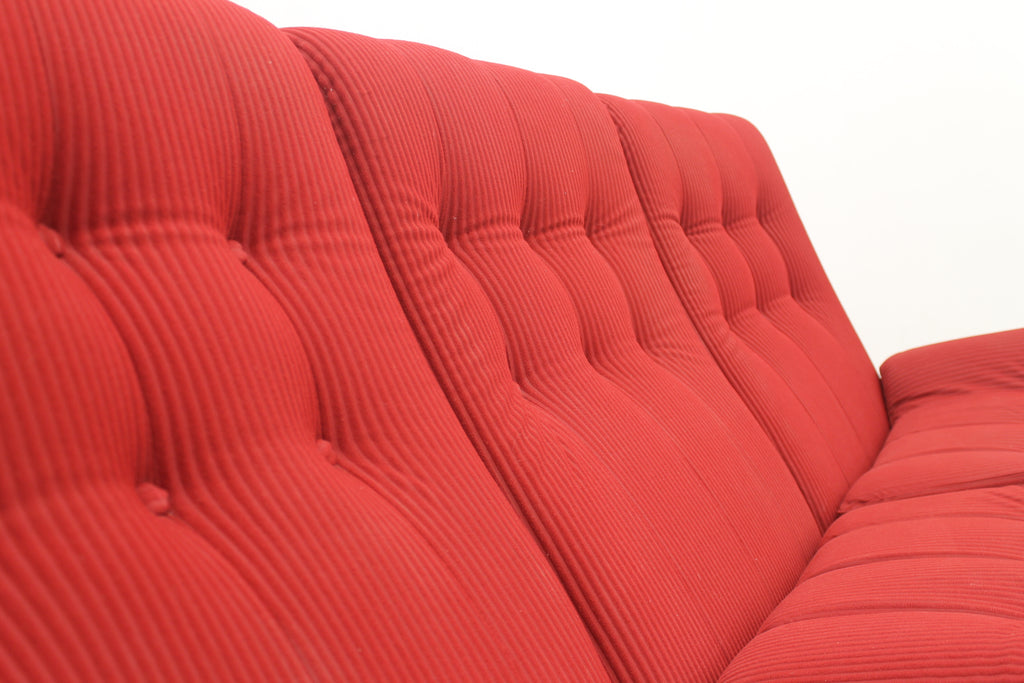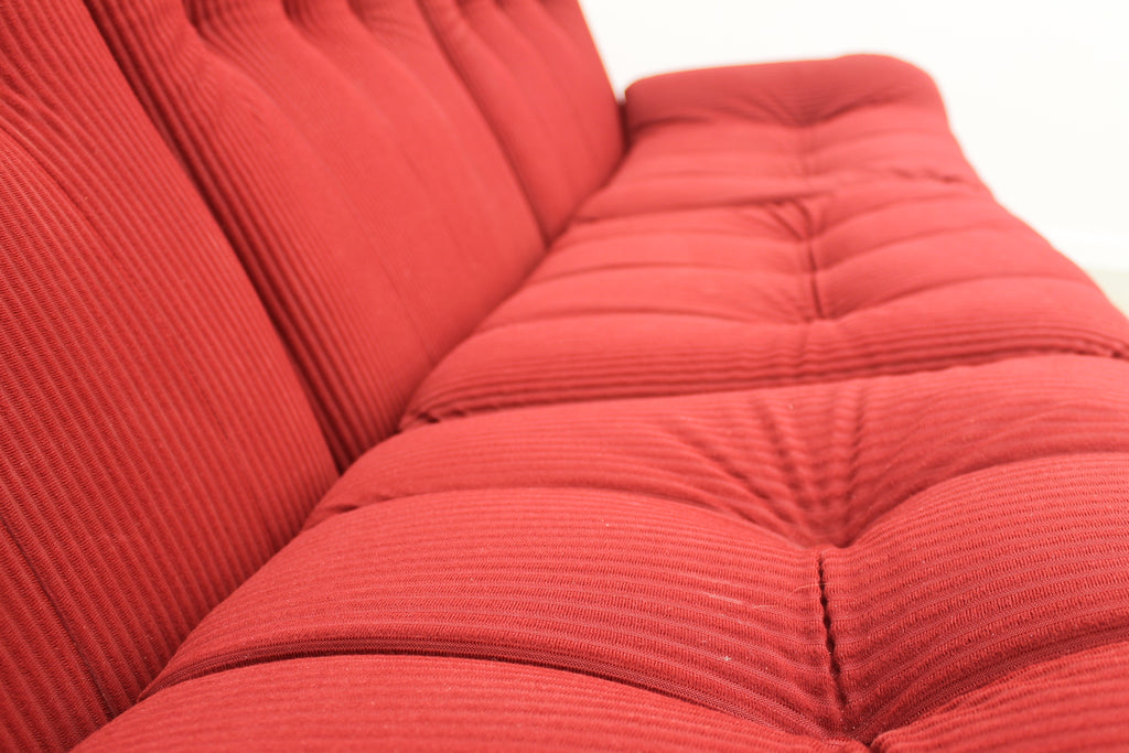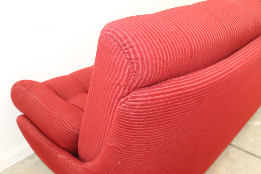 It consists of one sofa and two armchairs on wheels. The set has original crimson fabric. All in very good original condition, showing signs of age and using.