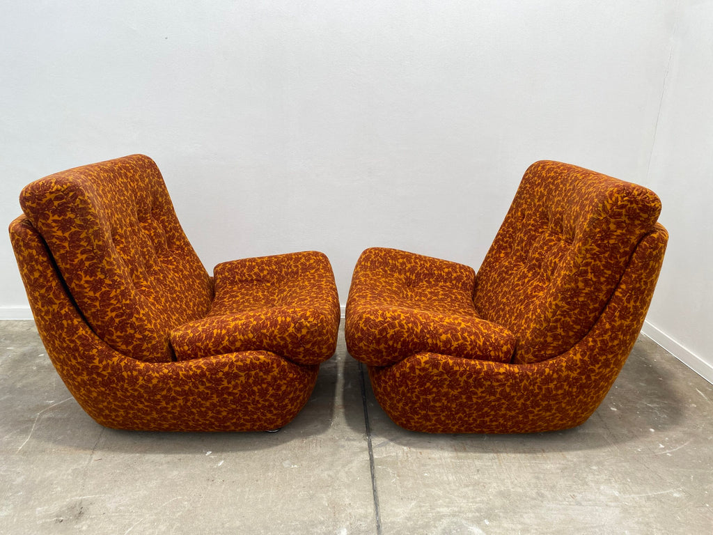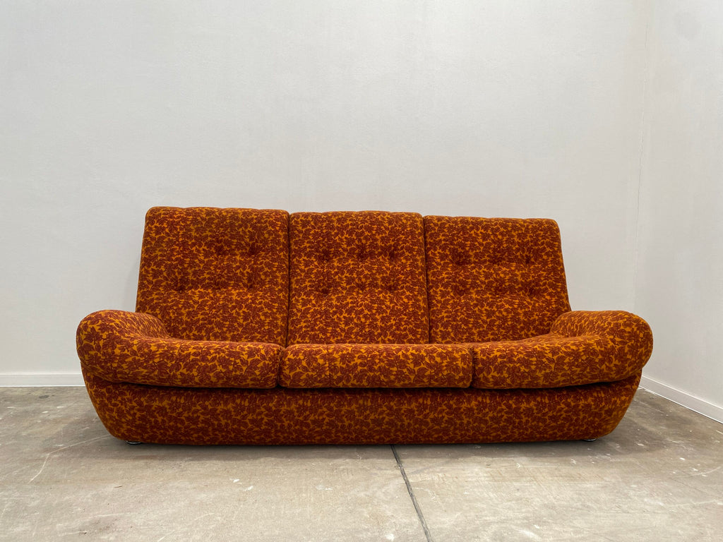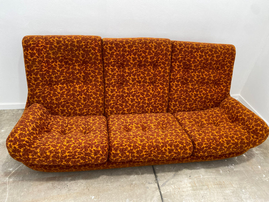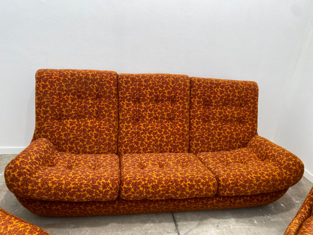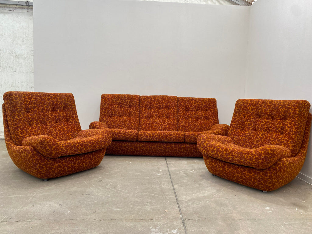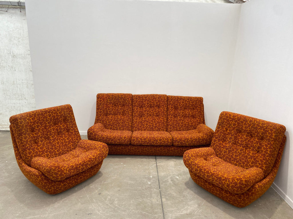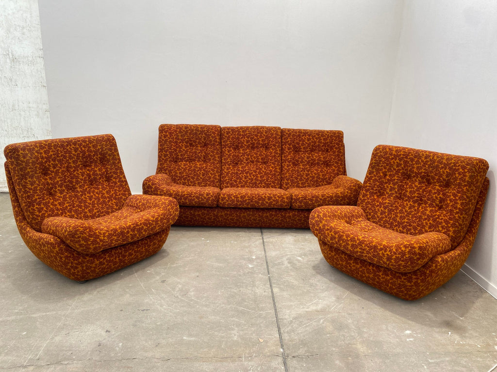 It consists of one sofa and two armchairs on wheels. The set has an original fabric. All in good original condition, showing signs of age and using.