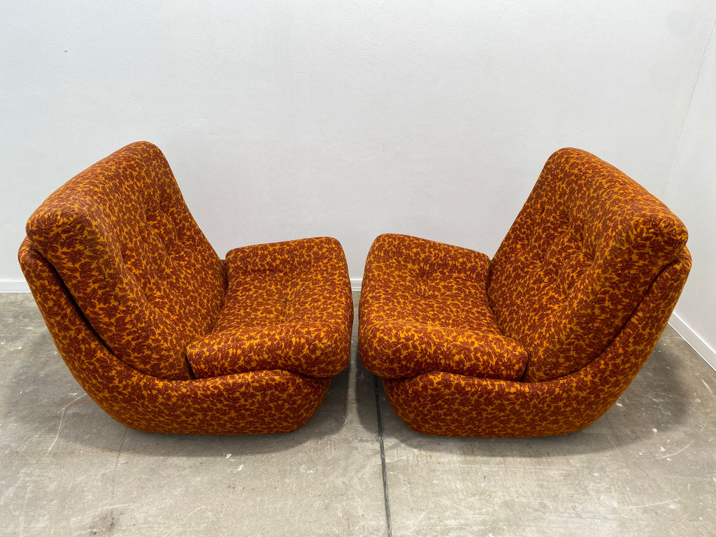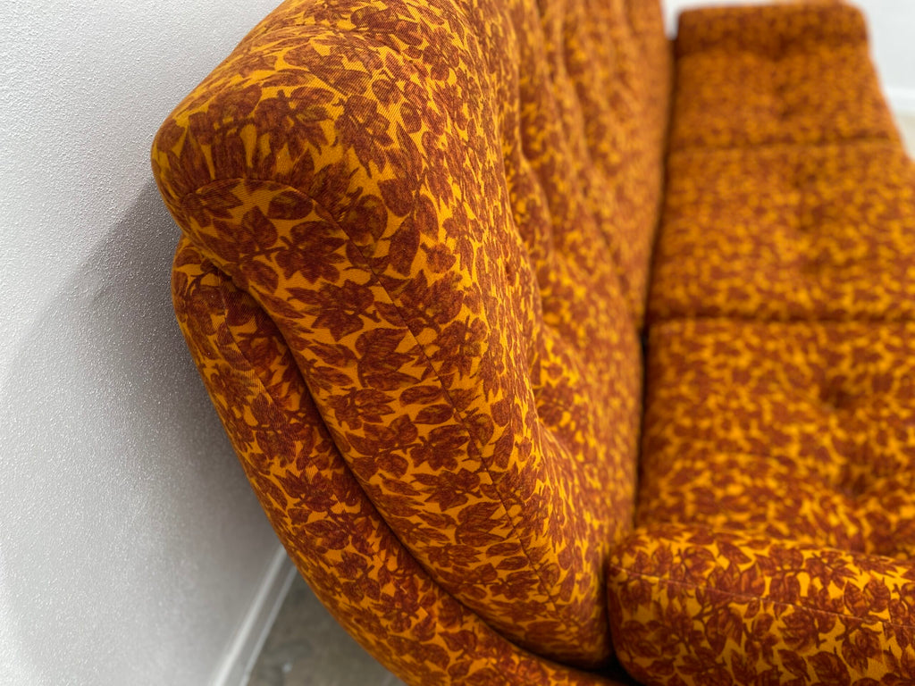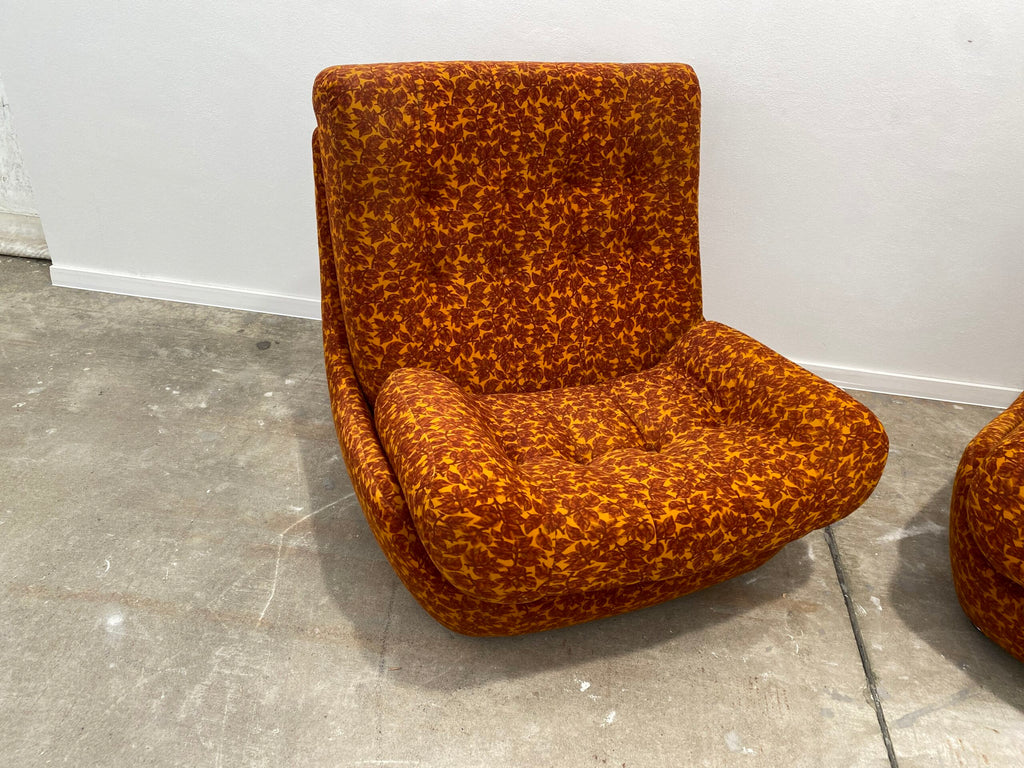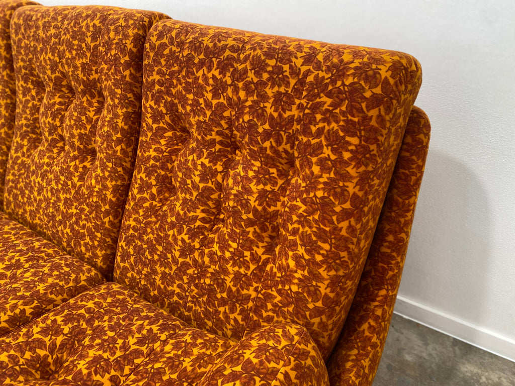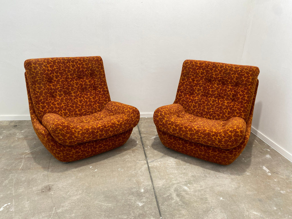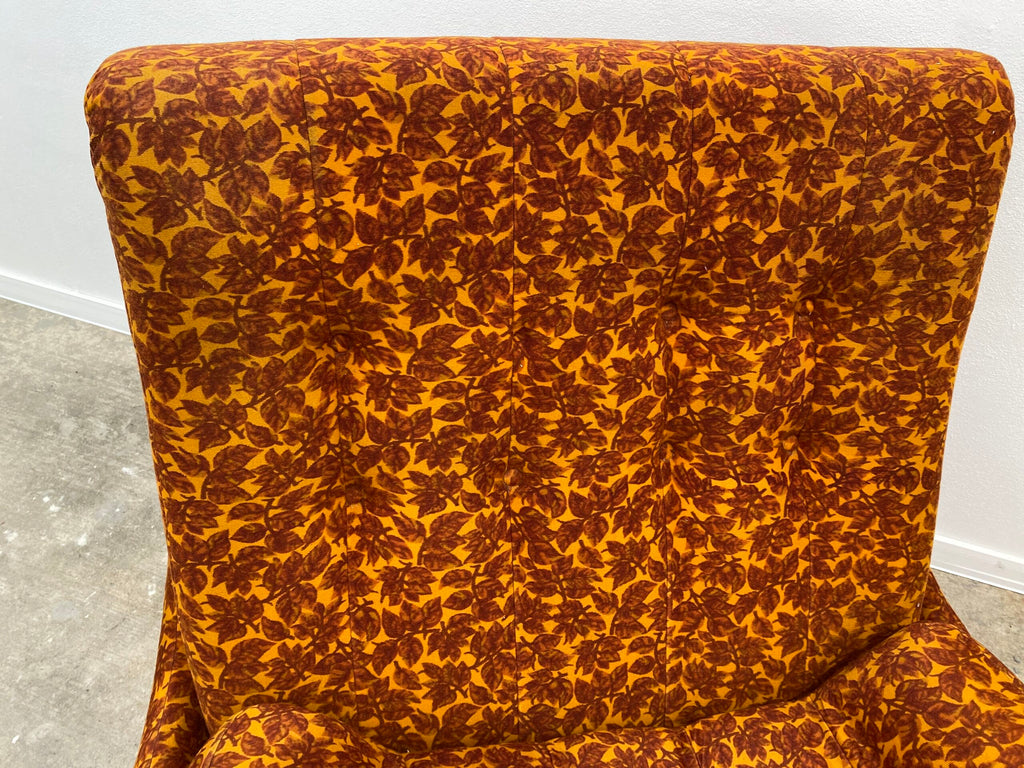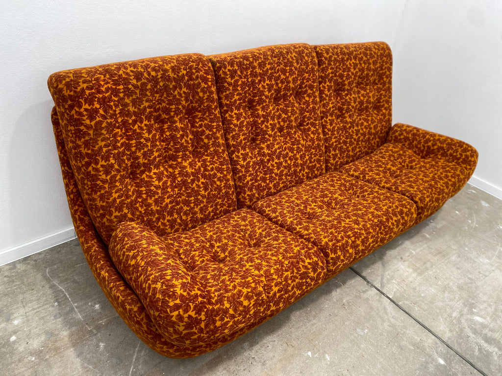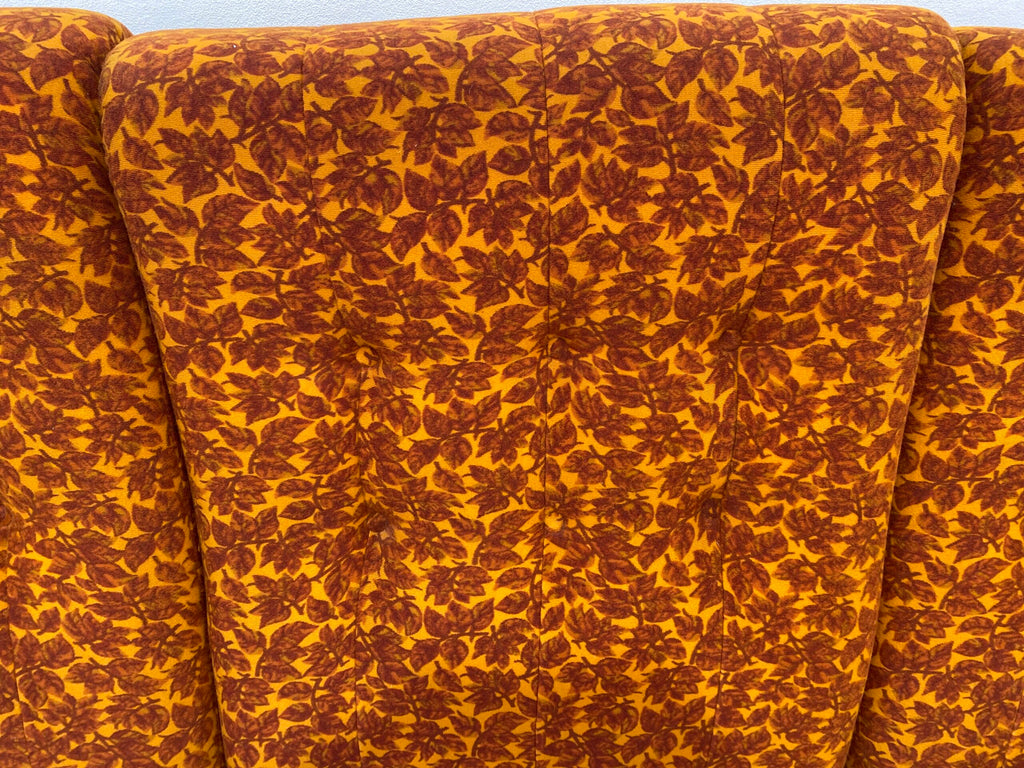 It consists of one sofa and two armchairs on wheels. The set has an original fabric. All in good original condition, showing signs of age and using.