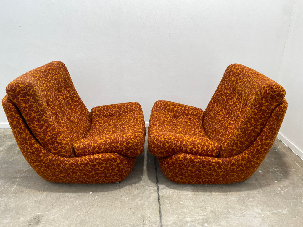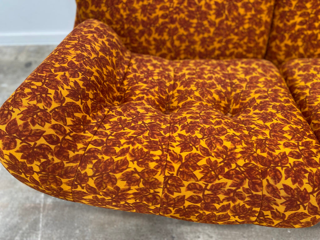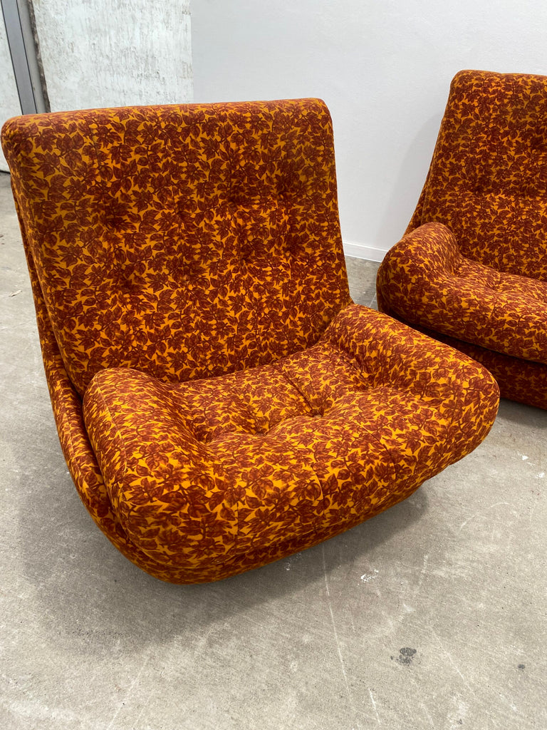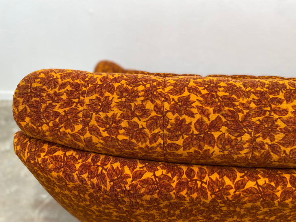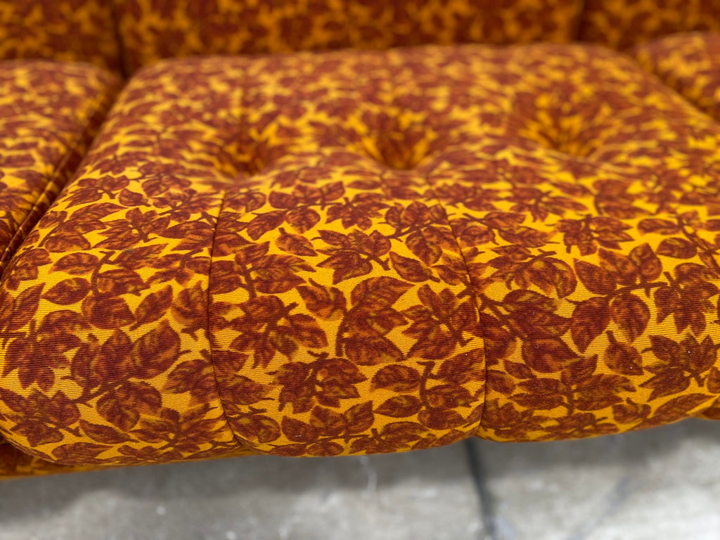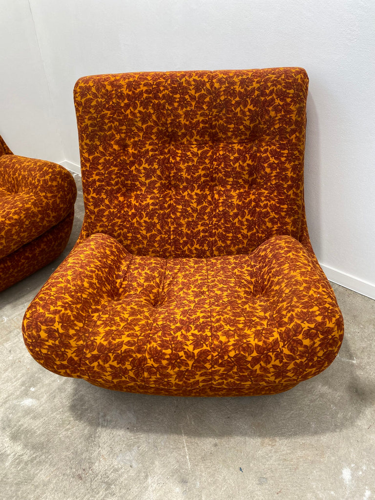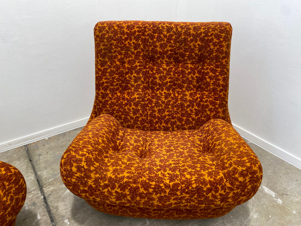 It consists of one sofa and two armchairs on wheels. The set has an original fabric. All in good original condition, showing signs of age and using.