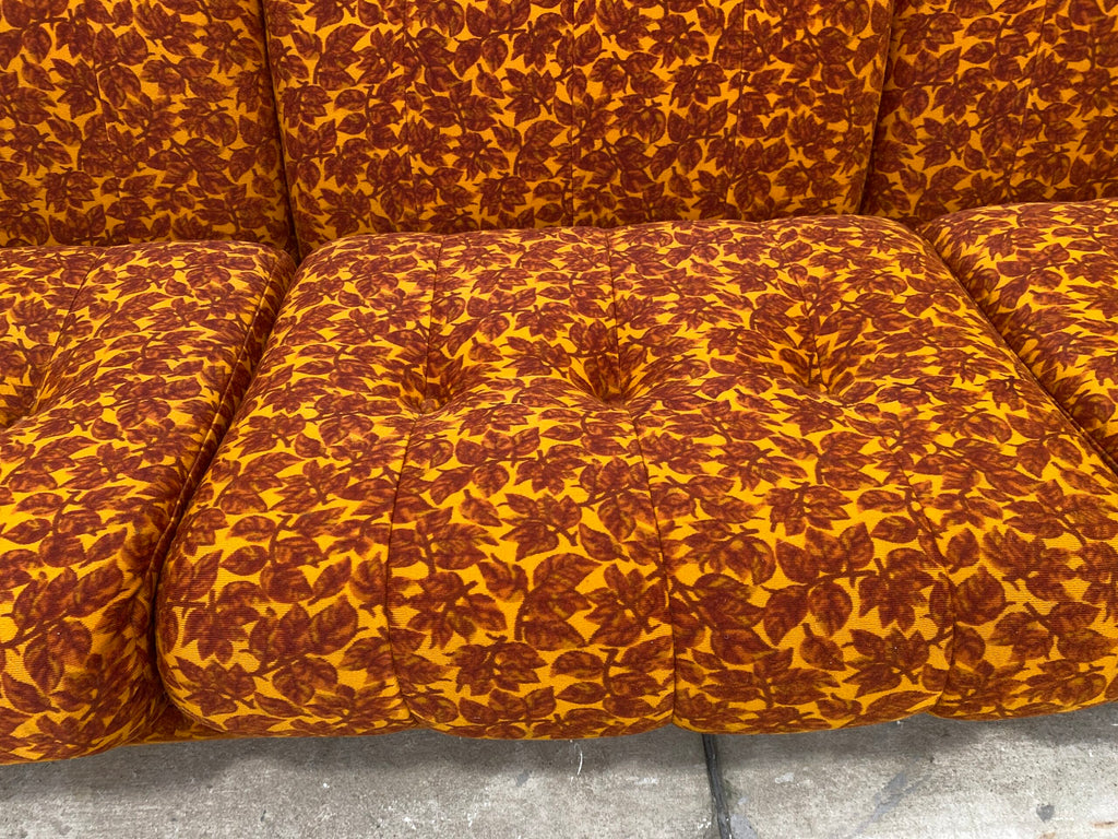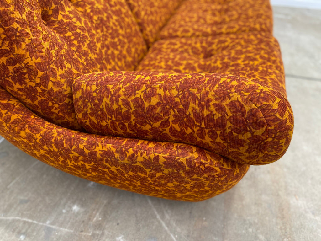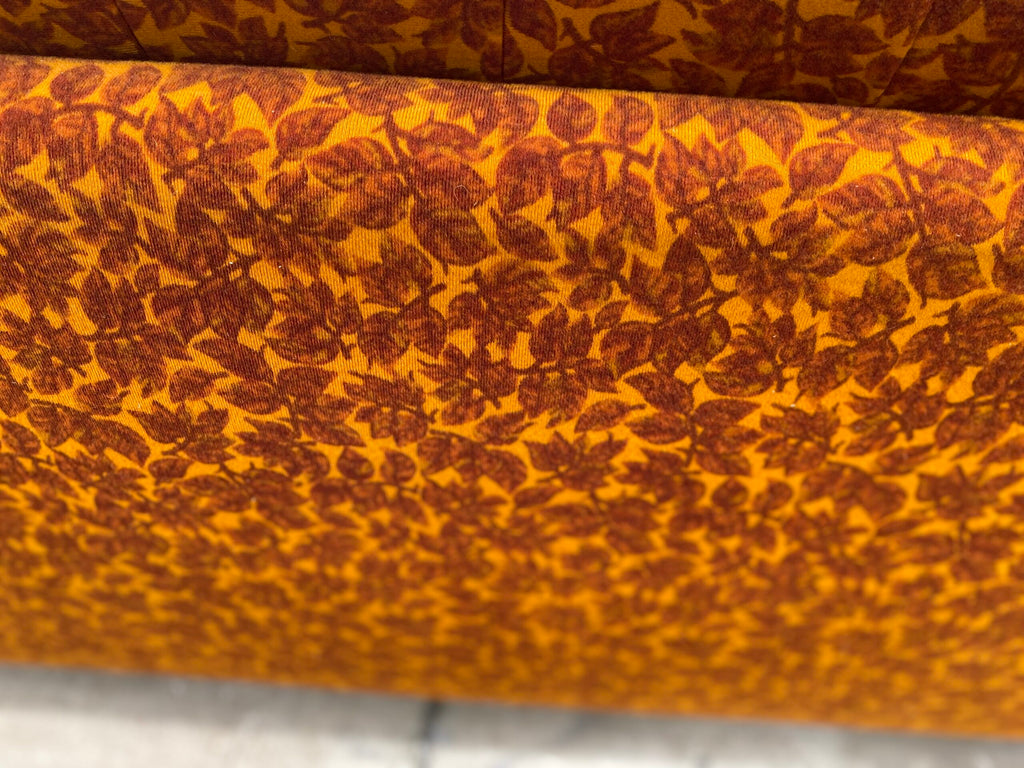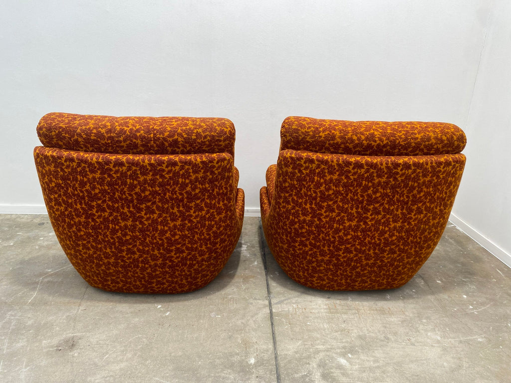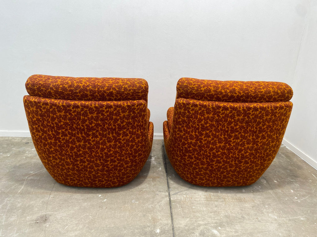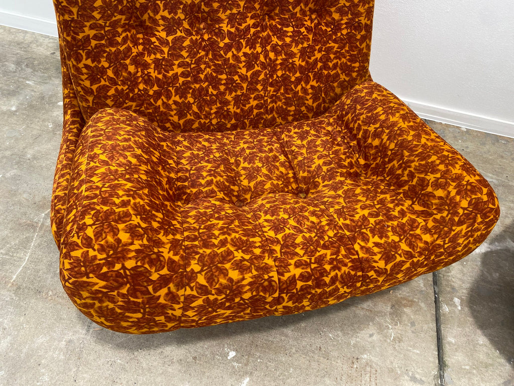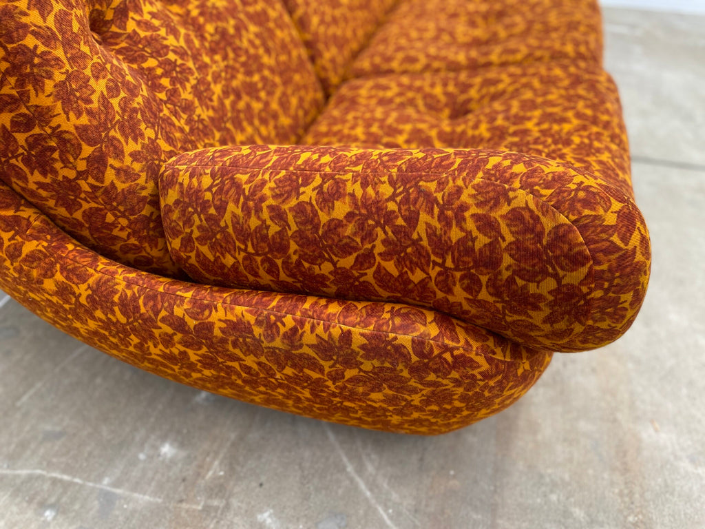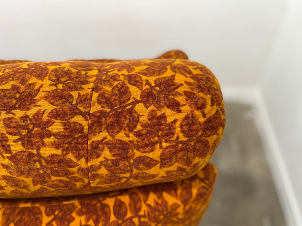It consists of one sofa and two armchairs on wheels. The set has an original fabric. All in good original condition, showing signs of age and using.