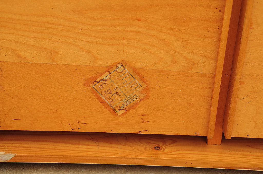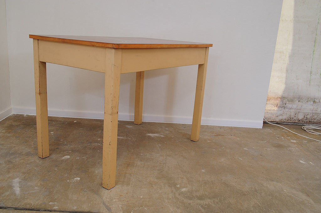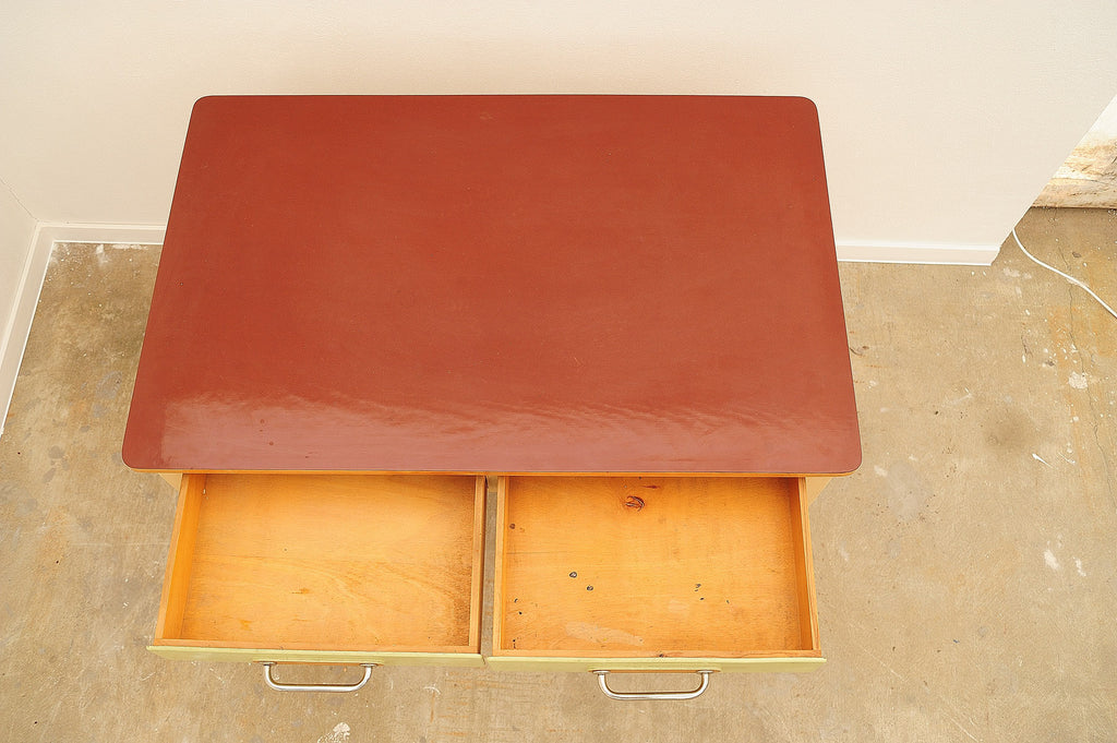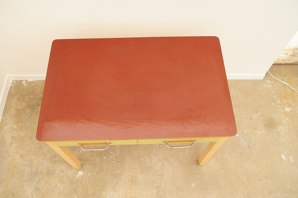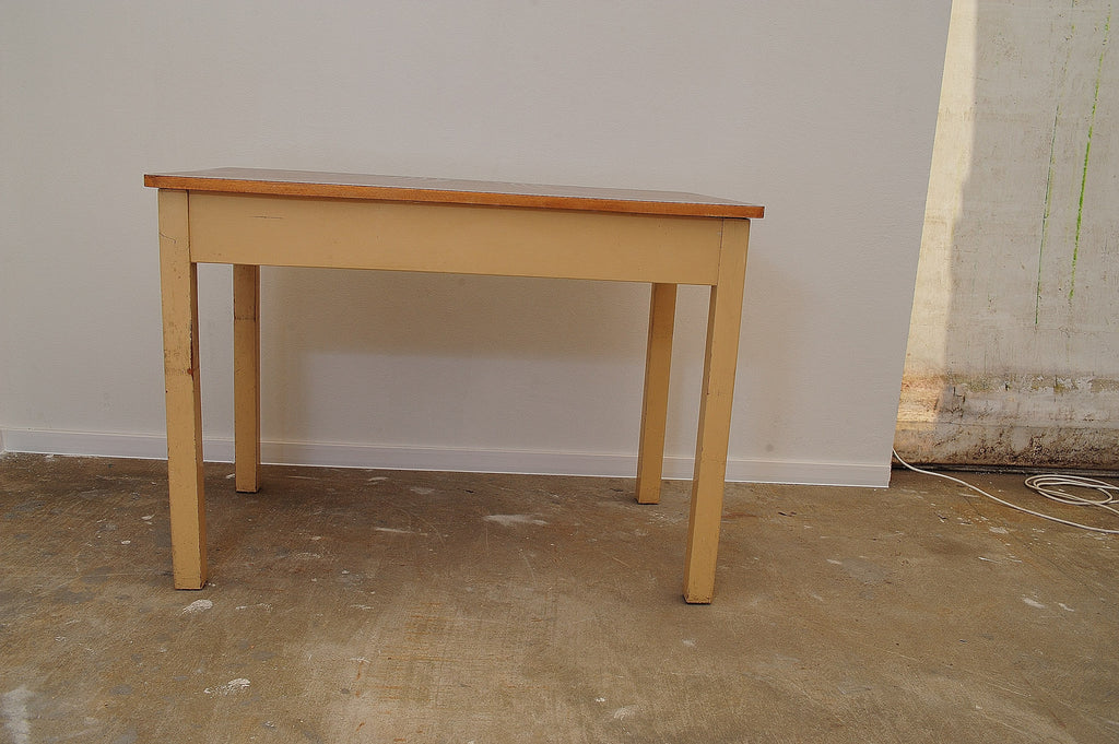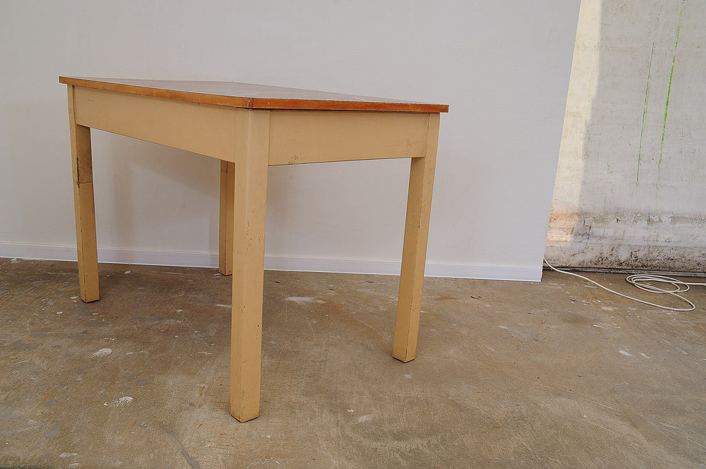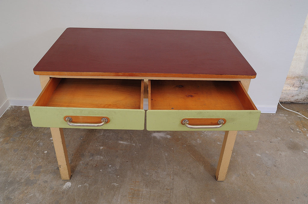 It was made in the former Czechoslovakia in the 1950´s. The table is made of wood and formica and painted in ivory and greenish color. Overall is in good Vintage condition, shows signs of age and using.