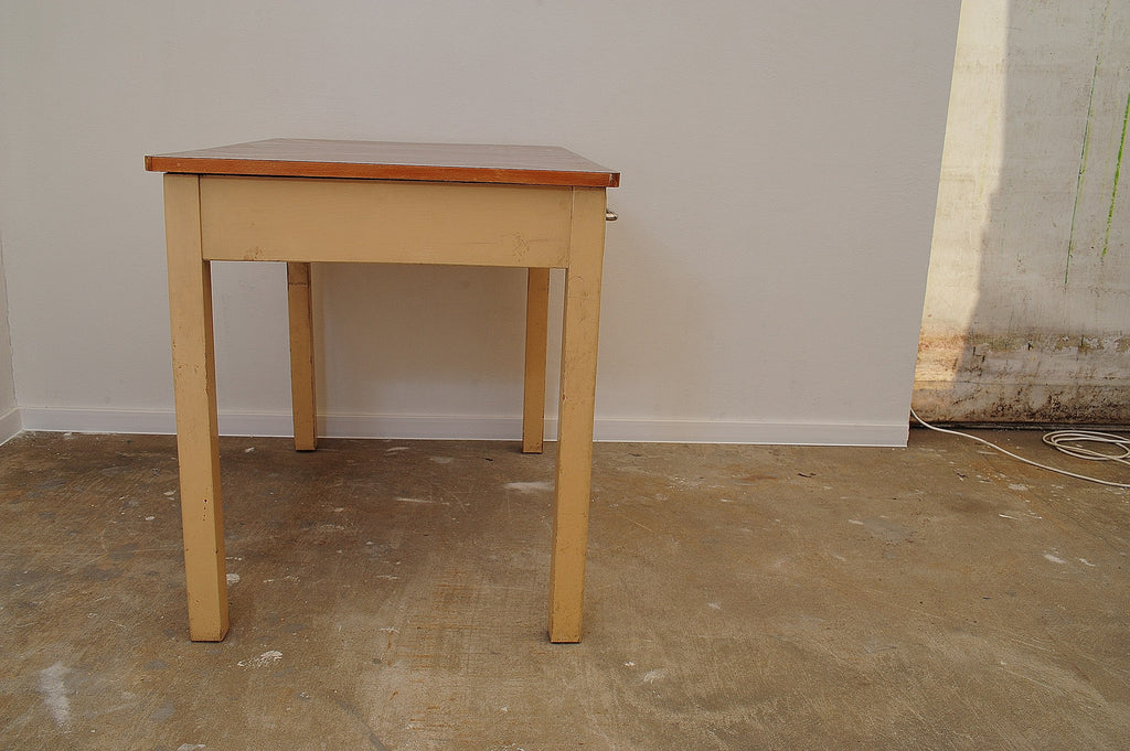 Mid century kitchen table with one drawer with a chrome handle as an interesting design element.