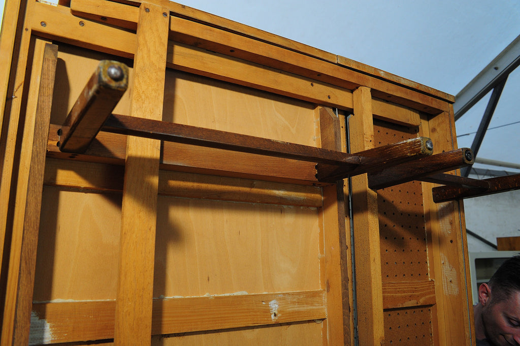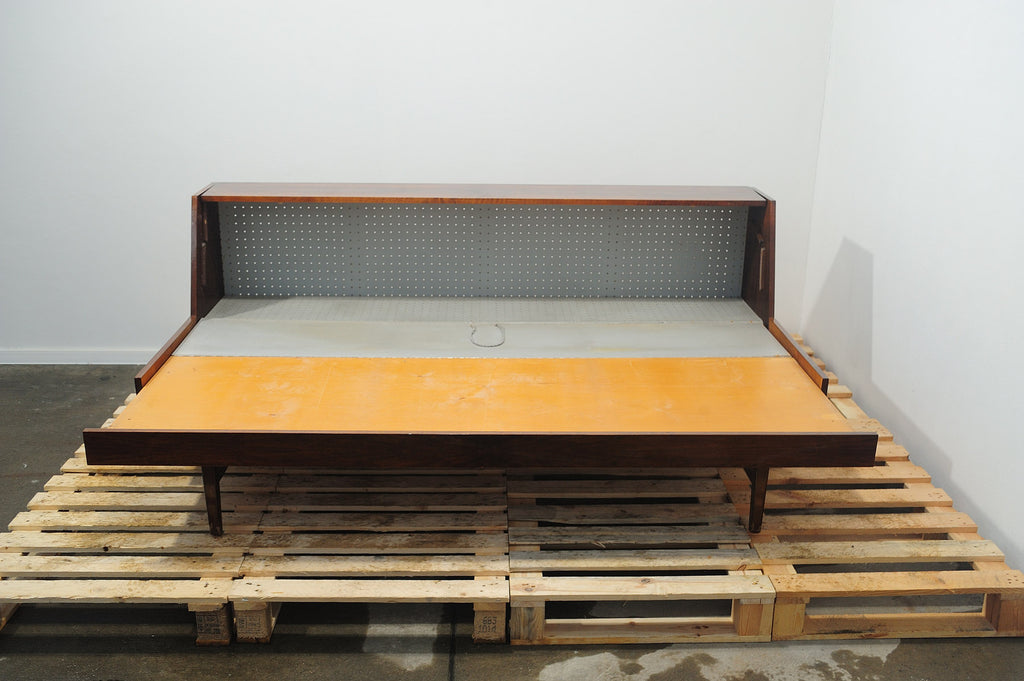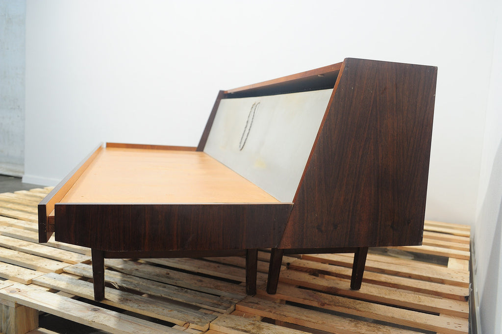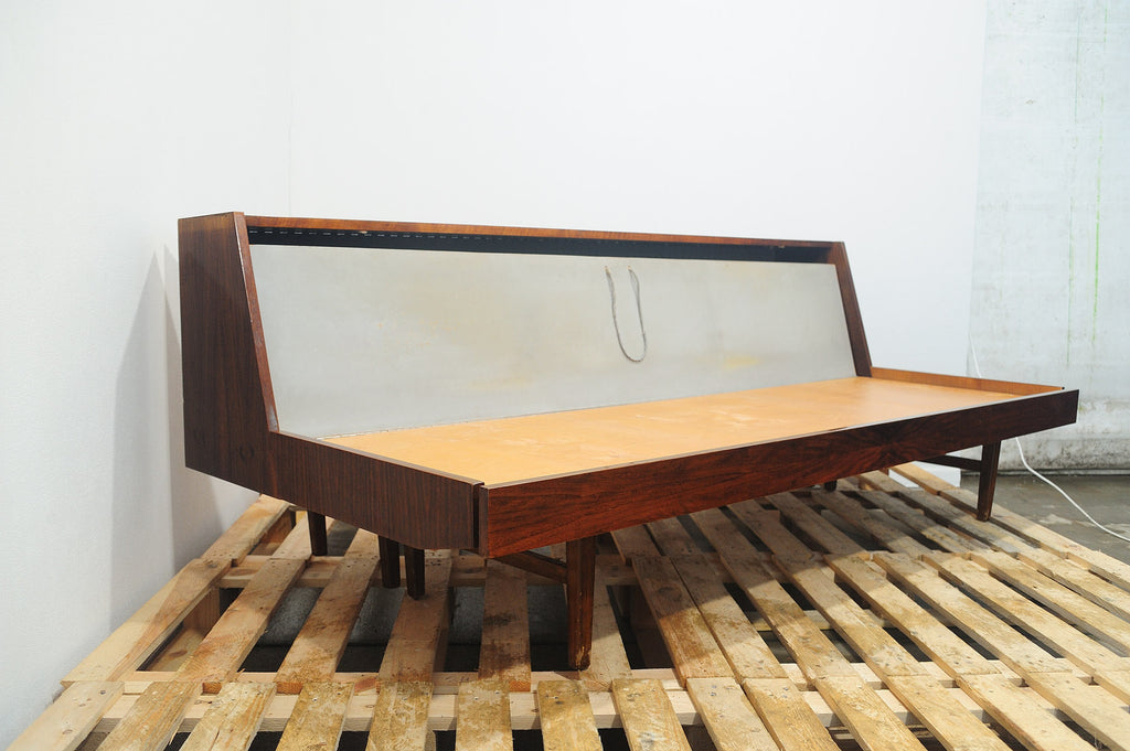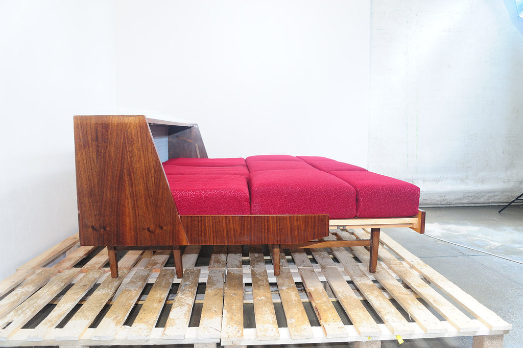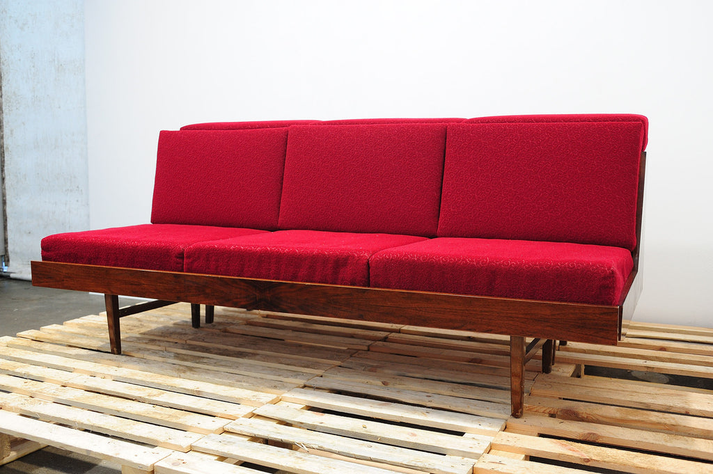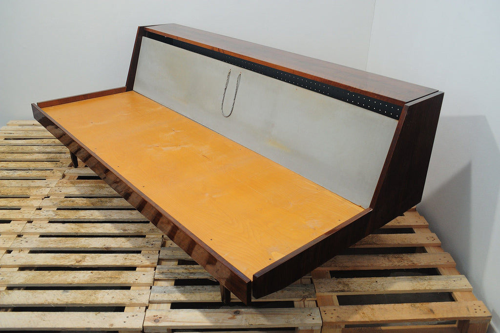 Midcentury sofa bed, made by Mier Topolčany company in the former Czechoslovakia in the 1970s. The sofa has a wooden structure with walnut veneer and it´s in very good Vintage condition, shows slight signs of age and using.