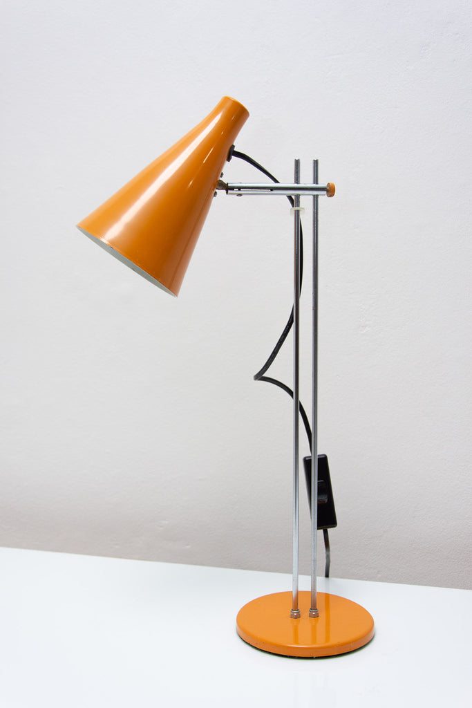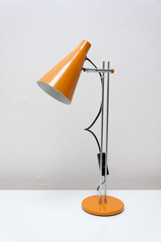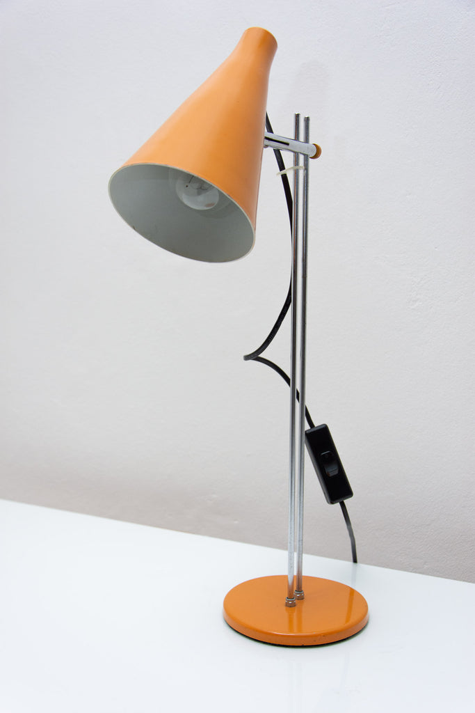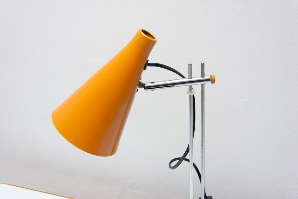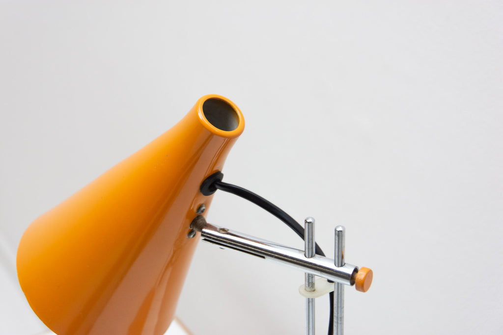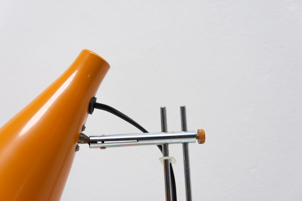 Mid century table lamp was designed by Josef Hurka for Napako. It features a chrome construction to which an orange cone-shaped shade is attached. Other material: aluminum, plastic. Fully functional, newly wired, the lamp is in very good condition.