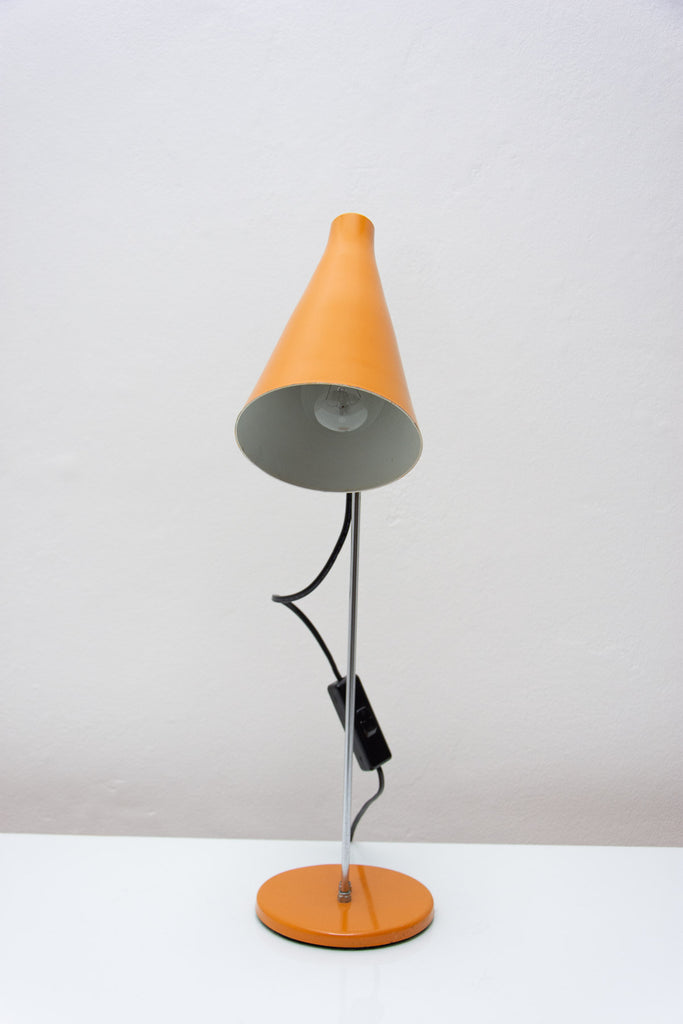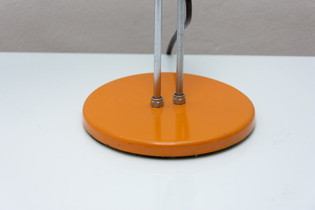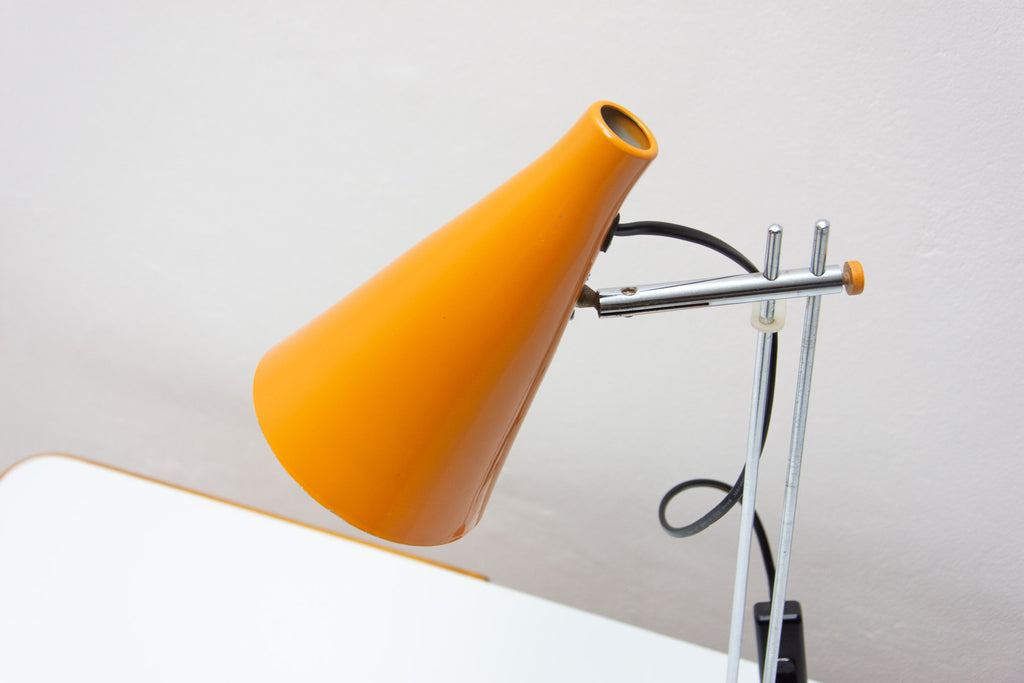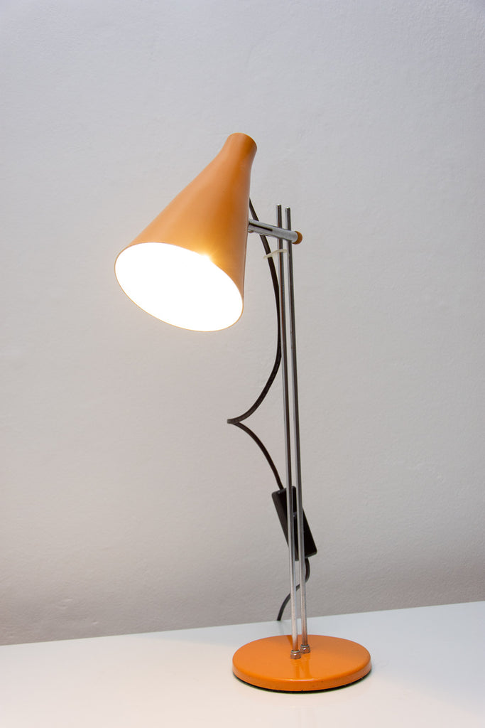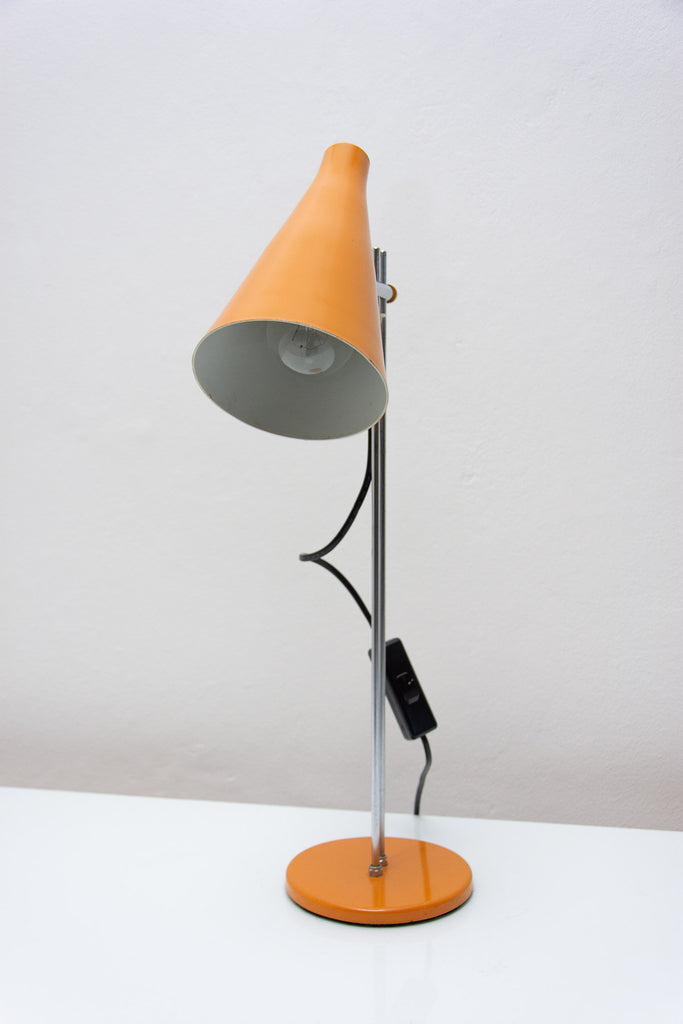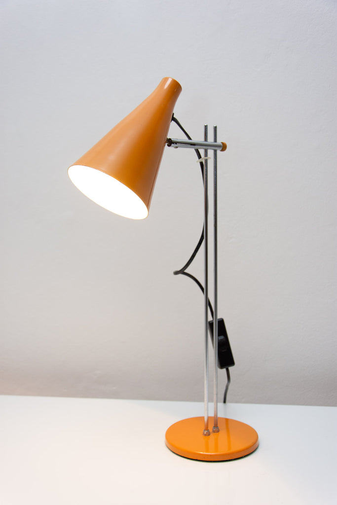 Mid century table lamp was designed by Josef Hurka for Napako. It features a chrome construction to which an orange cone-shaped shade is attached. Other material: aluminum, plastic. Fully functional, newly wired, the lamp is in very good condition.