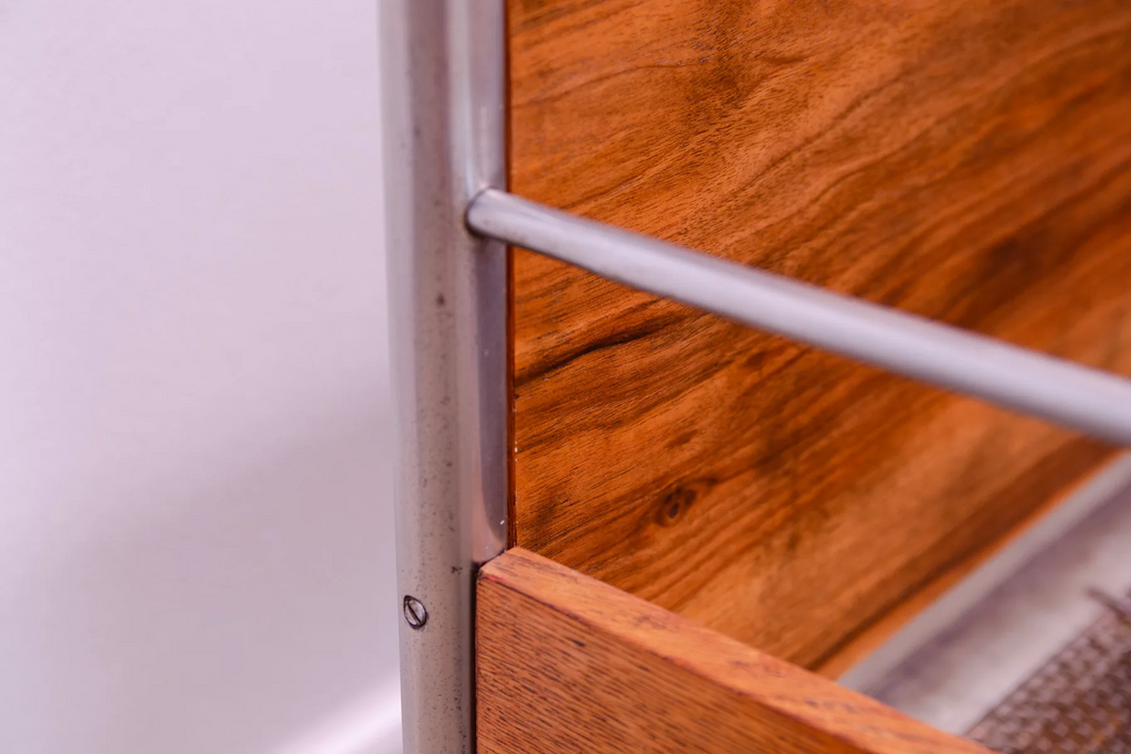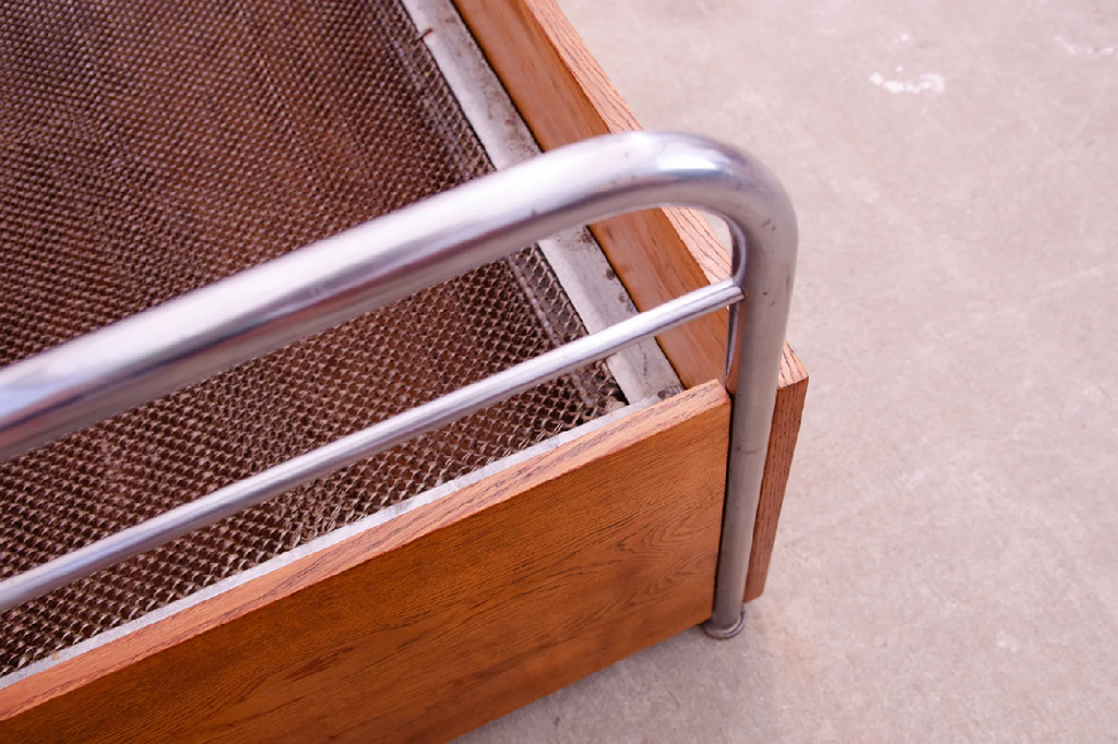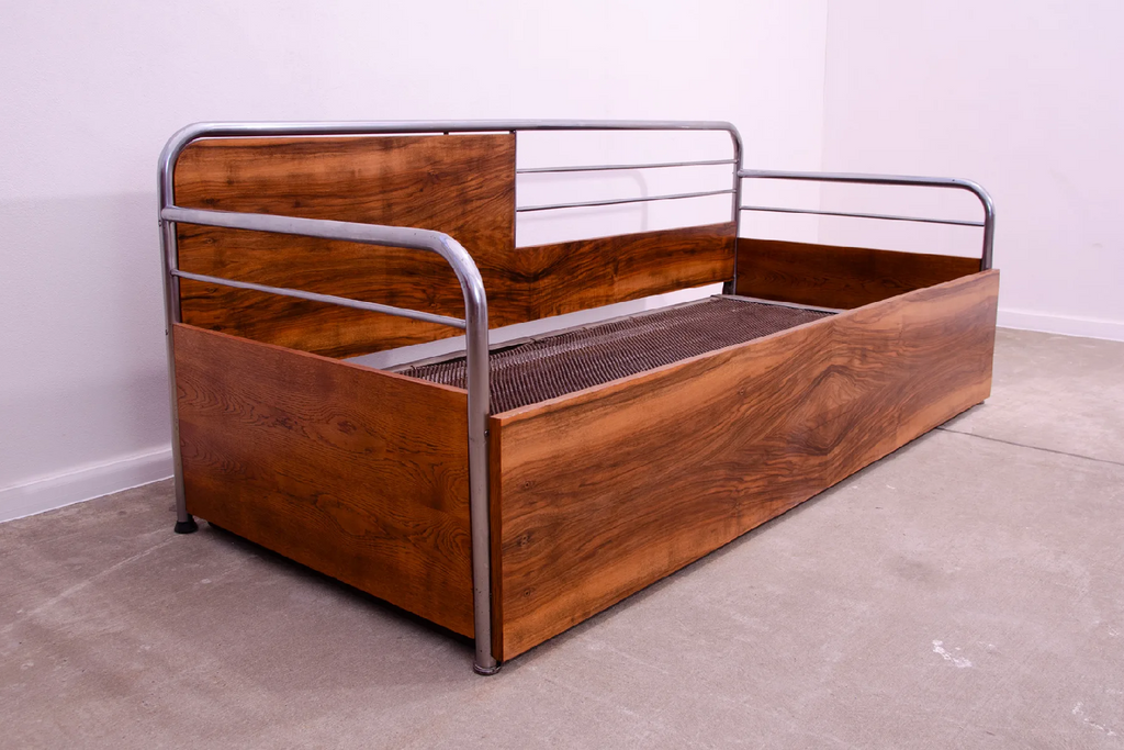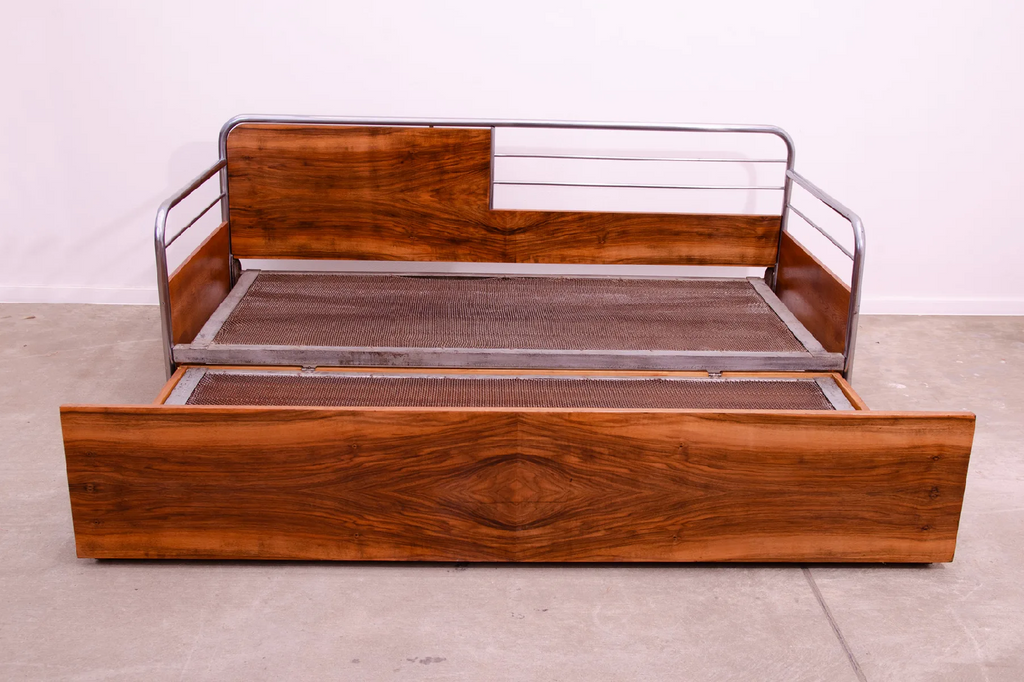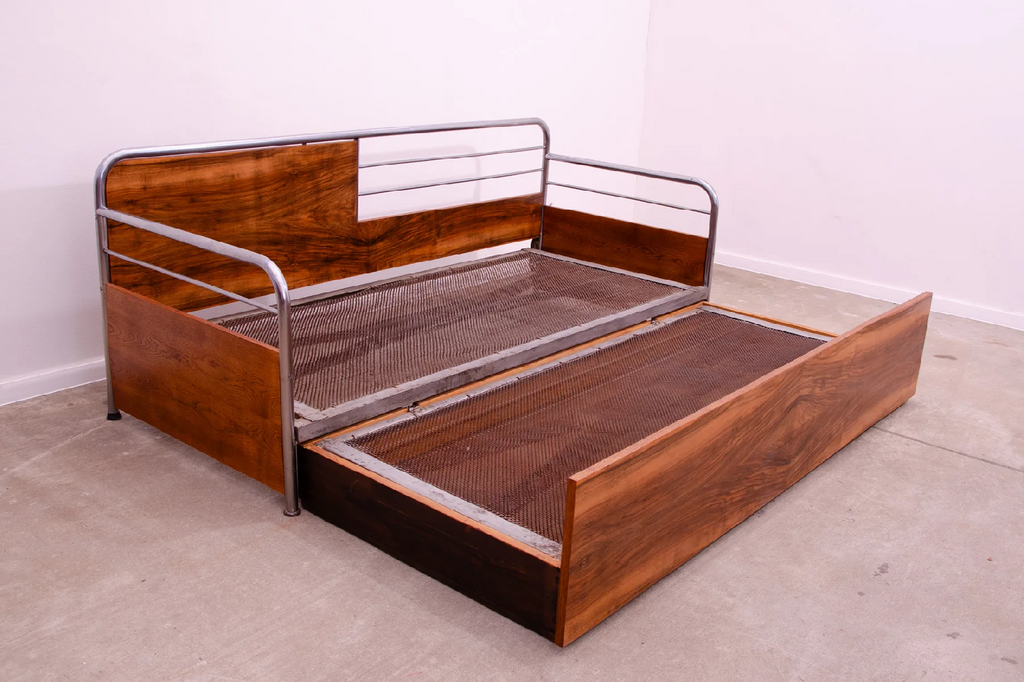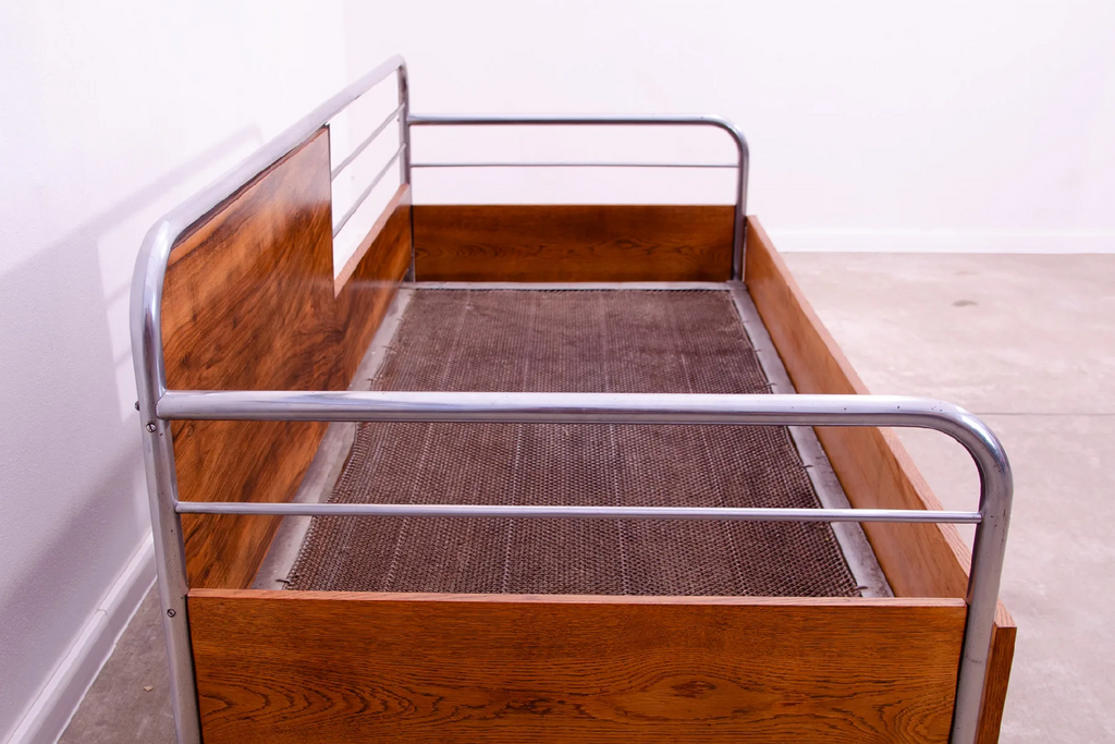 This sofa bed is among the relatively unusual preserved pieces on our market. It was made in the 1930s, probably in the former Czechoslovakia. It is made of wood and bent chrome tubes.