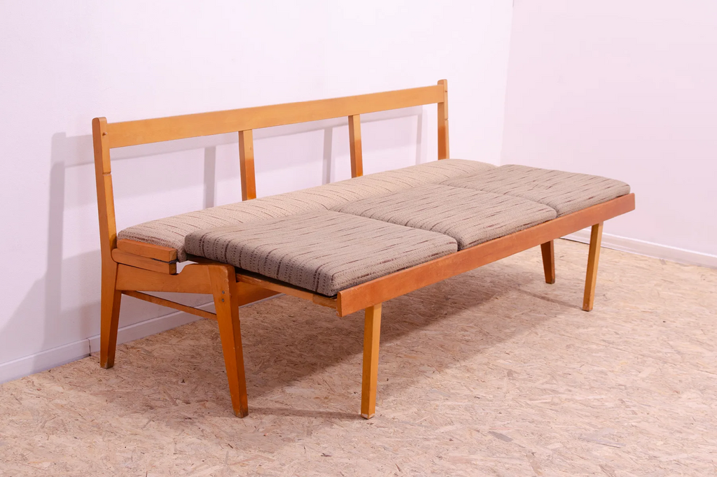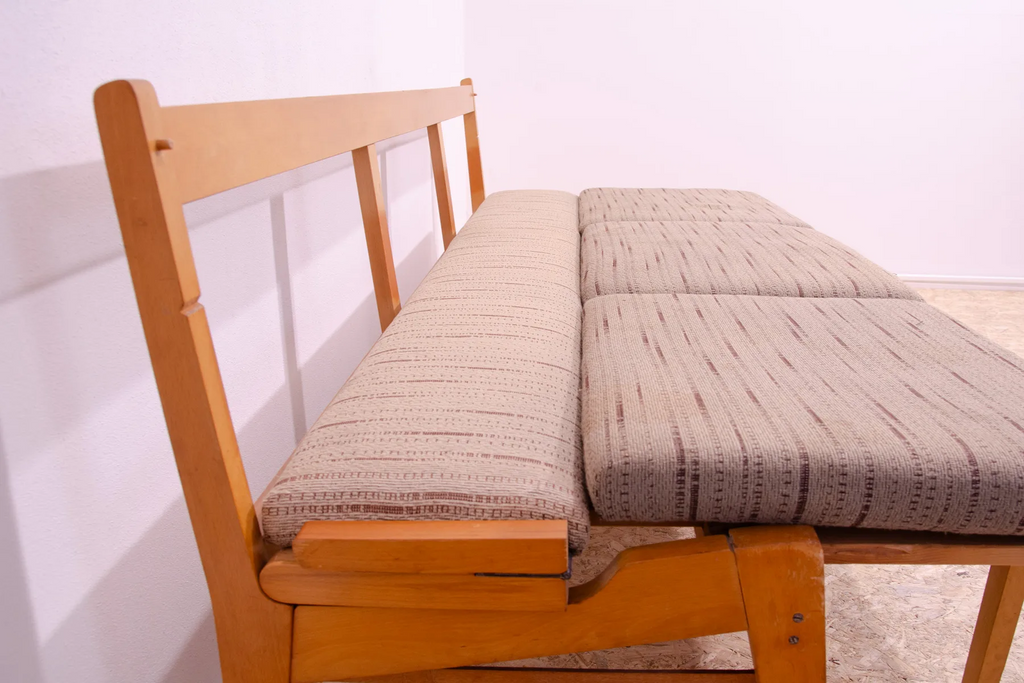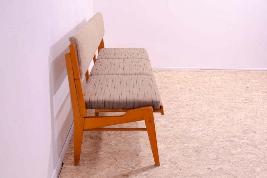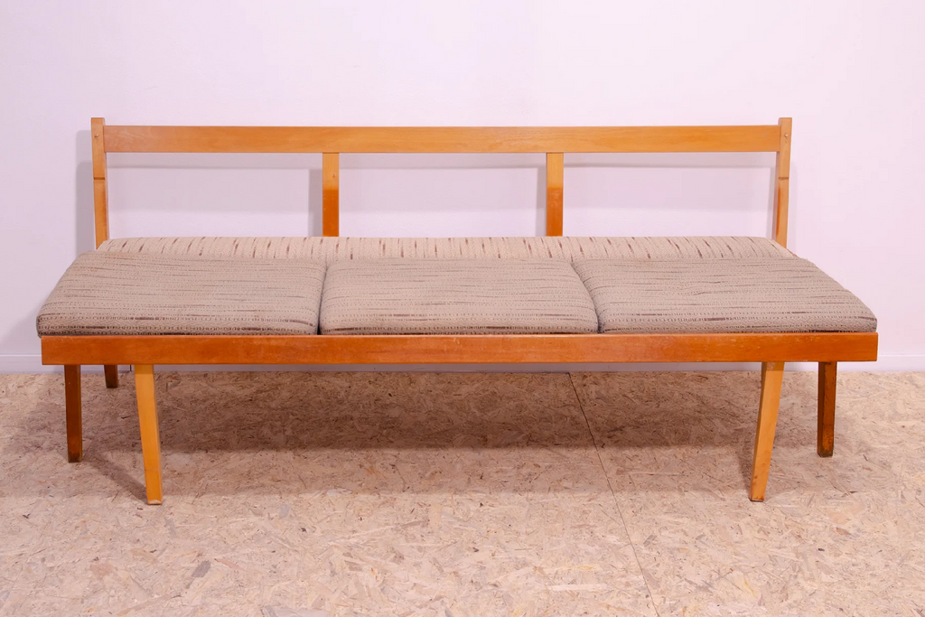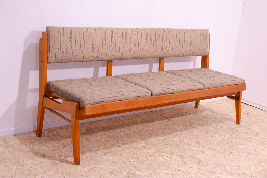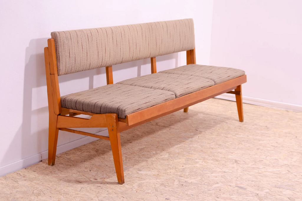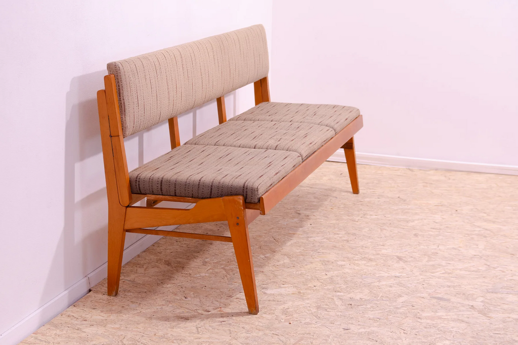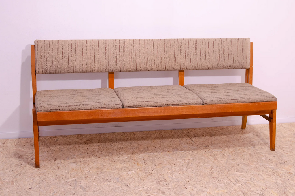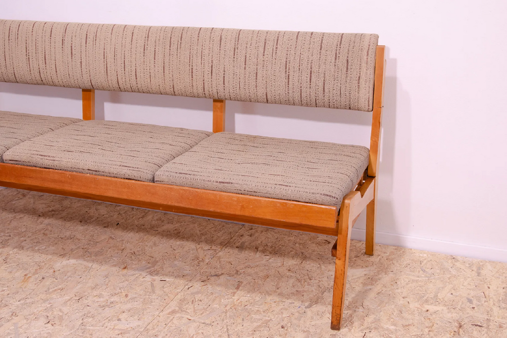 Very interesting mid century upholstered sofa/bench, made in the former Czechoslovakia in the 1960´s. Material: beech wood, fabric. The sofa is in very good Vintage condition.