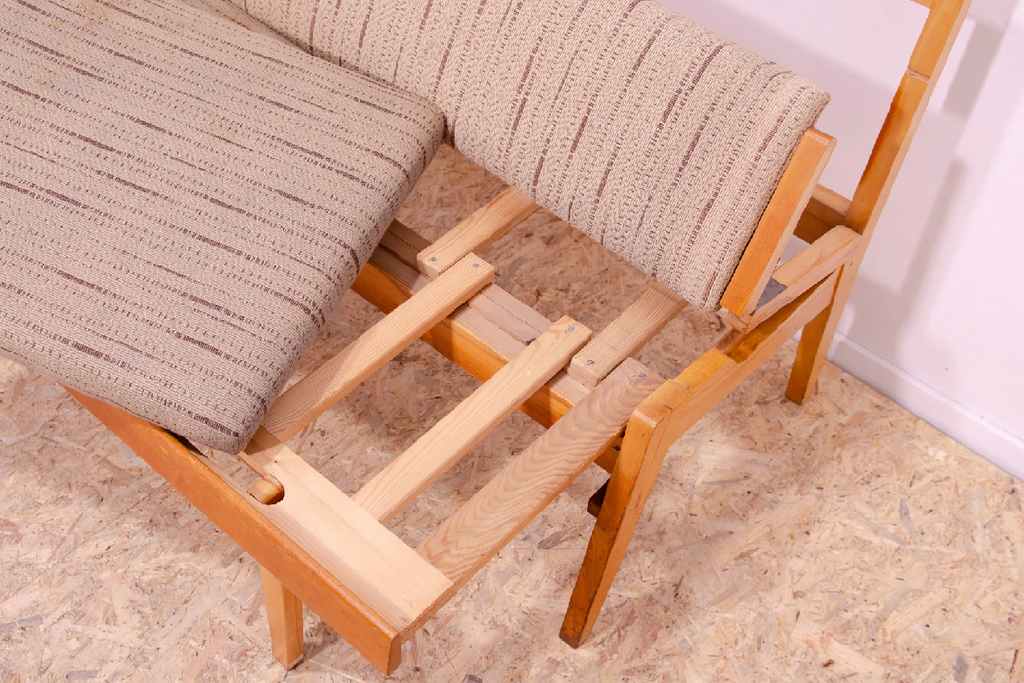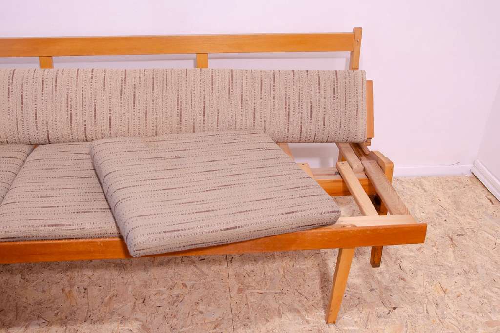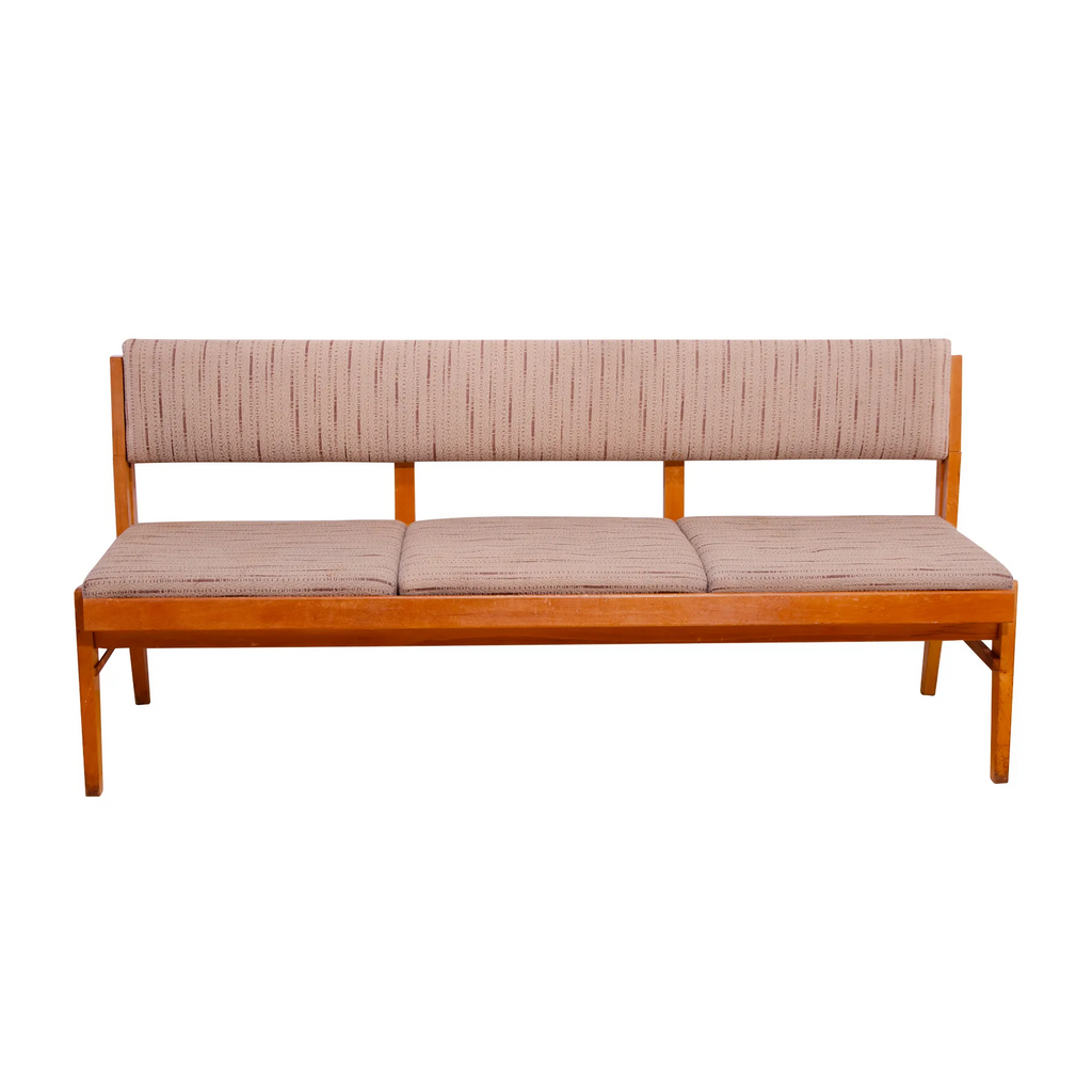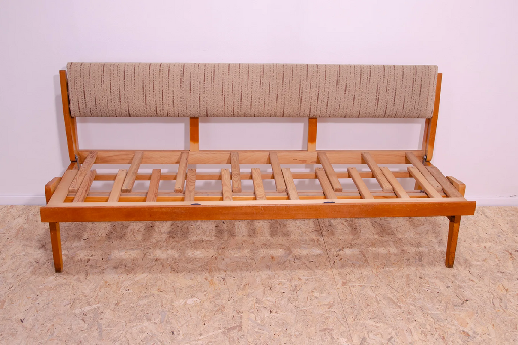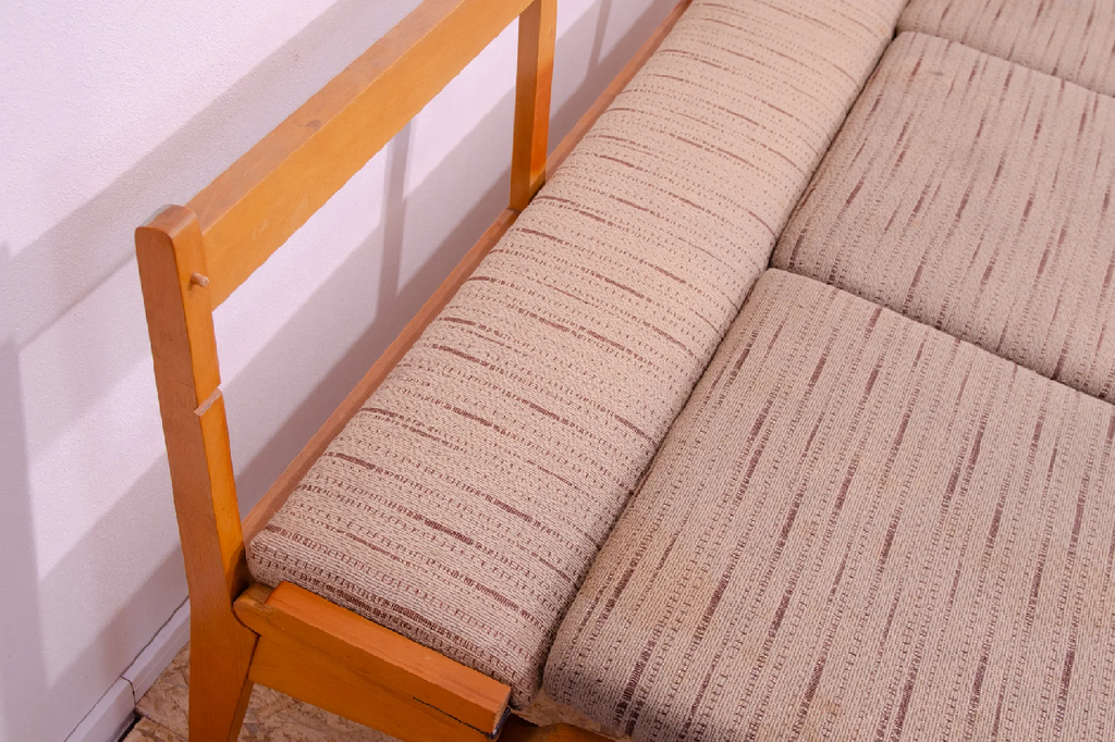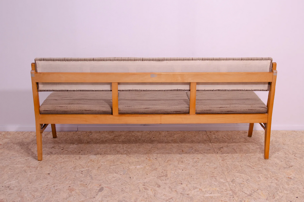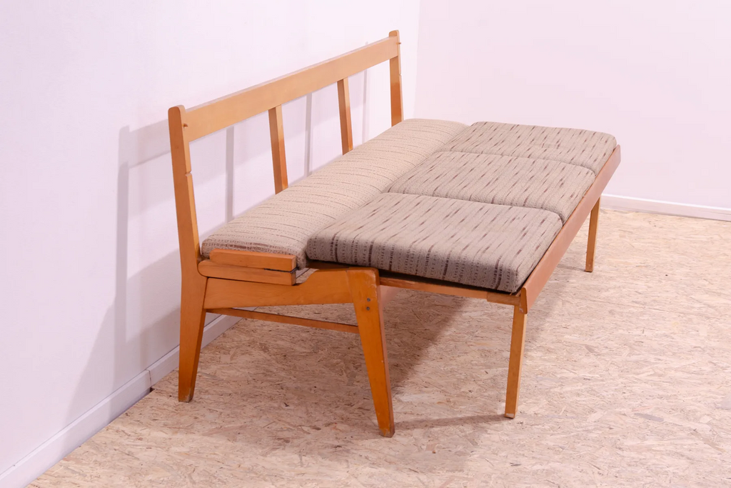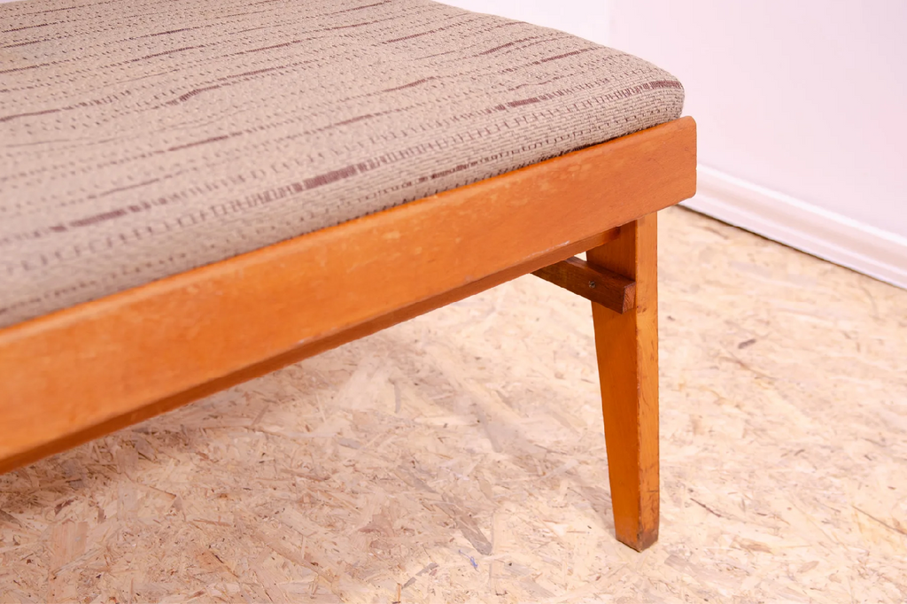 Very interesting mid century upholstered sofa/bench, made in the former Czechoslovakia in the 1960´s. Material: beech wood, fabric. The sofa is in very good Vintage condition.