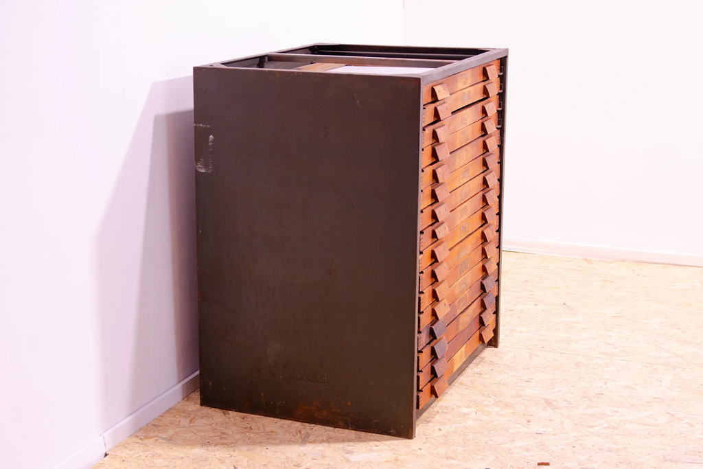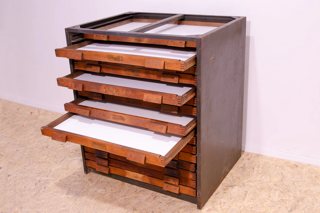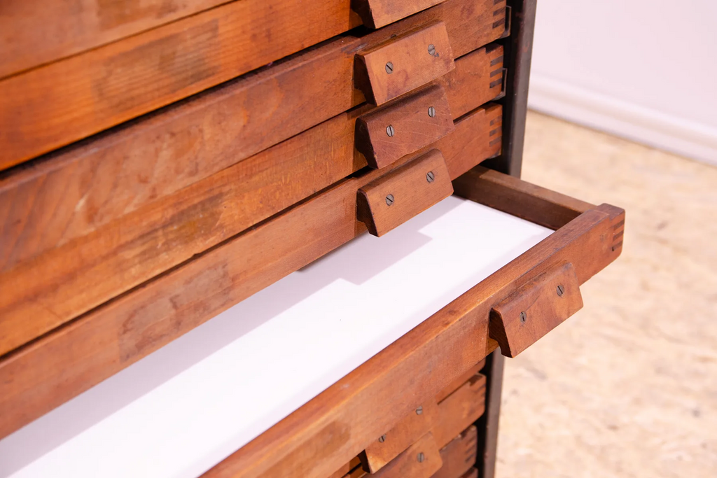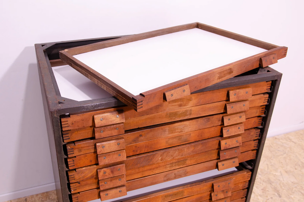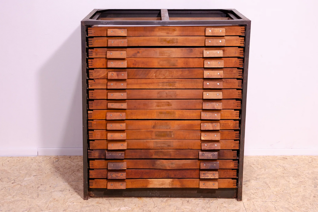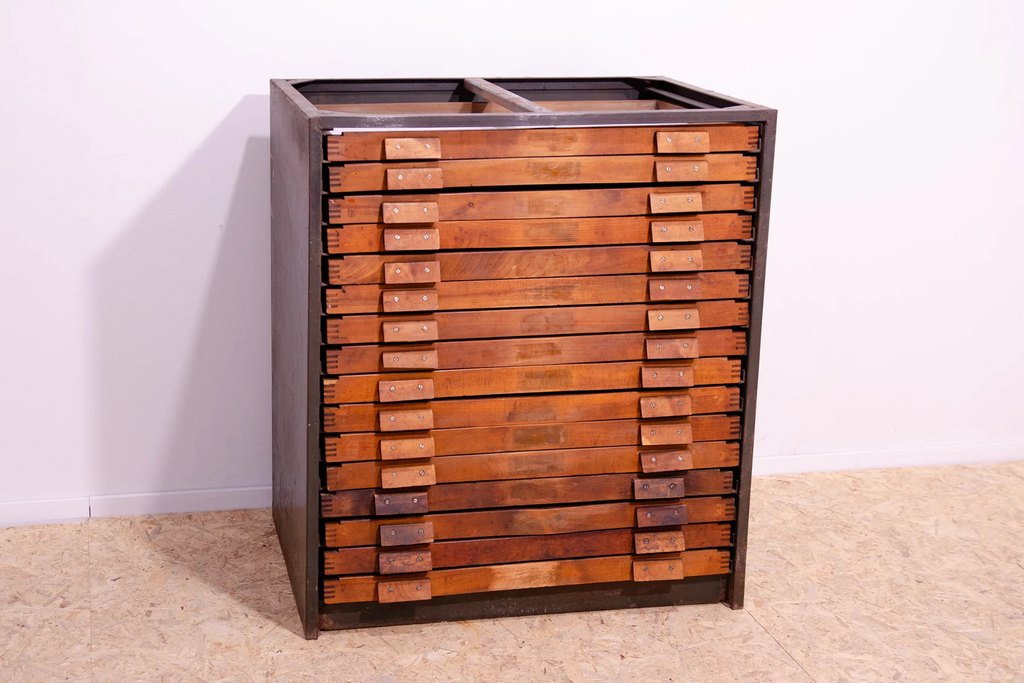 This chest can be used perfectly as a work cabinet for example for an architect, for a the drawings, or even for craftsmen.