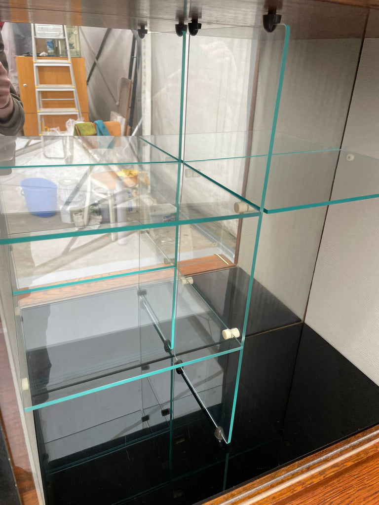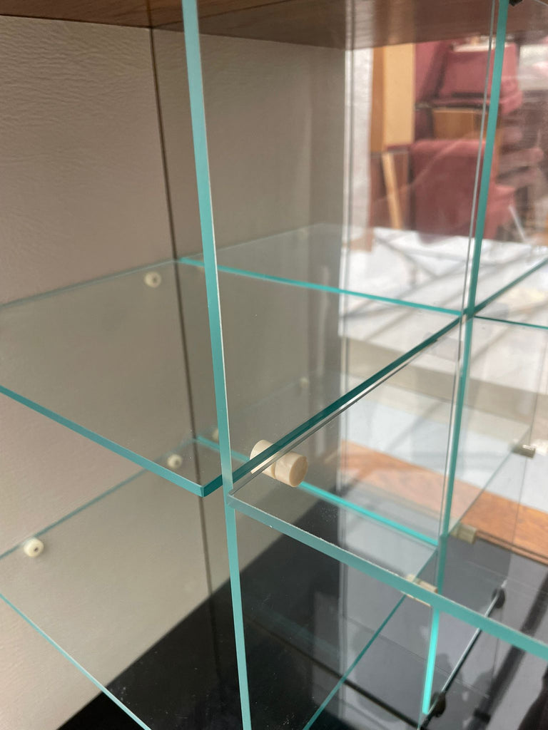 Condition: Original and very good with minor wear consistent with age. Small veneer damage and a chip in the black opaline glass. Light streaks visible on the patterned sliding door.
