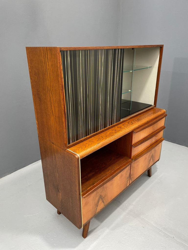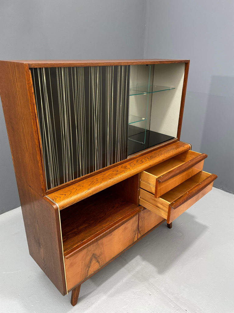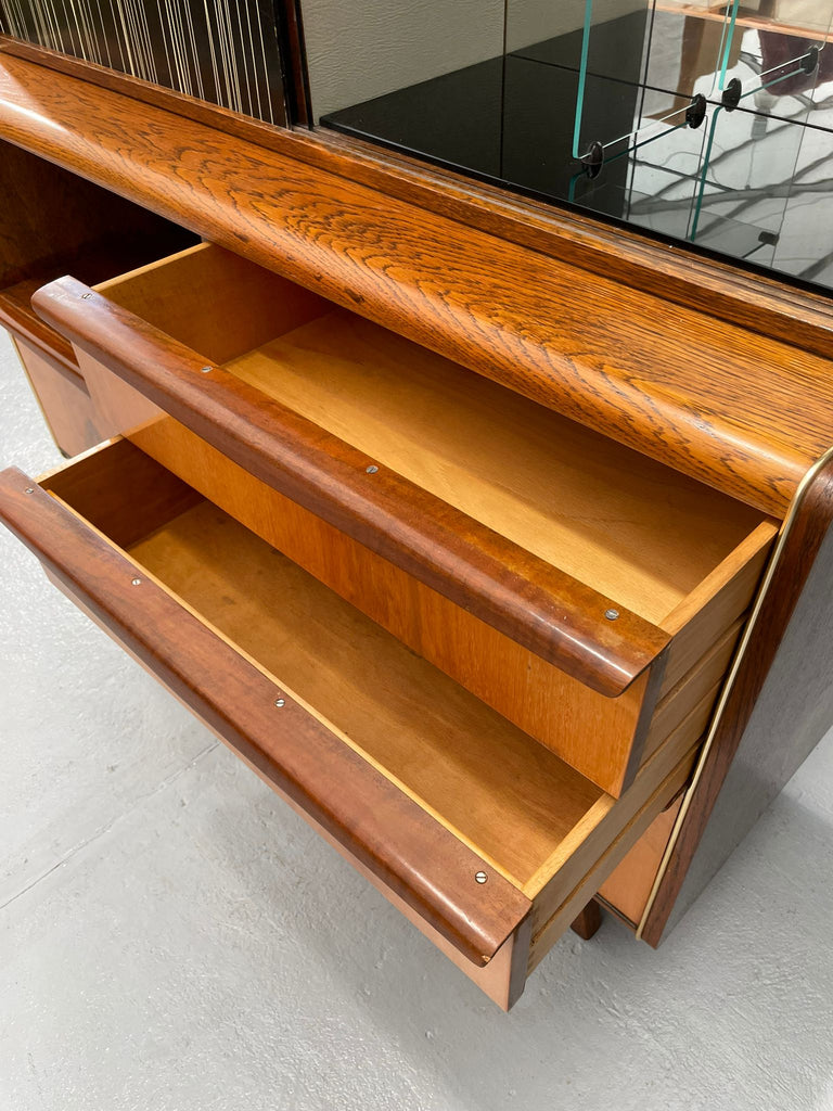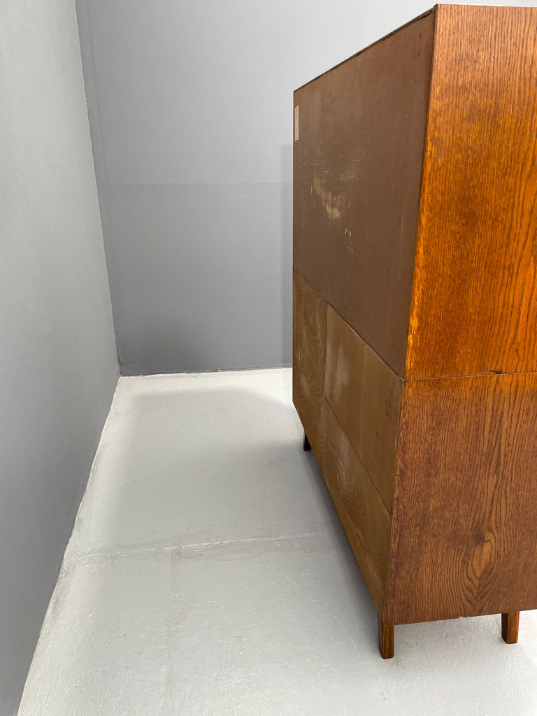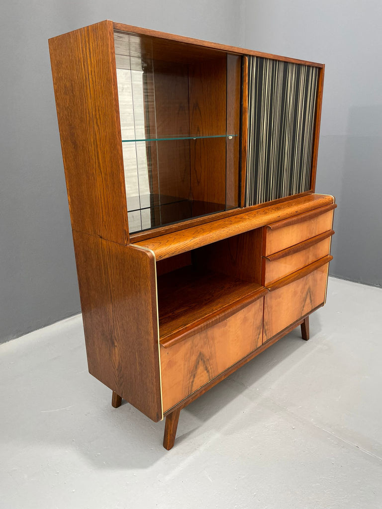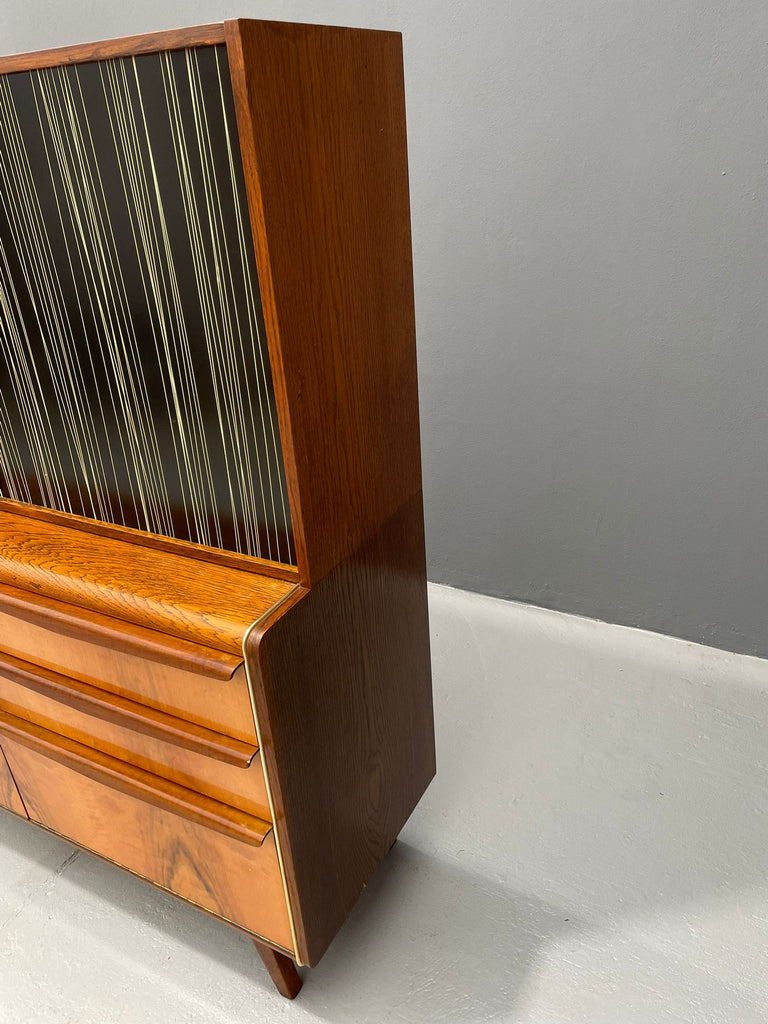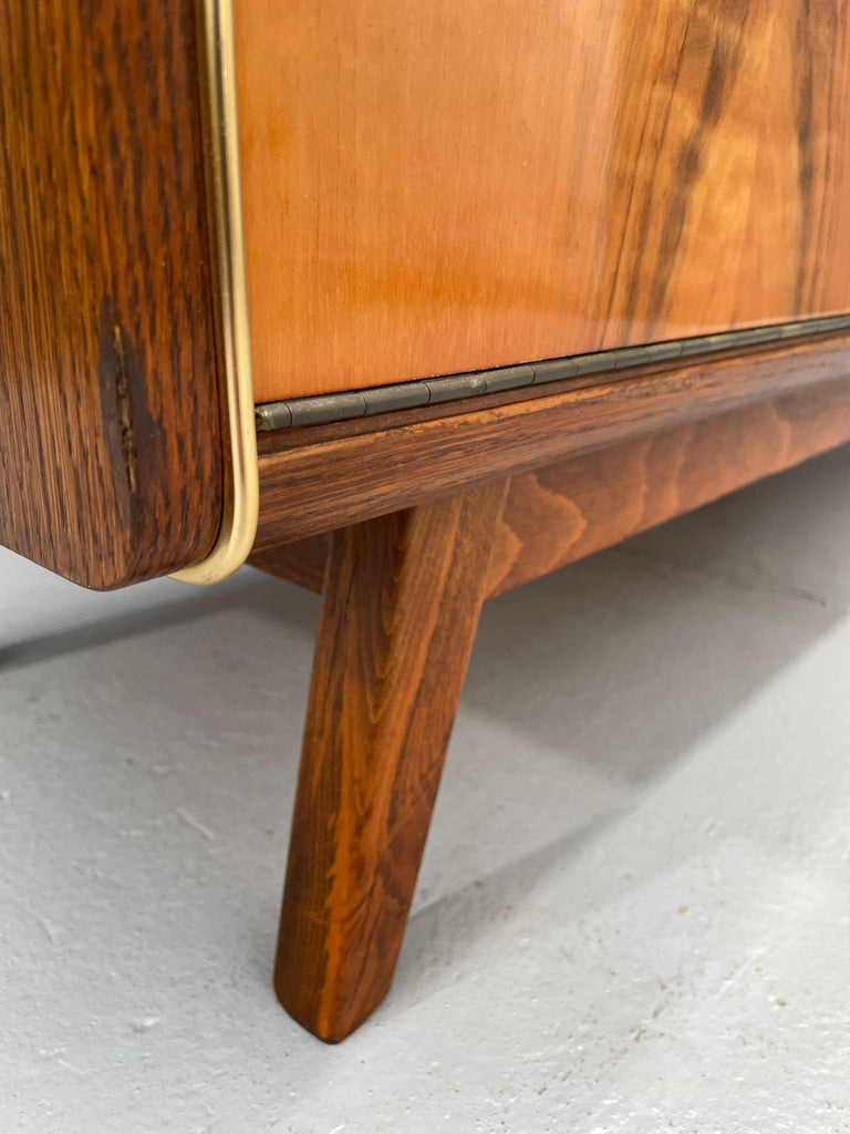 Crafted from oak and ash veneer with warm wood tones, this piece is accented with original brass trim and showcases the unique aesthetic of 1960s Czech design.
