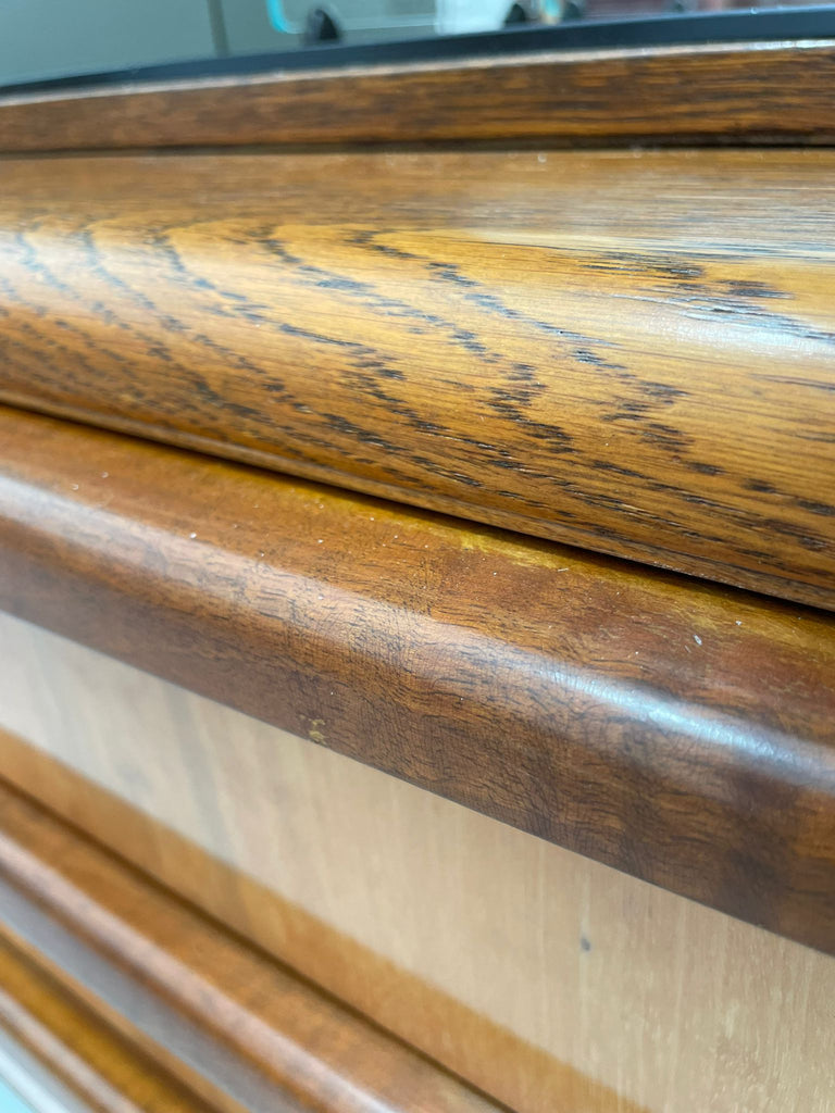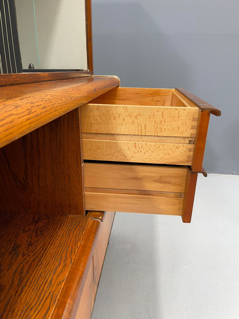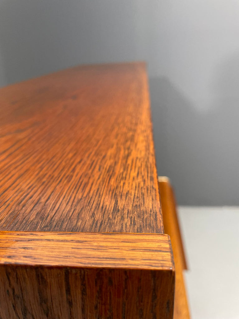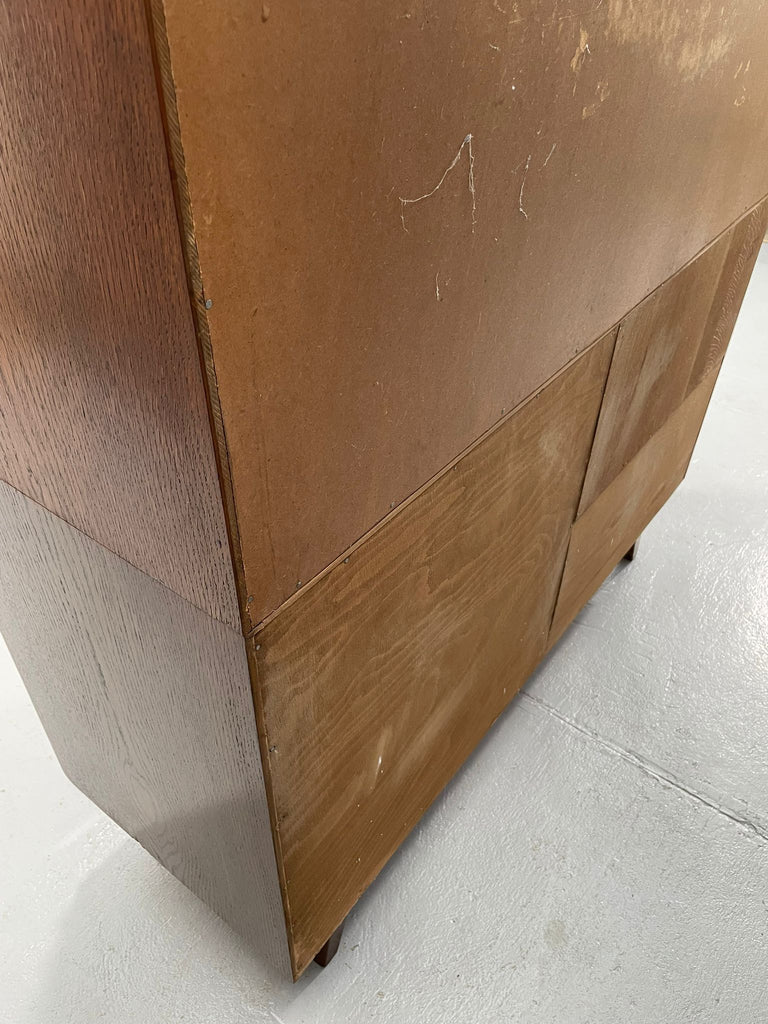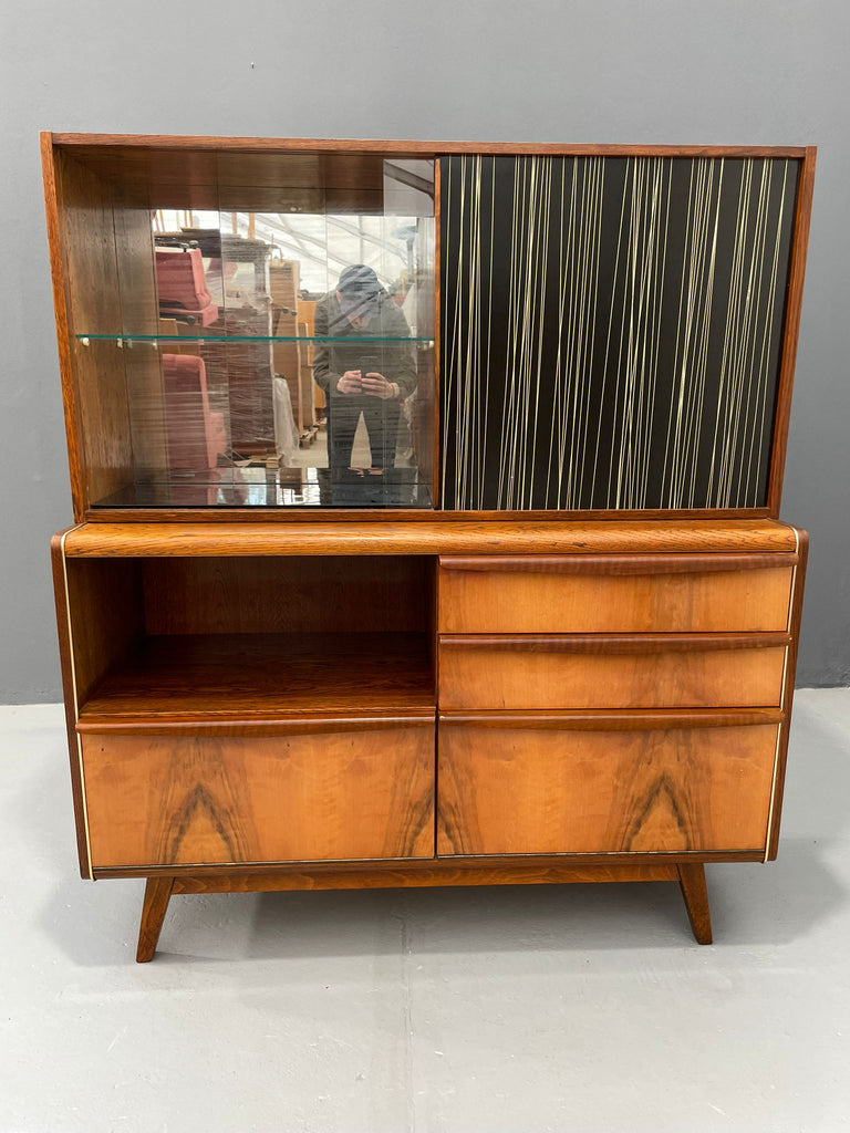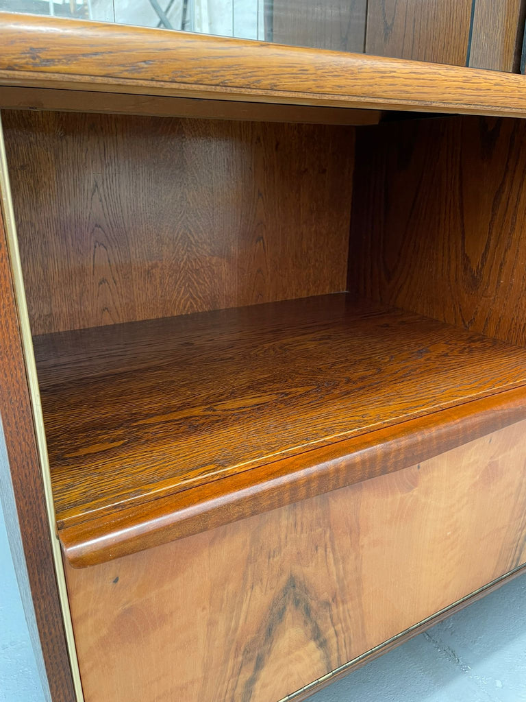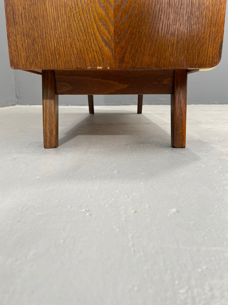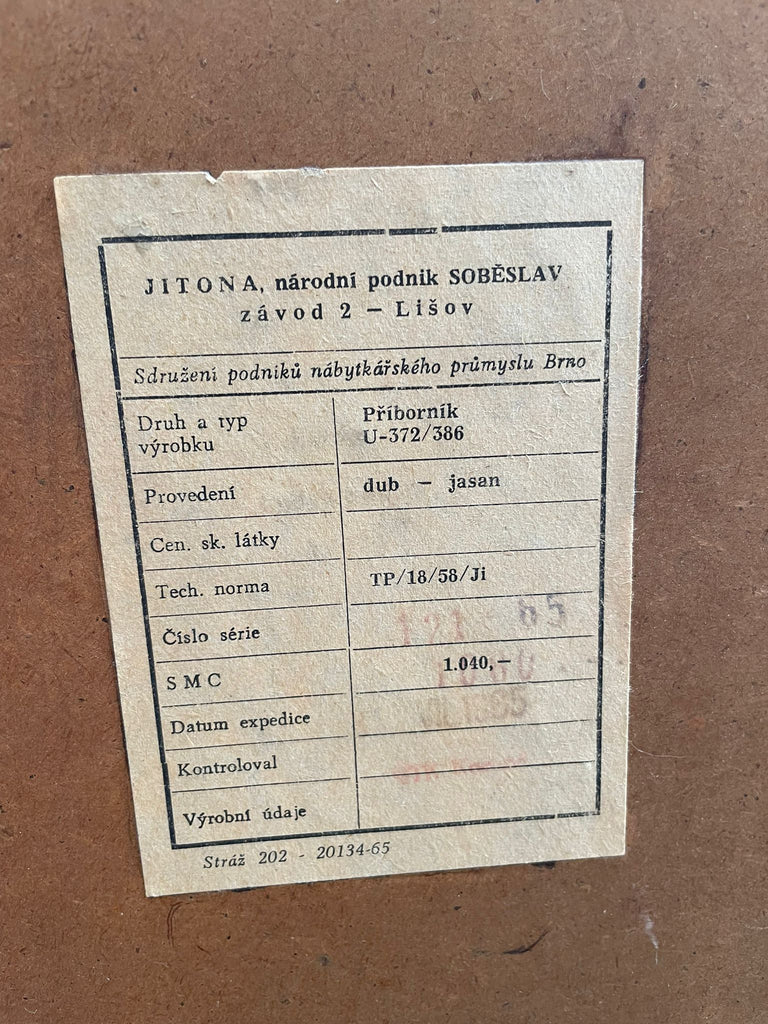 Crafted from oak and ash veneer with warm wood tones, this piece is accented with original brass trim and showcases the unique aesthetic of 1960s Czech design.