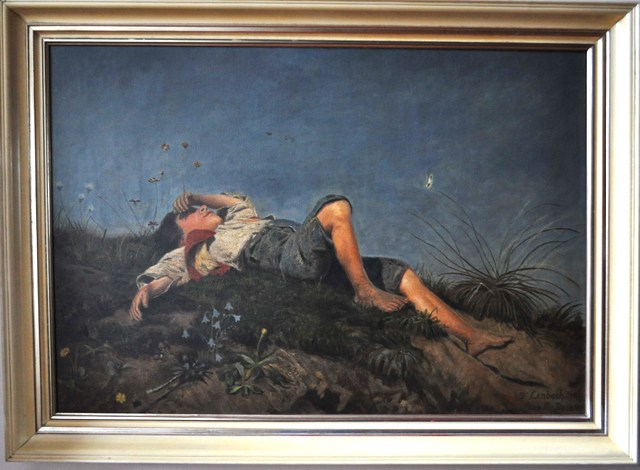Large oil on canvas, boy lying in a meadow, G.BECK, 1960