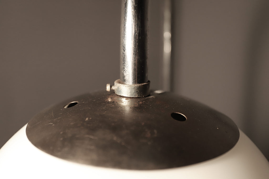 The rounded shape of the lamp is related to the Atomic Age, the period when round futuristic shapes entered applied art. When switched on, the lamp creates a pleasant diffused light. The lamp is fully functional, in good original condition, the chrome shows sign of age and using with a few chrome surface defects, but nothing significant.