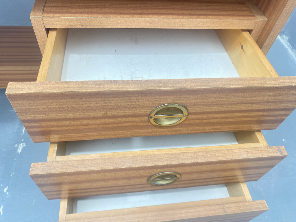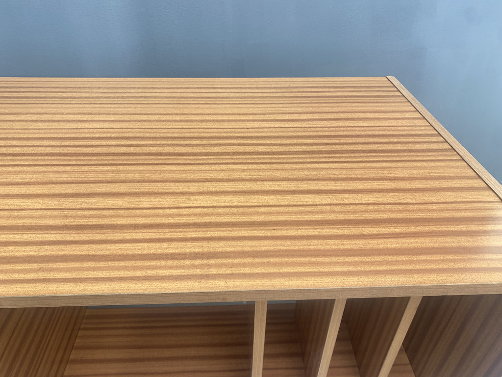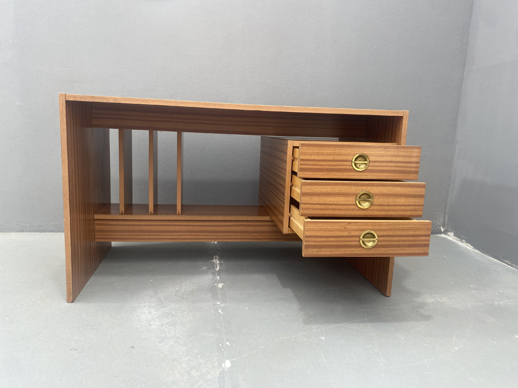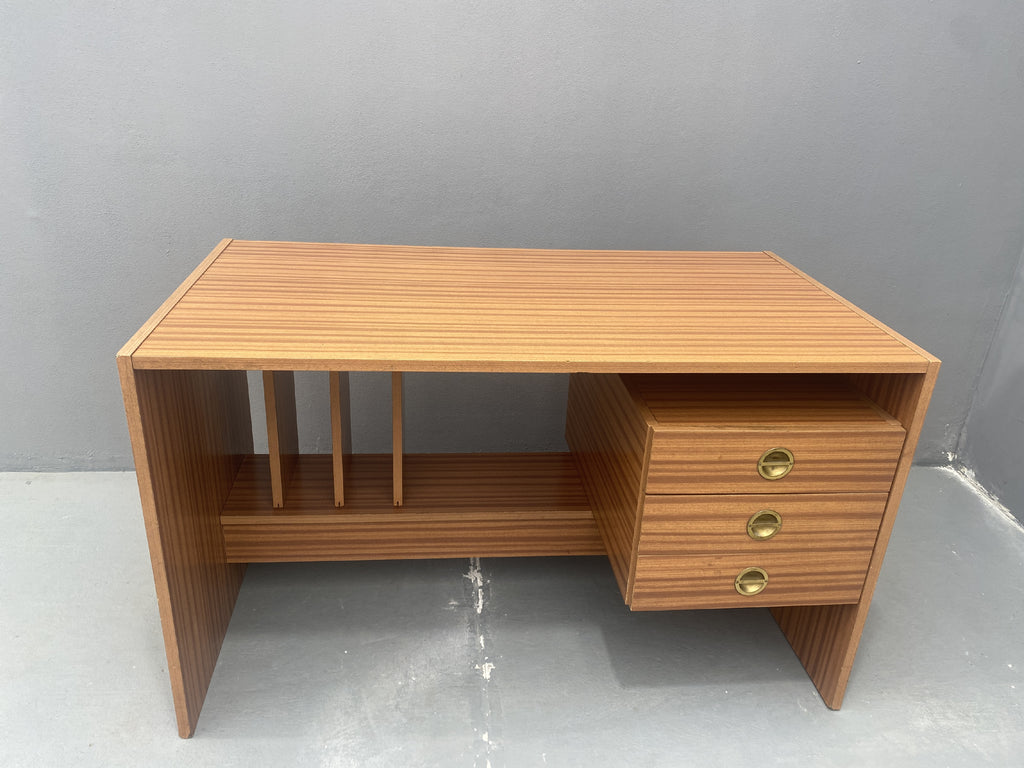 A desk from the 1980s with a minimalist and functional design. It is made of wood with a decorative veneer finish. The right side features three drawers with round brass handles, providing ample storage space. The left side includes vertical compartments for documents or folders.