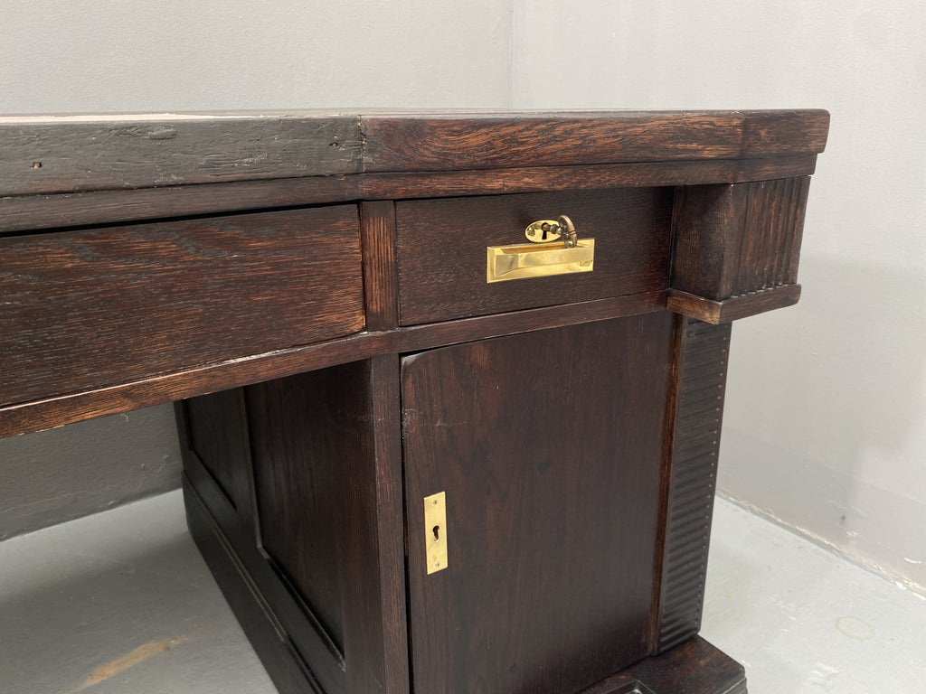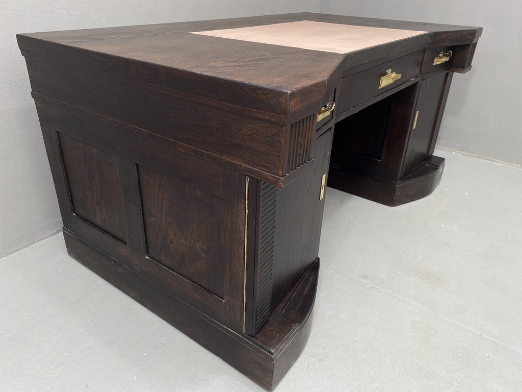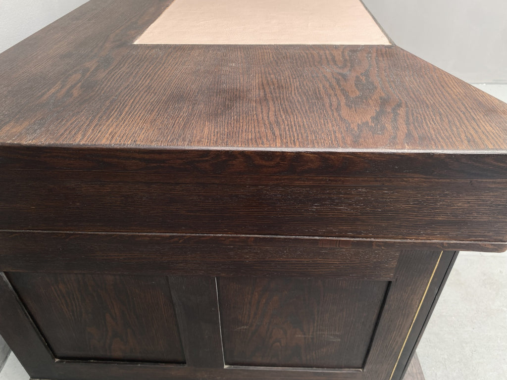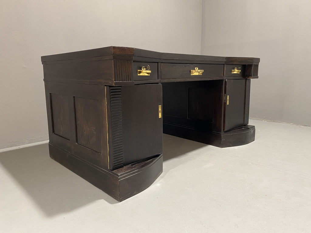 This luxurious and noble looking huge art nouveau desk was made around 1920 in Austria. It is made of oak wood, the table top is covered in beige genuine leather in the front part.