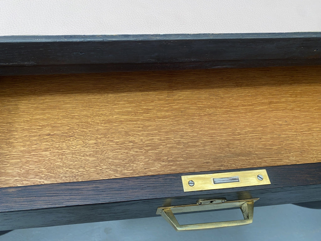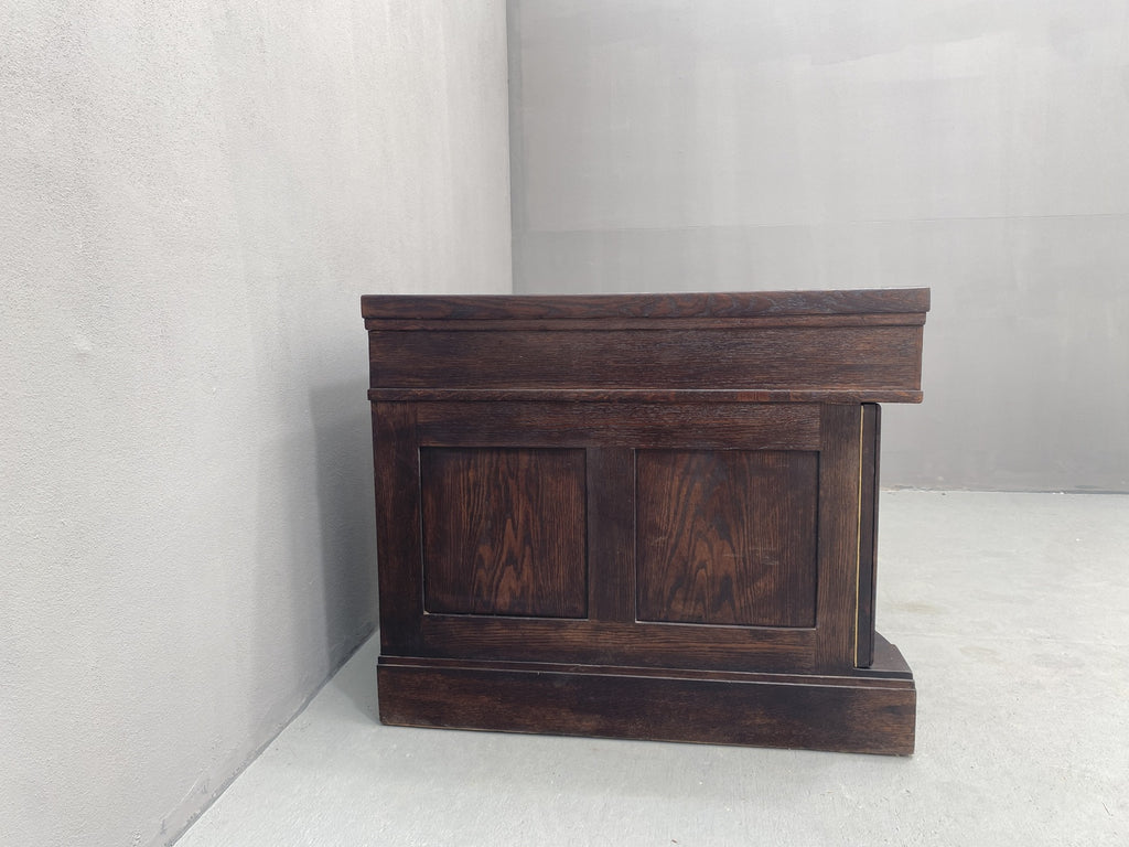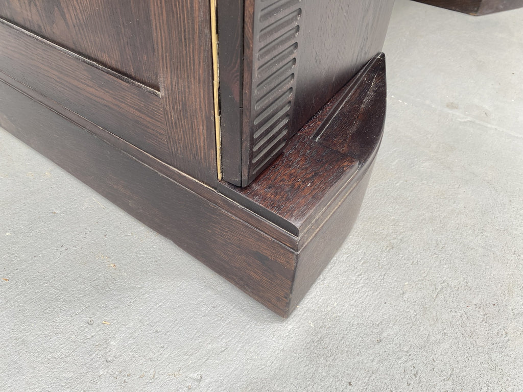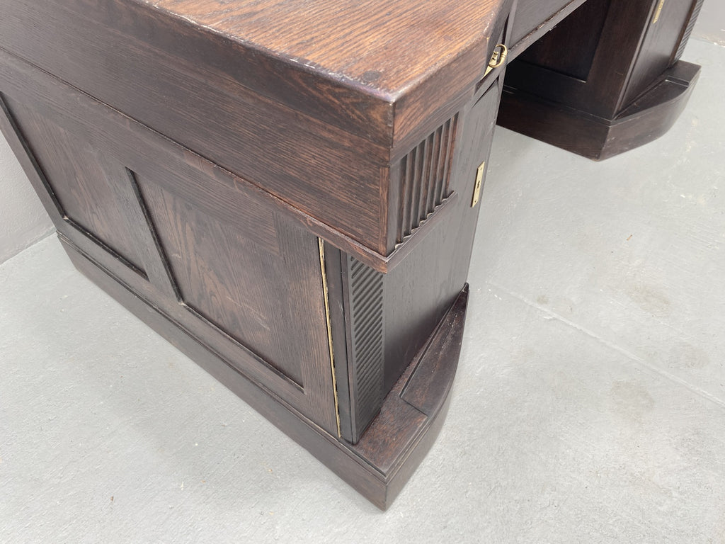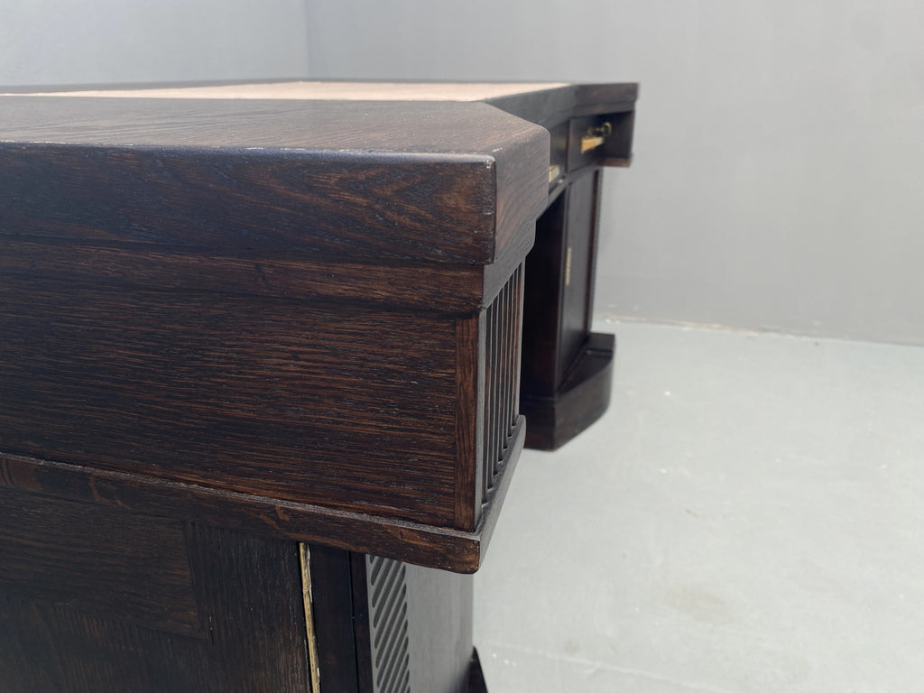 This luxurious and noble looking huge art nouveau desk was made around 1920 in Austria. It is made of oak wood, the table top is covered in beige genuine leather in the front part.